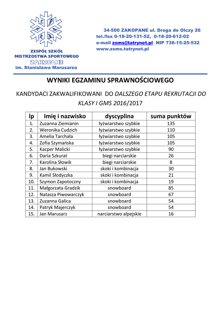 wyniki egzaminu sprawnościowego - SMS Zakopane
