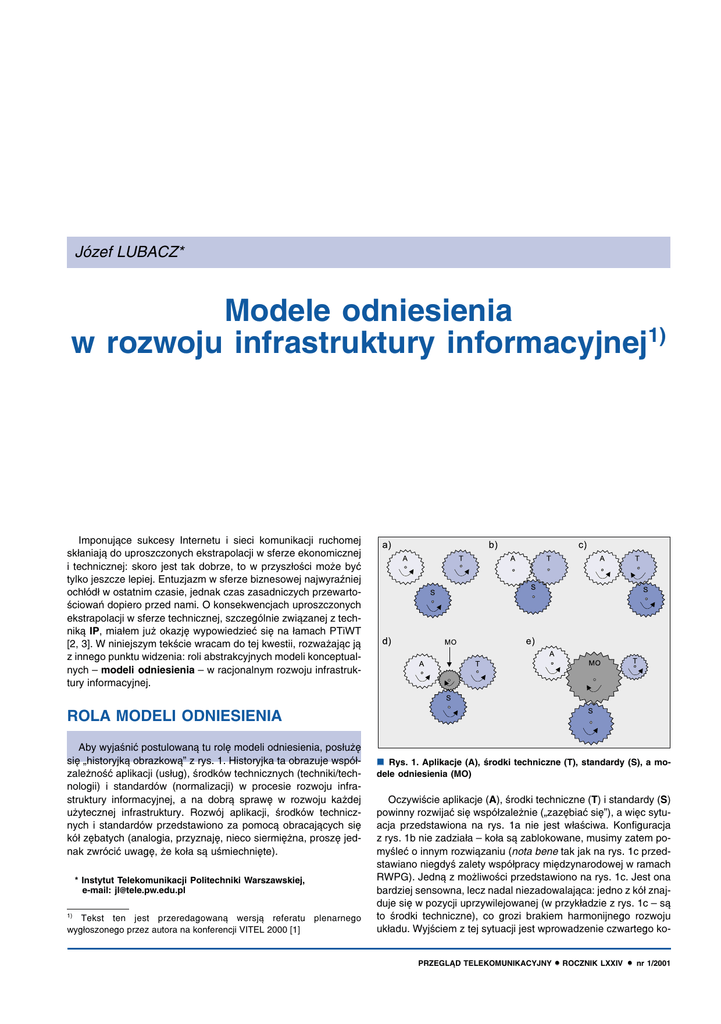 Józef LUBACZ* Modele odniesienia w rozwoju infrastruktury informacyjnej1) Imponuj¹ce sukcesy Internetu i sieci komunikacji ruchomej sk³aniaj¹ do uproszczonych ekstrapolacji w sferze ekonomicznej i technicznej: skoro jest tak dobrze, to w przysz³oœci mo¿e byæ tylko jeszcze lepiej. Entuzjazm w sferze biznesowej najwyraŸniej och³ód³ w ostatnim czasie, jednak czas zasadniczych przewartoœciowañ dopiero przed nami. O konsekwencjach uproszczonych ekstrapolacji w sferze technicznej, szczególnie zwi¹zanej z technik¹ IP, mia³em ju¿ okazjê wypowiedzieæ siê na ³amach PTiWT [2, 3]. W niniejszym tekœcie wracam do tej kwestii, rozwa¿aj¹c j¹ z innego punktu widzenia: roli abstrakcyjnych modeli konceptualnych – modeli odniesienia – w racjonalnym rozwoju infrastruktury informacyjnej. ROLA MODELI ODNIESIENIA Aby wyjaœniæ postulowan¹ tu rolê modeli odniesienia, pos³u¿ê siê „historyjk¹ obrazkow¹” z rys. 1. Historyjka ta obrazuje wspó³zale¿noœæ aplikacji (us³ug), œrodków technicznych (techniki/technologii) i standardów (normalizacji) w procesie rozwoju infrastruktury informacyjnej, a na dobr¹ sprawê w rozwoju ka¿dej u¿ytecznej infrastruktury. Rozwój aplikacji, œrodków technicznych i standardów przedstawiono za pomoc¹ obracaj¹cych siê kó³ zêbatych (analogia, przyznajê, nieco siermiê¿na, proszê jednak zwróciæ uwagê, ¿e ko³a s¹ uœmiechniête). * Instytut Telekomunikacji Politechniki Warszawskiej, e−mail: [email protected] 1) Tekst ten jest przeredagowan¹ wersj¹ referatu plenarnego wyg³oszonego przez autora na konferencji VITEL 2000 [1] O Rys. 1. Aplikacje (A), środki techniczne (T), standardy (S), a mo− dele odniesienia (MO) Oczywiœcie aplikacje (A), œrodki techniczne (T) i standardy (S) powinny rozwijaæ siê wspó³zale¿nie („zazêbiaæ siê”), a wiêc sytuacja przedstawiona na rys. 1a nie jest w³aœciwa. Konfiguracja z rys. 1b nie zadzia³a – ko³a s¹ zablokowane, musimy zatem pomyœleæ o innym rozwi¹zaniu (nota bene tak jak na rys. 1c przedstawiano niegdyœ zalety wspó³pracy miêdzynarodowej w ramach RWPG). Jedn¹ z mo¿liwoœci przedstawiono na rys. 1c. Jest ona bardziej sensowna, lecz nadal niezadowalaj¹ca: jedno z kó³ znajduje siê w pozycji uprzywilejowanej (w przyk³adzie z rys. 1c – s¹ to œrodki techniczne), co grozi brakiem harmonijnego rozwoju uk³adu. Wyjœciem z tej sytuacji jest wprowadzenie czwartego koPRZEGLĄD TELEKOMUNIKACYJNY ! ROCZNIK LXXIV ! nr 1/2001 ³a, w uk³adzie jak na rys. 1d. Ko³o to, sprzêgniête z trzema pozosta³ymi, symbolizuje modele konceptualne – modele odniesienia. Ko³o modeli odniesienia zapewnia zarówno wzajemn¹ harmonizacjê, jak i wirtualn¹ niezale¿noœæ trzech pozosta³ych kó³. Uk³ad z rys. 1d pozostaje jednak nadal nierealistyczny, a to dlatego, ¿e ko³o modeli odniesienia musi obracaæ siê szybciej ni¿ pozosta³e trzy, te zaœ maj¹ jednakow¹ prêdkoœæ obrotow¹. Bardziej realistyczna jest konfiguracja z rys. 1e: wszystkie ko³a s¹ sprzê¿one, ka¿de obraca siê z inn¹ prêdkoœci¹ (ró¿ne tempo rozwoju aplikacji, œrodków technicznych i standardów), ko³o modeli odniesienia obraca siê najwolniej (modele konceptualne nie mog¹ zmieniaæ siê zbyt szybko, jeœli maj¹ byæ stabilizuj¹cym elementem uk³adu). Istotê roli modeli odniesienia – „czwartego ko³a” – chyba naj³atwiej wyjaœniæ odwo³uj¹c siê do roli, jak¹ odegra³ model odniesienia OSI (Open System Interconnection Reference Model – OSI RM). Zanim powsta³ model odniesienia OSI, trudno by³o sobie wyobraziæ, ¿e mo¿na wprowadziæ porz¹dkuj¹ce zasady architektoniczne do starej (maj¹cej tysi¹ce lat!) sztuki tworzenia protoko³ów komunikacyjnych – funkcjonalnoœæ komunikacyjna wydawa³a siê trudna do usystematyzowania. Idee, które leg³y u podstaw modelu OSI, by³y pocz¹tkowo doœæ trudne do przyjêcia: wydawa³y siê zbyt abstrakcyjne, arbitralne i ogólnikowe. Minê³o sporo czasu, nim wesz³y one do codziennej praktyki in¿ynierskiej, nim sta³y siê czymœ „naturalnym”. Z dzisiejszej perspektywy jest ju¿ jasne, ¿e rola modelu odniesienia OSI w porz¹dkowaniu coraz bogatszej i bardziej z³o¿onej funkcjonalnie sfery protoko³ów komunikacyjnych jest trudna do przecenienia. Trudno nawet wyobraziæ sobie rozwój infrastruktury telekomunikacyjnej bez tego modelu. Opis wprowadzaj¹cy model odniesienia OSI by³ zwiêz³y i ogólny, ustanawia³ jedynie architektoniczne zasady konstruowania i dekompozycji protoko³ów w siedmiowarstwowej strukturze hierarchicznej. Nie dotyczy³ ¿adnych konkretnych protoko³ów komunikacyjnych, nie to bowiem by³o jego celem. Wype³nienie modelu treœci¹ aplikacyjn¹ – tworzenie stosów protoko³ów, konkretnych standardów – nadesz³o póŸniej. Podkreœlmy: rola modelu odniesienia i rola standardów zosta³y wyraŸnie oddzielone (por. rys. 1). Pomimo wielkiej roli, jak¹ odegra³, model odniesienia OSI by³, i nadal jest, doœæ czêsto krytykowany. Najbardziej radykalni twierdz¹ wrêcz, ¿e „OSI jest martwy”. Krytyka opiera siê zazwyczaj na nastêpuj¹cym rozumowaniu: stworzyliœmy u¿yteczny protokó³, który nie daje siê dobrze „wpasowaæ” w warstwy modelu OSI, a wiêc model jest nieadekwatny. Rozumowanie tego typu œwiadczy o braku zrozumienia istoty i roli modelu odniesienia jako takiego. Model odniesienia OSI przetrwa³, pomimo wielkiej liczby protoko³ów komunikacyjnych stworzonych w ostatnich dekadach, a zatem licznych okazji do weryfikowania jego przydatnoœci. Nie zaproponowano dotychczas niczego lepszego. Uzasadnione jest wiêc podejrzenie, ¿e jest coœ g³êbokiego i fundamentalnego w zasadach architektonicznych przyjêtych w modelu OSI – w sposobie modelowania z³o¿onych systemów jako u³o¿onych hierarchicznie warstw, odpowiadaj¹cych ró¿nym cechom funkcjonalnym systemu. Co wiêcej, mo¿na zgadywaæ, ¿e przyjête w OSI RM zasady dekompozycji opisu z³o¿onych systemów pozo