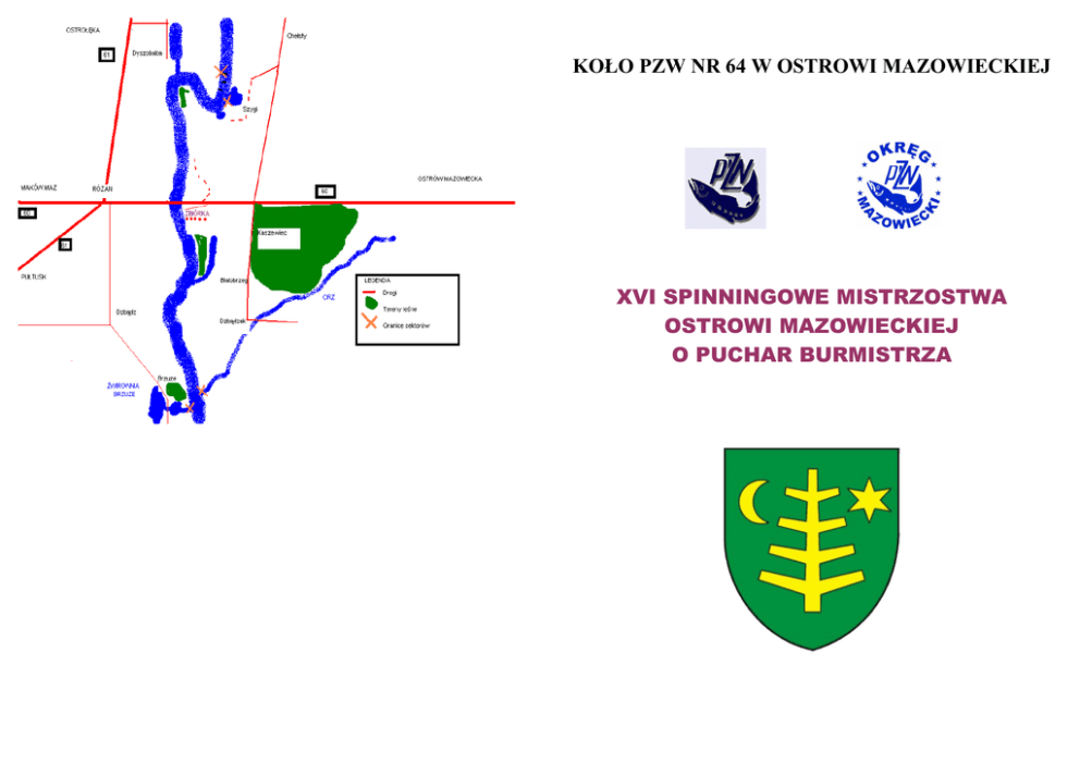 KOŁO PZW NR 64 W OSTROWI MAZOWIECKIEJ XVI SPINNINGOWE MISTRZOSTWA OSTROWI MAZOWIECKIEJ O PUCHAR BURMISTRZA 1.ORGANIZATORZY: - Koło PZW Nr 41 w Ostrowi Mazowieckiej 2.MIEJSCE I TERMIN - Zawody odbędą się 10 lipca 2016 r. na rzece Narew, w okolicy miasta Różan - W załączeniu mapka z drogami dojazdowymi, miejscem zbiórki, oraz planowanym zasięgiem łowiska. 3.CHARAKTERYSTYKA I ZASIĘG ŁOWISKA - Brzeg płaski - Głębokość 1,5-3 m - Dominujące gatunki: szczupak, boleń, okoń, kleń - Prawy brzeg ograniczony w górze Narwi do ujścia starorzecza Sieluńskiego ok.300m. za przekaźnikiem, a z biegiem rzeki ujściem kanału do żwirowni Brzuze - Lewy brzeg w górze rzeki ograniczony do ujścia starorzecza ok.500 m. powyżej przekaźnika, zaś w dole rzeki ograniczony ujściem rzeki Orz 4. ZASADY UDZIAŁU - Zapraszamy wszystkich posiadających kartę wędkarską. - Zgłoszenia przyjmuje osobiście, lub telefonicznie Skarbnik Koła Nr 64 Włodzimierz Kamieniecki tel.029 74 516 83. - Po potwierdzeniu przyjęcia należy, w jak najszybszym czasie dokonać wpłaty wpisowego w wysokości 50,-zł osobiście, lub przelewem na konto. - Ostateczny termin zapisów - 4 dni przed dniem zawodów. 5. ZASADY ORGANIZACJI - Zawody odbędą się w jednej 7 godzinnej turze zgodnie z „Regulaminem Amatorskiego Połowu Ryb” oraz ustaleniami organizatora. Wymiar ochronny okonia do 20 cm. 6.NAGRODY - Puchar Burmistrza Ostrowi Mazowieckiej - Nagrody rzeczowe za sześć czołowych miejsc - Nagrody niespodzianki 7.PROGRAM ZAWODÓW - 6.30 – 6.50 Zbiórka i rejestracja zawodników - 6.50 - 7.00 Ceremonia otwarcia i odprawa sędziowska - 7.00-14.00 Zawody - 14.00-14.30 Powrót z łowiska, zdanie kart startowych - 14.00-15.00 Posiłek - 15.00-16.00 Ogłoszenie wyników i wręczenie nagród 8. UWAGI - Zawody na żywej rybie – obowiązek posiadania siatki wędkarskiej - W przypadku niestawienia się zawodnika opłata startowa nie będzie zwracana - Dopuszcza się brodzenie w woderach - Obowiązuje zakaz używania spodniobutów - Zbiórka zawodników na lewym brzegu rzeki w okolicy mostu 9. INNE IMPREZY ORGANIZOWANE PRZEZ KOŁO 41 -11.09.2016 r. „ MAZOWIECKI SPINNING BUGU”