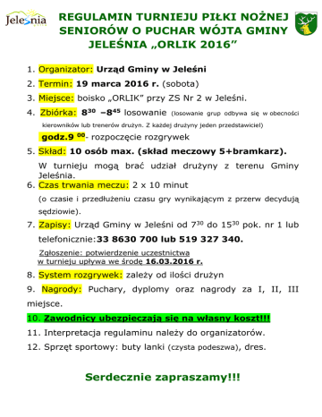 REGULAMIN TURNIEJU PIŁKI NOŻNEJ SENIORÓW O PUCHAR WÓJTA GMINY JELEŚNIA „ORLIK 2016” 1. Organizator: Urząd Gminy w Jeleśni 2. Termin: 19 marca 2016 r. (sobota) 3. Miejsce: boisko „ORLIK” przy ZS Nr 2 w Jeleśni. 4. Zbiórka: 830 –845 losowanie (losowanie grup odbywa się w obecności kierowników lub trenerów drużyn. Z każdej drużyny jeden przedstawiciel) godz.9 00 - rozpoczęcie rozgrywek 5. Skład: 10 osób max. (skład meczowy 5+bramkarz). W turnieju mogą brać udział drużyny z terenu Gminy Jeleśnia. 6. Czas trwania meczu: 2 x 10 minut (o czasie i przedłużeniu czasu gry wynikającym z przerw decydują sędziowie). 7. Zapisy: Urząd Gminy w Jeleśni od 730 do 1530 pok. nr 1 lub telefonicznie:33 8630 700 lub 519 327 340. Zgłoszenie: potwierdzenie uczestnictwa w turnieju upływa we środę 16.03.2016 r. 8. System rozgrywek: zależy od ilości drużyn 9. Nagrody: Puchary, dyplomy oraz nagrody za I, II, III miejsce. 10. Zawodnicy ubezpieczają się na własny koszt!!! 11. Interpretacja regulaminu należy do organizatorów. 12. Sprzęt sportowy: buty lanki (czysta podeszwa), dres. Serdecznie zapraszamy!!!