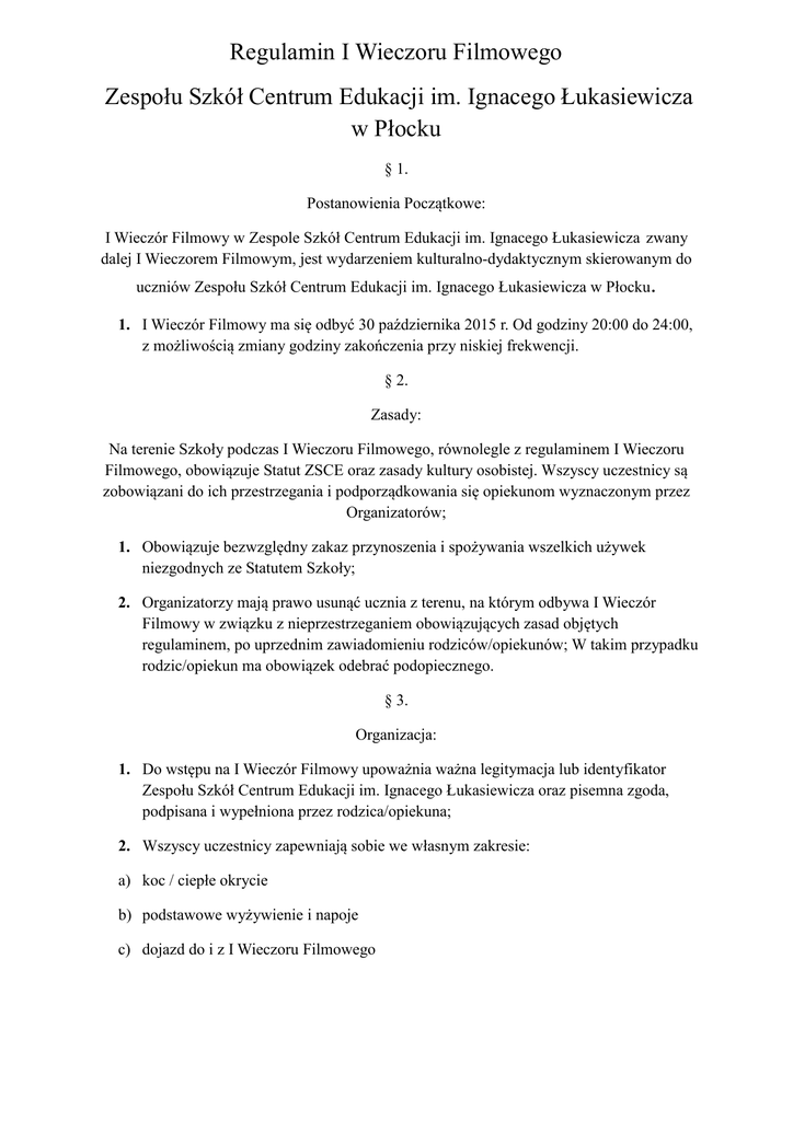 Regulamin I Wieczoru Filmowego Zespołu Szkół Centrum Edukacji im. Ignacego Łukasiewicza w Płocku § 1. Postanowienia Początkowe: I Wieczór Filmowy w Zespole Szkół Centrum Edukacji im. Ignacego Łukasiewicza zwany dalej I Wieczorem Filmowym, jest wydarzeniem kulturalno-dydaktycznym skierowanym do uczniów Zespołu Szkół Centrum Edukacji im. Ignacego Łukasiewicza w Płocku. 1. I Wieczór Filmowy ma się odbyć 30 października 2015 r. Od godziny 20:00 do 24:00, z możliwością zmiany godziny zakończenia przy niskiej frekwencji. § 2. Zasady: Na terenie Szkoły podczas I Wieczoru Filmowego, równolegle z regulaminem I Wieczoru Filmowego, obowiązuje Statut ZSCE oraz zasady kultury osobistej. Wszyscy uczestnicy są zobowiązani do ich przestrzegania i podporządkowania się opiekunom wyznaczonym przez Organizatorów; 1. Obowiązuje bezwzględny zakaz przynoszenia i spożywania wszelkich używek niezgodnych ze Statutem Szkoły; 2. Organizatorzy mają prawo usunąć ucznia z terenu, na którym odbywa I Wieczór Filmowy w związku z nieprzestrzeganiem obowiązujących zasad objętych regulaminem, po uprzednim zawiadomieniu rodziców/opiekunów; W takim przypadku rodzic/opiekun ma obowiązek odebrać podopiecznego. § 3. Organizacja: 1. Do wstępu na I Wieczór Filmowy upoważnia ważna legitymacja lub identyfikator Zespołu Szkół Centrum Edukacji im. Ignacego Łukasiewicza oraz pisemna zgoda, podpisana i wypełniona przez rodzica/opiekuna; 2. Wszyscy uczestnicy zapewniają sobie we własnym zakresie: a) koc / ciepłe okrycie b) podstawowe wyżywienie i napoje c) dojazd do i z I Wieczoru Filmowego § 4. Organizator: 1. Organizatorem I Wieczoru Filmowego jest Zespół Szkół Centrum Edukacji im. I. Łukasiewicza. 2. Osoby wyznaczone do konsultacji w sprawie treści merytorycznej I Wieczoru Filmowego: a) p. Ewelina Frankie b) p. Monika Polok c) p. Marcin Duszczyk d) Agata Kobylińska e) Agnieszka Stanuszkiewicz 3. Osoby wyznaczone do opieki podczas I Wieczoru Filmowego: a) Ewelina Frankie b) Monika Polok c) Agnieszka Stanuszkiewicz d) Gabriela Duszyńska e) Dagmara Pędraszewska- Knieć f) Agata Kobylińska g) Marcin Duszczyk § 5. Postanowienia końcowe: 1. Organizator zastrzega sobie prawo do zmiany terminu lub regulaminu I Wieczoru Filmowego. 2. Organizator zastrzega sobie prawo do odwołania I Wieczoru Filmowego.