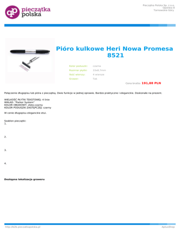 Pieczątka Polska Sp. z o.o. Opolska 8 Tarnowskie Góry Pióro kulkowe Heri Nowa Promesa 8521 Kolor poduszki: czarna Rozmiar płytki: 33x8,7mm Ilość wierszy: 4 wiersze Grawer: Tak Cena brutto: 191,88 PLN Połączenie długopisu lub pióra z pieczątką. Dwie funkcje w jednej oprawie. Bardzo praktyczne i eleganckie. Doskonałe na prezent. WIELKOŚĆ PŁYTKI TEKSTOWEJ: 4 linie WKŁAD: "Parker System" KOLOR OBUDOWY: złoto-czarny KOLOR PODUSZKI ZASTĘPCZEJ: czarny W cenie długopisu eleganckie etui. Szablon pieczątki: 1. 2. 3. 4. Dostępna lokalizacja graweru http://b2b.pieczatkapolska.pl AptusShop Pieczątka Polska Sp. z o.o. Opolska 8 Tarnowskie Góry Dostępne czcionki graweru: Parametry Grawer: NIE, http://b2b.pieczatkapolska.pl AptusShop