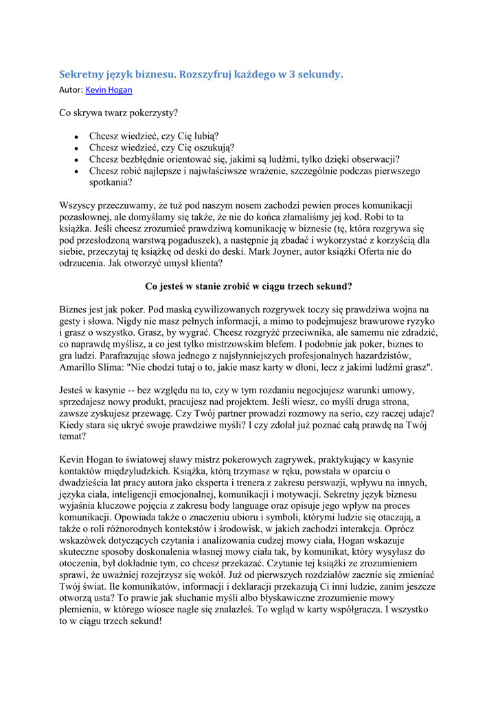 Sekretny język biznesu. Rozszyfruj każdego w 3 sekundy. Autor: Kevin Hogan Co skrywa twarz pokerzysty? Chcesz wiedzieć, czy Cię lubią? Chcesz wiedzieć, czy Cię oszukują? Chcesz bezbłędnie orientować się, jakimi są ludźmi, tylko dzięki obserwacji? Chcesz robić najlepsze i najwłaściwsze wrażenie, szczególnie podczas pierwszego spotkania? Wszyscy przeczuwamy, że tuż pod naszym nosem zachodzi pewien proces komunikacji pozasłownej, ale domyślamy się także, że nie do końca złamaliśmy jej kod. Robi to ta książka. Jeśli chcesz zrozumieć prawdziwą komunikację w biznesie (tę, która rozgrywa się pod przesłodzoną warstwą pogaduszek), a następnie ją zbadać i wykorzystać z korzyścią dla siebie, przeczytaj tę książkę od deski do deski. Mark Joyner, autor książki Oferta nie do odrzucenia. Jak otworzyć umysł klienta? Co jesteś w stanie zrobić w ciągu trzech sekund? Biznes jest jak poker. Pod maską cywilizowanych rozgrywek toczy się prawdziwa wojna na gesty i słowa. Nigdy nie masz pełnych informacji, a mimo to podejmujesz brawurowe ryzyko i grasz o wszystko. Grasz, by wygrać. Chcesz rozgryźć przeciwnika, ale samemu nie zdradzić, co naprawdę myślisz, a co jest tylko mistrzowskim blefem. I podobnie jak poker, biznes to gra ludzi. Parafrazując słowa jednego z najsłynniejszych profesjonalnych hazardzistów, Amarillo Slima: "Nie chodzi tutaj o to, jakie masz karty w dłoni, lecz z jakimi ludźmi grasz". Jesteś w kasynie -- bez względu na to, czy w tym rozdaniu negocjujesz warunki umowy, sprzedajesz nowy produkt, pracujesz nad projektem. Jeśli wiesz, co myśli druga strona, zawsze zyskujesz przewagę. Czy Twój partner prowadzi rozmowy na serio, czy raczej udaje? Kiedy stara się ukryć swoje prawdziwe myśli? I czy zdołał już poznać całą prawdę na Twój temat? Kevin Hogan to światowej sławy mistrz pokerowych zagrywek, praktykujący w kasynie kontaktów międzyludzkich. Książka, którą trzymasz w ręku, powstała w oparciu o dwadzieścia lat pracy autora jako eksperta i trenera z zakresu perswazji, wpływu na innych, języka ciała, inteligencji emocjonalnej, komunikacji i motywacji. Sekretny język biznesu wyjaśnia kluczowe pojęcia z zakresu body language oraz opisuje jego wpływ na proces komunikacji. Opowiada także o znaczeniu ubioru i symboli, którymi ludzie się otaczają, a także o roli różnorodnych kontekstów i środowisk, w jakich zachodzi interakcja. Oprócz wskazówek dotyczących czytania i analizowania cudzej mowy ciała, Hogan wskazuje skuteczne sposoby doskonalenia własnej mowy ciała tak, by komunikat, który wysyłasz do otoczenia, był dokładnie tym, co chcesz przekazać. Czytanie tej książki ze zrozumieniem sprawi, że uważniej rozejrzysz się wokół. Już od pierwszych rozdziałów zacznie się zmieniać Twój świat. Ile komunikatów, informacji i deklaracji przekazują Ci inni ludzie, zanim jeszcze otworzą usta? To prawie jak słuchanie myśli albo błyskawiczne zrozumienie mowy plemienia, w którego wiosce nagle się znalazłeś. To wgląd w karty współgracza. I wszystko to w ciągu trzech sekund! Spis treści: Podziękowania (13) Wstęp (15) O autorze (27) 1. Sekretny język biznesu (29) Badania nad komunikacją niewerbalną (35) Rozdział 1. w telegraficznym skrócie (43) Ćwiczenia do rozdziału 1. (45) 2. Potęga sekretnego języka biznesu (47) Dlaczego powinieneś zainteresować się mową ciała (48) Rozdział 2. w telegraficznym skrócie (64) Ćwiczenia do rozdziału 2. (66) 3. Elementy mowy ciała (67) Oczy (69) Twarz (73) Gesty (76) Dotyk (79) Postawa (83) Ruch (84) Wygląd (85) Głos (88) Rozdział 3. w telegraficznym skrócie (91) Ćwiczenia do rozdziału 3. (92) 4. Kontekst i środowisko (95) Jak kontekst i środowisko wpływają na mowę ciała (96) Ta sama mowa ciała, różna percepcja (107) Kiedy mowa ciała i kontekst wchodzą w konflikt (108) Rozdział 4. w telegraficznym skrócie (112) Ćwiczenia do rozdziału 4. (113) 5. Proksemika: sekretny język biznesu z bliska (115) Co to jest proksemika? (116) Mowa ciała a proksemika (119) Jak duży jest Twój balon? (122) Różne środowiska, różne dystanse (123) Wykorzystanie proksemiki w celu doskonalenia własnych umiejętności komunikacyjnych (123) Rozdział 5. w telegraficznym skrócie (125) Ćwiczenia do rozdziału 5. (125) 6. Co Twoje ciało mówi o Tobie? (127) Status (129) Dominacja (131) Uległość (134) Niepewność (137) Pewność siebie (139) Tożsamość osobista (140) Rozdział 6. w telegraficznym skrócie (141) Ćwiczenia do rozdziału 6. (143) 7. Relacje interpersonalne (145) Wygląd (146) Pierwsze wrażenie (147) Nawiązywanie kontaktu (148) Budowanie zaufania (149) Czytanie komunikatów (150) Wysyłanie komunikatów (151) Oszustwo (155) Sympatia (159) Złość (161) Intymność (163) Skomplikowany przepis na skuteczne zwracanie na siebie uwagi płci przeciwnej (164) Izolacja (168) Rozdział 7. w telegraficznym skrócie (169) Ćwiczenia do rozdziału 7. (171) 8. Sekretny język wywierania wpływu w biznesie (173) Środowisko biznesowe (175) Spotkania (179) Sprzedaż (181) Rekrutacja (184) Równy z równym (185) Przełożony z podwładnym (187) Rozdział 8. w telegraficznym skrócie (188) Ćwiczenia do rozdziału 8. (189) 9. Sekretny język płci (191) Różnice między mężczyznami i kobietami (193) Różnice płci a wysyłanie komunikatów (195) Różnice płci a odbiór komunikatów (197) Porozumienie ponad różnicami (198) Rozdział 9. w telegraficznym skrócie (201) Ćwiczenia do rozdziału 9. (202) 10. Z dziećmi w domu (203) Rola rodzica (205) Noworodki i małe dzieci (210) Dzieci uczące się chodzić i dzieci w wieku przedszkolnym (211) Dzieci w wieku szkolnym (212) Jedenasto- i dwunastolatki (213) Nastolatki (216) Dorosłe dzieci (217) Wnuki (218) Rozdział 10. w telegraficznym skrócie (220) Ćwiczenia do rozdziału 10. (222) 11. Sekretny język biznesu w praktyce (223) Mowa ciała w prawdziwy