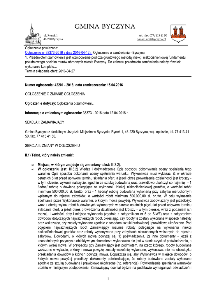 GMINA BYCZYNA ul. Rynek 1 46-220 Byczyna tel. fax. 077/413 41 50 e-mail: [email protected] Ogłoszenie powiązane: Ogłoszenie nr 38373-2016 z dnia 2016-04-12 r. Ogłoszenie o zamówieniu - Byczyna 1. Przedmiotem zamówienia jest wzmocnienie podłoża gruntowego metodą iniekcji niskociśnieniowej fundamentu południowego odcinka murów obronnych miasta Byczyny. Do zakresu przedmiotu zamówienia należy również wykonanie kompletu... Termin składania ofert: 2016-04-27 Numer ogłoszenia: 42201 - 2016; data zamieszczenia: 15.04.2016 OGŁOSZENIE O ZMIANIE OGŁOSZENIA Ogłoszenie dotyczy: Ogłoszenia o zamówieniu. Informacje o zmienianym ogłoszeniu: 38373 - 2016 data 12.04.2016 r. SEKCJA I: ZAMAWIAJĄCY Gmina Byczyna z siedzibą w Urzędzie Miejskim w Byczynie, Rynek 1, 46-220 Byczyna, woj. opolskie, tel. 77 413 41 50, fax. 77 413 41 50. SEKCJA II: ZMIANY W OGŁOSZENIU II.1) Tekst, który należy zmienić: • • Miejsce, w którym znajduje się zmieniany tekst: III.3.2). W ogłoszeniu jest: III.3.2) Wiedza i doświadczenie Opis sposobu dokonywania oceny spełniania tego warunku Opis sposobu dokonania oceny spełniania warunku: Wykonawca musi wykazać, iż w okresie ostatnich 5 lat przed upływem terminu składania ofert, a jeżeli okres prowadzenia działalności jest krótszy w tym okresie, wykonał należycie, zgodnie ze sztuką budowlaną oraz prawidłowo ukończył co najmniej: - 1 /jedną/ robotę budowlaną polegające na wykonaniu iniekcji niskociśnieniowej gruntów, o wartości robót minimum 500.000,00 zł. brutto. oraz - 1 /jedną/ robotę budowlaną wykonaną przy zabytku nieruchomym wpisanym do rejestru zabytków, o wartości robót minimum 500.000,00 zł. brutto. W celu wykazania spełniania przez Wykonawcę warunku, o którym mowa powyżej, Wykonawca zobowiązany jest przedłożyć wraz z ofertą: wykaz robót budowlanych wykonanych w okresie ostatnich pięciu lat przed upływem terminu składania ofert, a jeżeli okres prowadzenia działalności jest krótszy - w tym okresie, wraz z podaniem ich rodzaju i wartości, daty i miejsca wykonania (zgodnie z załącznikiem nr 5 do SIWZ) oraz z załączeniem dowodów dotyczących najważniejszych robót, określając, czy roboty te zostały wykonane w sposób należyty oraz wskazując, czy zostały wykonane zgodnie z zasadami sztuki budowlanej i prawidłowo ukończone. Pod pojęciem najważniejszych robót Zamawiający rozumie roboty polegające na wykonaniu iniekcji niskociśnieniowej gruntów oraz roboty wykonywane przy zabytkach nieruchomych wpisanych do rejestru zabytków. Dowodami, o których mowa powyżej są: 1) poświadczenia, 2) inne dokumenty - jeżeli z uzasadnionych przyczyn o obiektywnym charakterze wykonawca nie jest w stanie uzyskać poświadczenia, o którym wyżej mowa. W przypadku gdy Zamawiający jest podmiotem, na rzecz którego, roboty budowlane wskazane w wykazie, o którym mowa powyżej zostały wcześniej wykonane, wykonawca nie ma obowiązku przekładania dowodów o których powyżej mowa. Dopuszcza się, aby Wykonawca w miejsce dowodów, o których mowa powyżej przedłożył dokumenty potwierdzające, że roboty budowlane zostały wykonane zgodnie ze sztuką budowlaną i prawidłowo ukończone (np. referencje). Potwierdzenie spełniania warunków udziału w niniejszym postępowaniu, Zamawiający oceniał będzie na podstawie wymaganych oświadczeń i 1 • • • dokumentów. Ocena spełniania warunków dokonywana będzie w systemie 0 - 1 (zero - jedynkowym tj. spełnia - nie spełnia).. W ogłoszeniu powinno być: Warunek posiadania wiedzy i doświadczenia: Opis sposobu dokonania oceny spełniania warunku: Wykonawca musi wykazać, iż w okresie ostatnich 5 lat przed upływem terminu składania ofert, a jeżeli okres prowadzenia działalności jest krótszy - w tym okresie, wykonał należycie, zgodnie ze sztuką budowlaną oraz prawidłowo ukończył co najmniej: -1 /jedną/ robotę budowlaną o wartości robót minimum 500.000,00 zł. brutto, gdzie wykonywano wzmocnienie/stabilizację gruntu metoda iniekcji niskociśnieniowej gruntów oraz kolumn DSM. lub 2 /dwie/ roboty budowlane o łącznej wartości minimum 500.000,00 zł. brutto, gdzie w jednej z nich wykonano wzmocnienie/stabilizację gruntu metodą iniekcji niskociśnieniowej a w drugiej robocie wykonano wzmocnienie/stabilizację gruntu metodą kolumn DSM. Oraz oprócz jednej opcji z w/w -1 /jedną/ robotę budowlaną wykonaną przy zabytku nieruchomym wpisanym do rejestru zabytków, o wartości robót minimum 500.000,00 zł. brutto. W celu wykazania spełniania przez Wykonawcę warunku, o którym mowa powyżej, Wykonawca zobowiązany jest przedłożyć wraz z ofertą: wykaz robót budowlanych wykonanych w okresie ostatnich pięciu lat przed upływem terminu składania ofert, a jeżeli okres prowadzenia działalności jest krótszy - w tym okresie, wraz z podaniem ich rodzaju i wartości, daty i miejsca wykonania (zgodnie z załącznikiem nr 5 do SIWZ) oraz z załączeniem dowodów dotyczących najważniejszych robót, określając, czy roboty te zostały wykonane w sposób należyty oraz wskazując, czy zostały wykonane zgodnie z zasadami sztuki budowlanej i prawidłowo ukończone. Pod pojęciem najważniejszych robót Zamawiający rozumie roboty polegające na wykonaniu wzmocnienia/stabilizacji gruntu metodami iniekcji niskociśnieniowej oraz kolumn DSM, jak również roboty wykonywane przy zabytkach nieruchomych wpisanych do rejestru zabytków. Dowodami, o których mowa powyżej są: 1) poświadczenia, 2) inne dokumenty - jeżeli z uzasadnionych przyczyn o obiektywnym charakterze wykonawca nie jest w stanie uzyskać poświadczenia, o którym wyżej mowa. W przypadku gdy Zamawiający jest podmiotem, na rzecz którego, roboty budowlane wskazane w wykazie, o którym mowa powyżej zostały wcześniej wykonane, wykonawca nie ma obowiązku przekładania dowodów o których powyżej mowa. Dopuszcza się, aby Wykonawca w miejsce dowodów, o któr