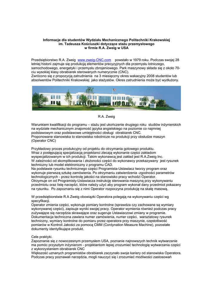 Informacje dla studentów Wydziału Mechanicznego Politechniki Krakowskiej im. Tadeusza Kościuszki dotyczące stażu przemysłowego w firmie R.A. Zweig w USA Przedsiębiorstwo R.A. Zweig www.zweig-CNC.com powstało w 1979 roku. Podczas swojej 28 letniej historii zajmuje się produkcją elementów precyzyjnych dla przemysłu lotniczego, samochodowego, energetyki i przemysłu zbrojeniowego. Park maszynowy składa się z około 70ciu wysokiej klasy obrabiarek sterowanych numerycznie (CNC). Zwrócono się z propozycją zatrudnienia na 3 miesięczny okres wakacyjny 2008 studentów lub absolwentów Politechniki Krakowskiej jako stażystów. Okres zatrudnienia może być wydłużony. R.A. Zweig Warunkiem kwalifikacji do programu – stażu jest ukończenie drugiego roku studiów inżynierskich na wydziale mechanicznym znajomość języka angielskiego na poziomie co najmniej podstawowym oraz podstawowe umiejętności obsługi obrabiarek CNC. Proponowane stanowiska to stanowiska robotnicze na produkcji przy obsłudze maszyn (Operator CNC) Przykładowy proces produkcyjny od projektu do otrzymania gotowego produktu. Wraz z postępującą specjalizacją projektanci zlecają wykonanie części zakładom wyspecjalizowanym w ich produkcji. Takim wykonawcą jest zakład jest R.A.Zweig Inc. W zależności od skomplikowania i złożoności części do wykonawcy przekazywany jest rysunek techniczny lub model elektroniczny z programu CAD. Na podstawie rysunku technicznego części Programista-Ustawiacz tworzy program oraz wykonuje pierwszą sztukę zamówienia. Po otrzymaniu zatwierdzenia -zgodności parametrów technologicznych - przez kontrolę jakości na stanowisko pracy wchodzi Operator. Otrzymuje on od Programisty-Ustawiacza instrukcję sterowania maszyną przy wykonywaniu przedmiotu oraz listę narzędzi, które należy użyć aby program wykonał dany przedmiot pokazany na rysunku. Po zapoznaniu się z nimi Operator rozpoczyna produkcję na skalę masową. W przedsiębiorstwie R.A Zweig obowiązki Operatora polegają na wykonywaniu części wg specyfikacji. Operator zmienia części, wykonuje pomiary kontrolne (sprawdza czy zachowane są wymiary wykonywanej części), zapisuje wyniki swojej pracy. Operator wymienia również podczas pracy zużywające się narzędzia skrawające oraz sugeruje Ustawiaczowi zmiany w programie. Dokumentacja techniczna zawiera numer zamówienia, numer części, warsztatowy rysunek techniczny, wymiary kontrolne do pomiaru przez operatora przy maszynie, częstotliwość pomiarów w Kontroli Jakości za pomocą CMM (Cordynation Measure Machine), pozostałe dokumenty identyfikujące produkt. Cele praktyki. Zapoznanie się z nowoczesnym przemysłem USA, poznanie najnowszych technik wytwarzanie ma pomóc przyszłym inżynierom - projektantom lepiej zrozumieć technologię wytwarzania części z wykorzystaniem obrabiarek CNC Większość uznanych programistów obrabiarek zaczynało swoje kariery od stanowiska Operatora. Podczas pracy poznawali narzędzia, mogli nauczyć się i zrozumieć możliwości zastosowań wieloosiowych obrabiarek oraz zaobserwować jak pracują napisane już programy. Właśnie taką rolę ma pełnić proponowana praktyka przemysłowa. Stanowisko Operatora w R.A. Zweig, Inc. Znajomość warsztatowego rysunku technicznego, zasad tolerancji, systemu calowego, umiejętność pomiaru na suwmiarce, mikrometrze, pasometrze i średnicówce to podstawowe wymagania stawiane Operatorom maszyn CNC. Strona producenta wieloosiowych obrabiarki CNC www.mazak.com. Wieloosiowe obrabiarki Mazak firmy w przedsiębiorstwie R.A. Zweig. Pełną listę obrabiarek podaje strona internetowa www.zweig-cnc.com W przedsiębiorstwie R.A. Zweig wyznaczone są osoby odpowiedzialne za opiekę nad stażystą oraz ich wstępne przeszkolenie w centrum szkoleniowym firmy. Każdy z kandydatów przedstawia swoje CV będące podstawą wyboru osób na staż. Po selekcji przez firmę R.A. Zweig, Inc. podpisywana będzie indywidualna umowa o pracę stanowiąca podstawę do starania się o wizę. Ilość miejsc ograniczona. Zainteresowane osoby proszone są o przesłanie swojego CV na adres Stowarzyszenia Wychowanków Politechniki Krakowskiej [email protected]