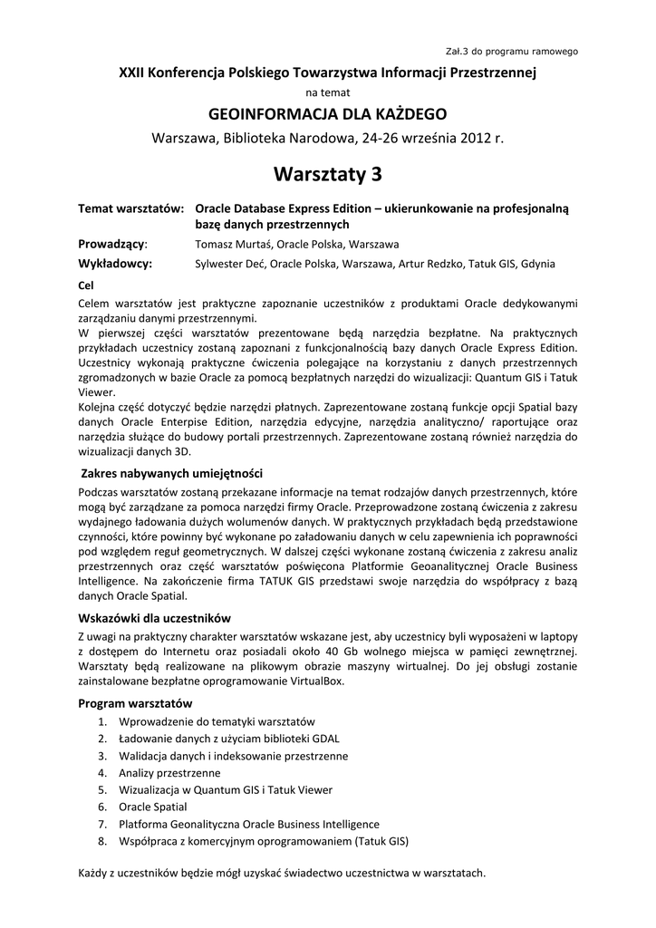 Zał.3 do programu ramowego XXII Konferencja Polskiego Towarzystwa Informacji Przestrzennej na temat GEOINFORMACJA DLA KAŻDEGO Warszawa, Biblioteka Narodowa, 24-26 września 2012 r. Warsztaty 3 Temat warsztatów: Oracle Database Express Edition – ukierunkowanie na profesjonalną bazę danych przestrzennych Prowadzący: Tomasz Murtaś, Oracle Polska, Warszawa Wykładowcy: Sylwester Deć, Oracle Polska, Warszawa, Artur Redzko, Tatuk GIS, Gdynia Cel Celem warsztatów jest praktyczne zapoznanie uczestników z produktami Oracle dedykowanymi zarządzaniu danymi przestrzennymi. W pierwszej części warsztatów prezentowane będą narzędzia bezpłatne. Na praktycznych przykładach uczestnicy zostaną zapoznani z funkcjonalnością bazy danych Oracle Express Edition. Uczestnicy wykonają praktyczne ćwiczenia polegające na korzystaniu z danych przestrzennych zgromadzonych w bazie Oracle za pomocą bezpłatnych narzędzi do wizualizacji: Quantum GIS i Tatuk Viewer. Kolejna część dotyczyć będzie narzędzi płatnych. Zaprezentowane zostaną funkcje opcji Spatial bazy danych Oracle Enterpise Edition, narzędzia edycyjne, narzędzia analityczno/ raportujące oraz narzędzia służące do budowy portali przestrzennych. Zaprezentowane zostaną również narzędzia do wizualizacji danych 3D. Zakres nabywanych umiejętności Podczas warsztatów zostaną przekazane informacje na temat rodzajów danych przestrzennych, które mogą być zarządzane za pomoca narzędzi firmy Oracle. Przeprowadzone zostaną ćwiczenia z zakresu wydajnego ładowania dużych wolumenów danych. W praktycznych przykładach będą przedstawione czynności, które powinny być wykonane po załadowaniu danych w celu zapewnienia ich poprawności pod względem reguł geometrycznych. W dalszej części wykonane zostaną ćwiczenia z zakresu analiz przestrzennych oraz część warsztatów poświęcona Platformie Geoanalitycznej Oracle Business Intelligence. Na zakończenie firma TATUK GIS przedstawi swoje narzędzia do współpracy z bazą danych Oracle Spatial. Wskazówki dla uczestników Z uwagi na praktyczny charakter warsztatów wskazane jest, aby uczestnicy byli wyposażeni w laptopy z dostępem do Internetu oraz posiadali około 40 Gb wolnego miejsca w pamięci zewnętrznej. Warsztaty będą realizowane na plikowym obrazie maszyny wirtualnej. Do jej obsługi zostanie zainstalowane bezpłatne oprogramowanie VirtualBox. Program warsztatów 1. 2. 3. 4. 5. 6. 7. 8. Wprowadzenie do tematyki warsztatów Ładowanie danych z użyciam biblioteki GDAL Walidacja danych i indeksowanie przestrzenne Analizy przestrzenne Wizualizacja w Quantum GIS i Tatuk Viewer Oracle Spatial Platforma Geonalityczna Oracle Business Intelligence Współpraca z komercyjnym oprogramowaniem (Tatuk GIS) Każdy z uczestników będzie mógł uzyskać świadectwo uczestnictwa w warsztatach.