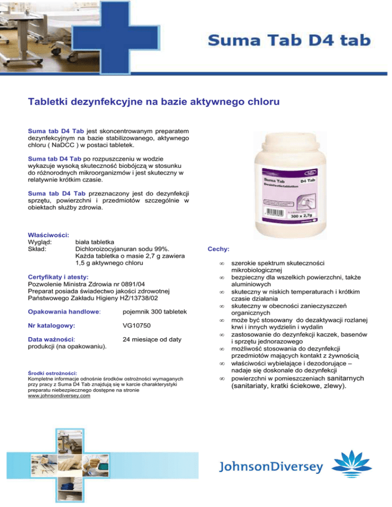 Tabletki dezynfekcyjne na bazie aktywnego chloru Suma tab D4 Tab jest skoncentrowanym preparatem dezynfekcyjnym na bazie stabilizowanego, aktywnego chloru ( NaDCC ) w postaci tabletek. Suma tab D4 Tab po rozpuszczeniu w wodzie wykazuje wysoką skuteczność biobójczą w stosunku do różnorodnych mikroorganizmów i jest skuteczny w relatywnie krótkim czasie. Suma tab D4 Tab przeznaczony jest do dezynfekcji sprzętu, powierzchni i przedmiotów szczególnie w obiektach służby zdrowia. Właściwości: Wygląd: biała tabletka Skład: Dichloroizocyjanuran sodu 99%. Każda tabletka o masie 2,7 g zawiera 1,5 g aktywnego chloru Certyfikaty i atesty: Pozwolenie Ministra Zdrowia nr 0891/04 Preparat posiada świadectwo jakości zdrowotnej Państwowego Zakładu Higieny HŻ/13738/02 Opakowania handlowe: pojemnik 300 tabletek Nr katalogowy: VG10750 Data ważności: produkcji (na opakowaniu). 24 miesiące od daty Cechy: • • • • • • • • Środki ostrożności: Kompletne informacje odnośnie środków ostrożności wymaganych przy pracy z Suma D4 Tab znajdują się w karcie charakterystyki preparatu niebezpiecznego dostępne na stronie www.johnsondiversey.com • szerokie spektrum skuteczności mikrobiologicznej bezpieczny dla wszelkich powierzchni, także aluminiowych skuteczny w niskich temperaturach i krótkim czasie działania skuteczny w obecności zanieczyszczeń organicznych może być stosowany do dezaktywacji rozlanej krwi i innych wydzielin i wydalin zastosowanie do dezynfekcji kaczek, basenów i sprzętu jednorazowego możliwość stosowania do dezynfekcji przedmiotów mających kontakt z żywnością właściwości wybielające i dezodorujące – nadaje się doskonale do dezynfekcji powierzchni w pomieszczeniach sanitarnych (sanitariaty, kratki ściekowe, zlewy). Sposób użycia Dezynfekcja ogólna powierzchni i przedmiotów nie zanieczyszczonych substancjami organicznymi Ilość tabletek Ilość wody 1 tabletka 1,5 litra wody 2 tabletki 1,5 litra wody • • • • • Czas ekspozycji Działanie Stężenie wodnego roztworu roboczego roztwór zawiera 1000 ppm aktywnego chloru 15 minut B, F, V 0,18% roztwór zawiera 2000 ppm aktywnego chloru 15 minut B, F, Tbc, V 0,36% Zawartość aktywnego chloru Przygotować roztwór preparatu rozpuszczając odpowiednią do zastosowania liczbę tabletek w 1,5 litra wody. Przygotowanym roztworem przemywać powierzchnie lub zanurzyć w nim dezynfekowane przedmioty. Odczekać 15 minut. Przedmioty po dezynfekcji wypłukać w czystej wodzie i odczekać aż wyschną. Roztwory należy przygotowywać bezpośrednio przed użyciem. Dezynfekcja powierzchni i przedmiotów zanieczyszczonych substancjami organicznymi Czas ekspozycji Działanie Stężenie wodnego roztworu roboczego roztwór zawiera 4000 ppm aktywnego chloru 30 minut B, Tbc, F, V 0,72% 1,5 litra wody roztwór zawiera 6000 ppm aktywnego chloru 15 minut B, F, Tbc, V 1,08% 1,5 litr wody roztwór zawiera 10 000 ppm aktywnego chloru 15 minut B, Tbc, F, V, S* 1,80% Ilość tabletek Ilość wody 4 tabletki 1,5 litra wody 6 tabletek 10 tabletek Zawartość aktywnego chloru *Clostridium difficile (warunki czyste i brudne) • • • • • • • • Przygotować roztwór preparatu rozpuszczając odpowiednią do zastosowania liczbę tabletek w 1,5 litra wody. Przygotowanym roztworem przemywać powierzchnie lub zanurzyć w nim dezynfekowane przedmioty. Odczekać 15 minut. Przedmioty po dezynfekcji wypłukać w czystej wodzie i odczekać aż wyschną. Roztwory należy przygotowywać bezpośrednio przed użyciem Rozlaną krew, wydzieliny i wydaliny zalać roztworem o stężeniu 10 000 ppm aktywnego chloru, następnie po 15 minutach usunąć zanieczyszczenia jednorazowym ręcznikiem a powierzchnię ponownie zdezynfekować. Czynności wykonywać w rękawicach ochronnych. Rękawice i wszystkie inne materiały użyte do dezynfekcji i zbierania zanieczyszczeń umieścić w pojemniku, traktować jak materiał zakaźny. UWAGA: Preparat przeznaczony do profesjonalnego stosowania. Dokładny sposób użycia preparatu, dostosowany do Państwa potrzeb określi nasz przedstawiciel.