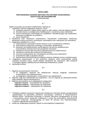 Załącznik do uchwały nr 69/o/10/2013 REGULAMIN PRZYZNAWANIA NAGRÓD REKTORA POLITECHNIKI KRAKOWSKIEJ NAUCZYCIELOM AKADEMICKIM (Tekst jednolity) §1 Rektor przyznaje nauczycielom akademickim nagrody za: 1. oryginalne i twórcze osiągnięcia naukowe, w tym: 1) publikacje naukowe, mające istotny wpływ na stan wiedzy i kierunki dalszych badań; 2) dorobek złożony w postępowaniu habilitacyjnym i wyróżnione prace doktorskie; 3) prace konstrukcyjne, technologiczne i projektowe, charakteryzujące się nowatorskim, naukowym podejściem do problemu; 4) prace artystyczne; 2. kształcenie kadr naukowych potwierdzone: inicjowaniem problematyki badawczej, pełnieniem funkcji promotora, konsultanta i opiniodawcy prac naukowych lub recenzenta; 3. osiągnięcia dydaktyczne, w tym: 1) systematyczne uzyskiwanie bardzo dobrych ocen w studenckich ankietach; 2) opracowanie podręcznika uznanego w środowisku akademickim; 3) autorstwo lub współautorstwo wyróżniających się pomocy dydaktycznych, przewodników metodycznych lub programów nauczania; 4) odniesione sukcesy jako promotora nagradzanych prac dyplomowych; 5) odniesione sukcesy jako opiekuna kół naukowych; 6) wzorowe wywiązywanie się z obowiązków promotora prac doktorskich; 7) prowadzenie zajęć w językach obcych; 8) wykazywanie ponadprzeciętnej inicjatywy podczas realizacji procesu dydaktycznego; 4. osiągnięcia organizacyjne, w tym konkretne działania, które spowodowały istotną poprawę warunków pracy, wzrost efektów kształcenia lub naukowych, albo związane z rozwojem ogólnej, dydaktycznej lub badawczej infrastruktury uczelni. 5. całokształt dorobku. §2 1. Nagrody są przyznawane corocznie: 1) za osiągnięcia naukowe lub dydaktyczne; dotyczą osiągnięć uzyskanych w poprzednim roku kalendarzowym; 2) za osiągnięcia organizacyjne; w poprzednim roku akademickim. 2. Nagrody mogą być indywidualne lub zespołowe, z tym że nagrody za całokształt dorobku mają charakter nagród indywidualnych. 3. Nagrody przyznawane są w następujących kategoriach: nagroda I stopnia – indywidualna lub zespołowa, nagroda II stopnia – indywidualna lub zespołowa, nagroda III stopnia – indywidualna lub zespołowa. §3 Podstawą ustalania wysokości nagrody jest miesięczna minimalna stawka wynagrodzenia zasadniczego na stanowisku profesora zwyczajnego, określona w Rozporządzeniu Ministra Nauki i Szkolnictwa Wyższego w sprawie warunków wynagradzania za pracę i przyznawania innych świadczeń związanych z pracą dla pracowników zatrudnionych w uczelni publicznej, obowiązującego na dzień 30 czerwca roku kalendarzowego, w którym nagroda jest przyznawana. 2. Ustala się następującą wysokość nagród w poszczególnych kategoriach: 1. Nagroda indywidualna: I stopnia – do wysokości 250 % podstawy określonej w ust. 1, II stopnia – do wysokości 125 % podstawy określonej w ust. 1, III stopnia – do wysokości 65 % podstawy określonej w ust. 1. Nagroda zespołowa: I stopnia – do wysokości 500 % podstawy określonej w ust. 1, II stopnia – do wysokości 250 % podstawy określonej w ust. 1, III stopnia – do wysokości 125 % podstawy określonej w ust. 1. 3. Nagroda zespołowa przyznawana jest zespołowi liczącemu nie więcej niż 10 członków. Udział każdego z nich w powstaniu osiągnięcia powinien być określony procentowo, w zależności od wkładu pracy w uzyskanym osiągnięciu. §4 1. Wnioski o przyznanie nagród Rektora składają dziekani po zasięgnięciu opinii rady wydziału lub kierownicy jednostek pozawydziałowych po zaopiniowaniu przez właściwego prorektora. Wzory wniosków stanowią załączniki nr 1 i 2 do niniejszego Regulaminu. 2. W szczególnie uzasadnionych przypadkach Rektor może przyznać nagrodę z własnej inicjatywy. 3. Osoby lub zespoły kandydujące do nagrody Ministra Nauki i Szkolnictwa Wyższego, których wnioski zostały przesłane z uczelni do MNiSW, a którym nagrody nie przyznano, mogą ubiegać się o nagrodę Rektora jedynie na podstawie wniosku – bez przeprowadzania postępowania. §5 Wnioski o przyznanie nagrody Rektora należy składać w terminie do 15 listopada roku kalendarzowego, w którym może być przyznana nagroda. §6 Rektor podejmuje decyzję o przyznaniu nagrody po zapoznaniu się z opinią Rektorskiej Komisji ds. Nagród dla Nauczycieli Akademickich. §7 Z tego samego tytułu w danym roku kalendarzowym nauczyciel akademicki może otrzymać tylko jedną nagrodę: Ministra Nauki i Szkolnictwa Wyższego albo Rektora. §8 Nagrody wypłacane są do końca roku kalendarzowego, w którym nagroda została przyznana. Załącznik nr 1 do Regulaminu przyznawania nagród Rektora PK nauczycielom akademickim Kraków, dnia………………………… ………………………………………… Wnioskodawca (nazwa wydziału lub innej jednostki organizacyjnej PK) WNIOSEK o przyznanie nagrody indywidualnej Rektora Politechniki Krakowskiej ............. stopnia Zgłaszam wniosek o przyznanie nagrody indywidualnej za osiągnięcia: ..................................................................................................................................................................... ..................................................................................................................................................................... ..………………………………………………………………………..... (tytuł pracy, podręcznika lub innego osiągnięcia naukowego, dydaktycznego lub organizacyjnego) 1. x/ Tytuł i stopień naukowy , nazwisko i imię oraz wiek kandydata do nagrody: ............................................................................................................................................................. Zajmowane stanowisko, wymiar czasu pracy, nazwa jednostki organizacyjnej uczelni (w przypadku, gdy uczelnia nie jest podstawowym miejscem pracy kandydata należy podać formę zatrudn