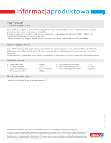 informacjaproduktowa tesa® 60299 Taśma tynkarska z PVC tesa® 60299 to specjalnie opracowana taśma z plastyfikowanego PVC, charakteryzująca się niską siłą odwijania, wysoką przyczepnością w niskiej temperaturze, z płaską folią. Z uwagi na grube pokrycie miękką, modyfikowaną masą klejącą na bazie kauczuku taśma tesa® 60299 nadaje się do stosowania na większości nierównych powierzchni. Taśma jest odporna na działanie wilgoci, słabych roztworów zasadowych, kwasów i wielu innych chemikaliów. Główne zastosowanie tesa® 60299 nadaje się do zabezpieczania podczas tynkowania, malowania, gipsowania, prac murarskich i sztukaterskich. Zabezpiecza powierzchnie delikatnych profili i fasad przed zabrudzeniem i uszkodzeniem ze strony narzędzi i materiałów roboczych. Nadaje się również do zaklejania toreb, jako wytrzymały materiał owijkowy oraz do innych zastosowań dla majsterkowiczów. Dane techniczne ▪ ▪ ▪ ▪ Materiał nośnika Grubość całkowita Typ substancji klejącej Przylepność do stali folia PVC 120 µm kauczuk naturalny 2.4 N/cm ▪ ▪ ▪ Wydłużenie przy zerwaniu Odporność na rozciąganie Odporność na promienie UV 125 % 16 N/cm 2 tygodnie Dodatkowe informacje Strona 1 z 1 - Data: 19/10/2016 - pl Taśmę można stosować w temperaturach powyżej 0 °C. Najnowsze informacje na temat tego produktu znajdziesz tutaj http://l.tesa.com/?ip=60299 W ciężkich warunkach eksploatacyjnych, produkty tesa® stale dowodzą swej imponującej jakości. Ponadto, produkty te regularnie poddawane są rygorystycznej kontroli jakości. Wszystkie podane wyżej techniczne informacje i zalecenia oparte są na naszej najlepszej w tym względzie wiedzy i praktycznym doświadczeniu. Powinny one być rozpatrywane jako średnie wartości i nie powinny być traktowane jako odpowiednie do specyfikacji. Dlatego też tesa SE nie może dać rękojmi, czy to wyraźnej czy domyślnej. W każdym konkretnym przypadku to użytkownik ponosi odpowiedzialność za ustalenie zdatności danego produktu tesa® co do celu, jak i przyjętej przez niego metody nakładania. W wypadku jakichkolwiek wątpliwości prosimy zasięgnąć porady w naszym dziale Pomocy Technicznej.