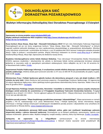 Biuletyn informacyjny Dolnośląskiej Sieci Doradztwa Pozarządowego 17/sierpień Wiadomości/Informacje: Zapraszamy na stronę projektu www.inkubatorNGO.info Mapkę Lokalnych Inkubatorów NGO znajdziesz tutaj http://www.inkubatorngo.info/8/nse/2/12 Dołącz do nas na facebooku Rusza konkurs Akcja Akacja, Akcja Dąb – Niezwykli Dolnoślązacy 2013! W tym roku Dolnośląska Federacja Organizacji Pozarządowych już po raz ósmy zorganizuje konkurs "Akcja Akacja, Akcja Dąb - Niezwykli Dolnoślązacy” w którym nagrodzi wybitne jednostki działające na rzecz społeczeństwa obywatelskiego w województwie dolnośląskim. Wkrótce ruszy rekrutacja uczestniczek i uczestników do konkurs, a już 23 października 2013 laureaci tradycyjnie posadzą drzewko Akacji i Dębu w jednym z wrocławskich parków. Więcej informacji niebawem na stronie www.dfop.org.pl w zakładce Działania/Akcja Akacja, Akcja Dąb. Zapraszamy do śledzenia naszej strony. Bezpłatna Interdyscyplinarna Letnia Szkoła Edukacji Globalnej. Trwa rekrutacja! Chrześcijańska Służba Charytatywna (ChSCh) zaprasza studentów i absolwentów do udziału w darmowej Szkole Letniej poświęconej tematyce edukacji globalnej w nauczaniu osób ze specjalnymi potrzebami edukacyjnymi, która odbędzie się od 3 do 10 września br. w Nasutowie koło Lublina. Źródło. Departament Pożytku Publicznego informuje, iż uruchomiona została infolinia dotycząca sprawozdawczości organizacji pożytku publicznego. Infolinia działa pod numerami (22) 661 11 47 oraz 22 693 49 70 od poniedziałku do piątku w godz. 9.00-15.00. Źródło. Ministerstwo Pracy i Polityki Społecznej ogłosiło konkurs dla dziennikarzy piszących o tym, jak dzięki środkom z EFS zmienia się życie ludzi. Celem Konkursu jest promocja wsparcia z Europejskiego Funduszu Społecznego. W tegorocznej VII edycji nagradzane będą prace, które spełniają kryteria gatunkowe dziennikarskiej formy reportażu. Nabór trwa aż do dnia 31 grudnia 2013 r. Szczegóły. Zarząd Rejonowy Polskiego Związku Emerytów, Rencistów i Inwalidów w Jeleniej Górze zaprasza zespoły artystyczne działające wśród seniorów do uczestnictwa w II Przeglądzie Zespołowej Twórczości Amatorskiej Seniorów. Przegląd odbędzie się w dniach 1-3 X 2013 r. Termin zgłoszeń upływa 30 sierpnia 2013 r. Więcej informacji: Jerzy Mandryk tel. 75 75 22 161 lub 509 499 259. Bezpłatne porady prawne: "Mapa bezpłatnego poradnictwa prawnego i obywatelskiego". Mapa opracowana w ramach projektu z PO KL realizowanego m.in. przez Ministerstwo Pracy i Polityki Społecznej. Serwis internetowy skupia informacje o różnego rodzaju instytucjach świadczących nieodpłatnie porady prawne i obywatelskie oraz umożliwia ich wyszukiwanie w Waszej okolicy. www.mapaporadnictwa.org. Zachęcamy do odwiedzenia pierwszej NGO-sowej biblioteki online, gdzie jest możliwość bezpłatnego pobrania eksperckiej wiedzy z zakresu ekonomii społecznej. Gromadzone są na bieżąco publikacje, opracowania, raporty oraz ciekawe multimedia - głównie video. Wybierz kategorię i znajdź wiedzę z zakresu, który Cię interesuje. Źródło i szczegóły. Zachęcamy do zapoznania się z infografikami zamieszczanymi na stronie internetowej http://pinterest.com/konkursydlango/infografika-pozarzadowa z których można wyczytać wiele przydatnych dla organizacji pozarządowych informacji. Szkolenia/Warsztaty: Szkolenie - Tworzenie małych projektów. Małe projekty do możliwość uzyskania dotacji do 10 tys. od administracji samorządowej dla organizacji na realizację działań pożytku publicznego. Dzięki temu możesz zorganizować cykl szkoleń, koncert charytatywny, nakręcić film promujący Twoją miejscowość, stworzyć portal internetowy i wiele innych. Szkolenie jest odpłatne. Szczegółowe informacje na temat rekrutacji znajdują się na stronie WWW.f4f.perennitas.org w kategorii „Szkolenia”. Źródło. Warsztaty pracy grupowej i pedagogiki przeżycia po wakacjach 2013. Wrocławskie Stowarzyszenie Wychowawców zaprasza na warsztaty pedagogiczne dotyczące metodyki gier i zabaw w przyrodzie, aktywnych i kreatywnych form pracy z grupą oraz teorii i praktyki pedagogiki przeżycia. Miejsce: Szkolne Schronisko Młodzieżowe „Dworek" w Obornikach Śląskich. Uczestnicy: młodzi nauczyciele, wychowawcy, wolontariusze, pracownicy domów kultury, harcerze, edukatorzy Lasów Państwowych i inne osoby pracujące formalnie lub nieformalnie z młodzieżą. Termin: 25-27.10.2013. Koszt: 250 PLN. Więcej. Creative Camp - różnorodne warsztaty dla młodzieży z Polski i Niemiec. Od organizatorów: Nie macie jeszcze planów na lato, a szukacie interesujących ofert w pobliżu? Chcielibyście odwiedzić naszych zachodnich sąsiadów, ale macie obawy, że znajomość niemieckiego wam to uniemożliwia? Mamy dla was propozycję! Poniżej znajdują się nowatorskie warsztaty (można się oczywiście zapisywać na jeden albo na wiele warsztatów) i wpaść na niemiecko-polskie CREATIVE CAMP. Więcej. Szkolenie "Partnerstwa i tworzenie sieci na rzecz ekonomii społecznej". Centrum Ekonomii Społecznej Zgorzelec i Fundacja PROBUS zapraszają na bezpłatne szkolenie na temat tworzenia lokalnych partnerstw, które odbędzie się w dniach 14-15 września 2013 w Zgorzelcu. Odbiorcy szkolenia: organizacje pozarządowe, instytucje rynku pracy, pomocy i integracji społecznej z subregionu jeleniogórskiego. Tematyka m.in.: zarządzanie podmiotami es, worzenie wizerunku podmiotów es, przedsiębiorczość podmiotów es czy źródło finansowania podmiotów es. Uczestnikom zapewniony jest: nocleg, wyżywienie, materiały szkoleniowe, wykwalifikowanych trenerów, transport, doradztwo oraz zaświadczenie potwierdzające zdobyte kwalifikacje. Źródło. Kurs Polskiego Języka Migowego. W terminie: 8 sierpnia - 31 października 2013 we Wrocławiu (ul. Zelwerowicza 4a) odbędzie się kurs Polskiego Języka Migowego dla pracowników NGO, organizowany