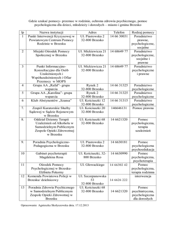 Gdzie szukać pomocy- przemoc w rodzinie, ochrona zdrowia psychicznego, pomoc psychologiczna dla dzieci, młodzieży i dorosłych – miasto i gmina Brzesko lp 1 Nazwa instytucji Punkt Interwencji Kryzysowej w Powiatowym Centrum Pomocy Rodzinie w Brzesku Adres Ul. Piastowska 2 32-800 Brzesko Telefon 14 66 30031 2 Miejski Ośrodek Pomocy Społecznej w Brzesku Ul. Mickiewicza 21 32-800 Brzesko 14 68649 77 3 Punkt InformacyjnoKonsultacyjno dla Osób Uzależnionych i Współuzależnionych i Ofiar Przemocy w MOPS Grupa AA „Rafał”- grupa wsparcia Grupa AA „Karolina”- grupa wsparcia Klub Abstynentów „Szansa” Ul. Mickiewicza 21 32-800 Brzesko 14 68649 77 Rynek 2 32-800 Brzesko Rynek 2 32-800 Brzesko Ul. Kościuszki 12 32-800 Brzesko Ul. Kościuszki 20 32-800 Brzesko 14 66 31325 Ul. Kościuszki 68 32-800 Brzesko 14 6621320 Pomoc psychologiczna, terapia uzależnień Pomoc psychologiczna psychoedukacja Pomoc psychologiczna, psychoterapia Pomoc psychologiczna, terapia rodzinna interwencja 4 5 6 7. 8. Zespól Kuratorskie Służby Sądowej w Sądzie Rejonowym w Brzesku Oddział Dzienny Terapii Uzależnień od Alkoholu w Samodzielnym Publicznym Zespole Opieki Zdrowotnej w Brzesku 14 66 31325 14 66 31315 146646131 9. Poradnia PsychologicznoPedagogiczna w Brzesku Ul. Piastowska 2 32-800 Brzesko 14 6630181 10 Gabinet psychoterapii Magdalena Rosa Ul. Kościuszki, 32800 Brzesko 14 6630990 Ul. Głowackiego 14 66302 42 Ośrodek Pomocy Psychologicznej w BrzeskuElżbieta Pokorny 12 Komenda Powiatowa Policji w Brzesku/ dzielnicowy 11 13 Poradnia Zdrowia Psychicznego w Samodzielnym Publicznym Zespole Opieki Zdrowotnej w Brzesku Ul. Szczepanowska 53 14 6626 222 32-800 Brzesko Ul. Kościuszki 68 32-800 Brzesko 14 6621320 Opracowanie Agnieszka Skołyszewska dnia. 17.12.2013 Rodzaj pomocy Poradnictwo prawne, psychologiczne, socjalne Poradnictwo psychologiczne, socjalne i prawne Poradnictwo psychologiczne i prawne Poradnictwo psychologiczne Poradnictwo psychologiczne Poradnictwo psychologiczne Pomoc prawna Pomoc psychiatryczna, psychologiczna dla dorosłych