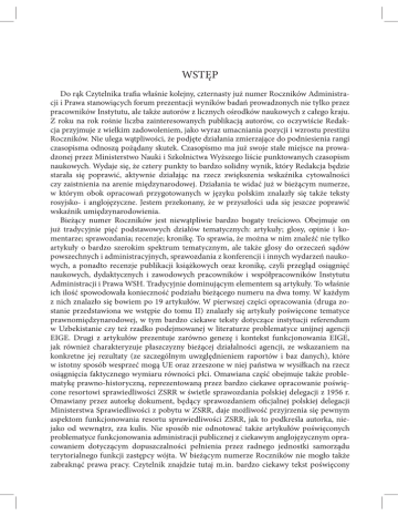 WSTĘP Do rąk Czytelnika trafia właśnie kolejny, czternasty już numer Roczników Administracji i Prawa stanowiących forum prezentacji wyników badań prowadzonych nie tylko przez pracowników Instytutu, ale także autorów z licznych ośrodków naukowych z całego kraju. Z roku na rok rośnie liczba zainteresowanych publikacją autorów, co oczywiście Redakcja przyjmuje z wielkim zadowoleniem, jako wyraz umacniania pozycji i wzrostu prestiżu Roczników. Nie ulega wątpliwości, że podjęte działania zmierzające do podniesienia rangi czasopisma odnoszą pożądany skutek. Czasopismo ma już swoje stałe miejsce na prowadzonej przez Ministerstwo Nauki i Szkolnictwa Wyższego liście punktowanych czasopism naukowych. Wydaje się, że cztery punkty to bardzo solidny wynik, który Redakcja będzie starała się poprawić, aktywnie działając na rzecz zwiększenia wskaźnika cytowalności czy zaistnienia na arenie międzynarodowej. Działania te widać już w bieżącym numerze, w którym obok opracowań przygotowanych w języku polskim znalazły się także teksty rosyjsko- i anglojęzyczne. Jestem przekonany, że w przyszłości uda się jeszcze poprawić wskaźnik umiędzynarodowienia. Bieżący numer Roczników jest niewątpliwie bardzo bogaty treściowo. Obejmuje on już tradycyjnie pięć podstawowych działów tematycznych: artykuły; glosy, opinie i komentarze; sprawozdania; recenzje; kronikę. To sprawia, że można w nim znaleźć nie tylko artykuły o bardzo szerokim spektrum tematycznym, ale także glosy do orzeczeń sądów powszechnych i administracyjnych, sprawozdania z konferencji i innych wydarzeń naukowych, a ponadto recenzje publikacji książkowych oraz kronikę, czyli przegląd osiągnięć naukowych, dydaktycznych i zawodowych pracowników i współpracowników Instytutu Administracji i Prawa WSH. Tradycyjnie dominującym elementem są artykuły. To właśnie ich ilość spowodowała konieczność podziału bieżącego numeru na dwa tomy. W każdym z nich znalazło się bowiem po 19 artykułów. W pierwszej części opracowania (druga zostanie przedstawiona we wstępie do tomu II) znalazły się artykuły poświęcone tematyce prawnomiędzynarodowej, w tym bardzo ciekawe teksty dotyczące instytucji referendum w Uzbekistanie czy też rzadko podejmowanej w literaturze problematyce unijnej agencji EIGE. Drugi z artykułów prezentuje zarówno genezę i kontekst funkcjonowania EIGE, jak również charakteryzuje płaszczyzny bieżącej działalności agencji, ze wskazaniem na konkretne jej rezultaty (ze szczególnym uwzględnieniem raportów i baz danych), które w istotny sposób wesprzeć mogą UE oraz zrzeszone w niej państwa w wysiłkach na rzecz osiągnięcia faktycznego wymiaru równości płci. Omawiana część obejmuje także problematykę prawno-historyczną, reprezentowaną przez bardzo ciekawe opracowanie poświęcone resortowi sprawiedliwości ZSRR w świetle sprawozdania polskiej delegacji z 1956 r. Omawiany przez autorkę dokument, będący sprawozdaniem oficjalnej polskiej delegacji Ministerstwa Sprawiedliwości z pobytu w ZSRR, daje możliwość przyjrzenia się pewnym aspektom funkcjonowania resortu sprawiedliwości ZSRR, jak to podkreśla autorka, niejako od wewnątrz, zza kulis. Nie sposób nie odnotować także artykułów poświęconych problematyce funkcjonowania administracji publicznej z ciekawym anglojęzycznym opracowaniem dotyczącym dopuszczalności pełnienia przez radnego jednostki samorządu terytorialnego funkcji zastępcy wójta. W bieżącym numerze Roczników nie mogło także zabraknąć prawa pracy. Czytelnik znajdzie tutaj m.in. bardzo ciekawy tekst poświęcony 14 ROCZNIKI ADMINISTRACJI I PRAWA. ROK XIV pojęciu wypadku przy pracy rolniczej, w którym autorka konstatuje, że pojęcie rolniczej choroby zawodowej zostało skonstruowane dość restrykcyjnie, co istotnie ogranicza zakres ochrony prawnej, przysługującej rolnikom poszkodowanym wskutek rolniczych wypadków przy pracy postulując jednocześnie powrót do poprzednio istniejącej przesłanki miejsca wystąpienia zdarzenia wypadkowego i uznanie, że związek czasowo-miejscowy lub związek funkcjonalny jest wystarczający dla kwalifikacji danego zdarzenia jako wypadku przy pracy rolniczej. Niezwykle ciekawy jest także artykuł na temat rzadko podejmowanej w literaturze problematyki europejskiego dialogu społecznego jako instytucji zapewniającej związkom zawodowym oraz organizacjom pracodawców możliwość kreowania „twardego” prawa unijnego. Bieżący numer Roczników podejmuje także problematykę prawnopodatkową. Znajdziemy tu m.in. ciekawe opracowanie dotyczące sukcesji prawa do zastosowania się do otrzymanej pisemnej indywidualnej interpretacji przepisów prawa podatkowego. Autorka oprócz zaprezentowania ogólnych rozważań odnośnie do indywidualnych interpretacji prawa podatkowego podjęła próbę udzielenia odpowiedzi na pytanie, w jakich sytuacjach dochodzi do sukcesji praw i obowiązków wynikających z interpretacji podatkowej przy jednoczesnym szerokim potraktowaniu zagadnienia charakteru indywidualnych interpretacji podatkowych, które od lat wywołuje rozbieżne oceny wśród przedstawicieli doktryny i orzecznictwa. W imieniu Redakcji pragnę bardzo serdecznie podziękować recenzentom: prof. dr. hab. Pawłowi Chmielnickiemu (Wyższa Szkoła Informatyki i Zarządzania w Rzeszowie); prof. dr. hab. Leszkowi Mitrusowi (Uniwersytet Jagielloński), prof. dr. hab. Józefowi Ciągwie (Uniwersytet Śląski w Katowicach), prof. dr. hab. Jerzemu Paśnikowi (Wyższa Szkoła Administracyjno-Społeczna w Warszawie) oraz prof. dr. hab. Dariuszowi Szostkowi (Uniwersytet Opolski) za podjęcie trudu recenzji oraz za szczegółowe i życzliwe uwagi merytoryczne zawarte w recenzjach, które w istotny sposób wpłynęły na merytoryczną zawartość prezentowanych Roczników. Biorąc pod uwagę bardzo szeroki wachlarz tematyczny Roczników, mam nadzieję, że
