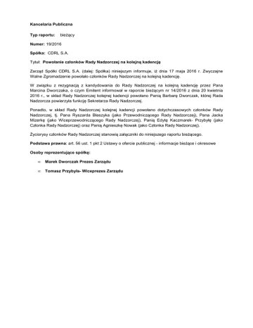 Kancelaria Publiczna Typ raportu: bieżący Numer: 19/2016 Spółka: CDRL S.A. Tytuł: Powołanie członków Rady Nadzorczej na kolejną kadencję Zarząd Spółki CDRL S.A. (dalej: Spółka) niniejszym informuje, iż dnia 17 maja 2016 r. Zwyczajne Walne Zgromadzenie powołało członków Rady Nadzorczej na kolejną kadencję. W związku z rezygnacją z kandydowania do Rady Nadzorczej na kolejną kadencję przez Pana Marcina Dworczaka, o czym Emitent informował w raporcie bieżącym nr 14/2016 z dnia 20 kwietnia 2016 r., w skład Rady Nadzorczej kolejnej kadencji powołano Panią Barbarę Dworczak, której Rada Nadzorcza powierzyła funkcję Sekretarza Rady Nadzorczej. Ponadto, w skład Rady Nadzorczej kolejnej kadencji powołano dotychczasowych członków Rady Nadzorczej, tj. Pana Ryszarda Błaszyka (jako Przewodniczącego Rady Nadzorczej), Pana Jacka Mizerkę (jako Wiceprzewodniczącego Rady Nadzorczej), Panią Edytę Kaczmarek- Przybyłę (jako Członka Rady Nadzorczej) oraz Panią Agnieszkę Nowak (jako Członka Rady Nadzorczej). Życiorysy członków Rady Nadzorczej stanowią załączniki do niniejszego raportu bieżącego. Podstawa prawna: art. 56 ust. 1 pkt 2 Ustawy o ofercie publicznej - informacje bieżące i okresowe Osoby reprezentujące spółkę: • Marek Dworczak Prezes Zarządu • Tomasz Przybyła- Wiceprezes Zarządu Życiorys Ryszard Błaszyk - Przewodniczący Rady Nadzorczej został powołany na okres wspólnej, nowej pięcioletniej kadencji w dniu 17 maja 2016 r. Nowa kadencja upłynie w dniu 17 maja 2021 roku. Mandat Przewodniczącego Rady Nadzorczej wygaśnie zaś z dniem odbycia walnego zgromadzenia zatwierdzającego sprawozdanie finansowe za rok 2020. Pan Ryszard Błaszyk jest absolwentem Uniwersytetu im. Adama Mickiewicza w Poznaniu, Wydział Prawa i Administracji. Dyplom magistra prawa otrzymał w 1977 roku. Jest także absolwentem Podyplomowego Studium Prawa Podatkowego Uniwersytetu Warszawskiego w latach 1985/86. Ukończył liczne kursy i szkolenia (w tym zagraniczne) związane z prawem podatkowym i gospodarczym. Doświadczenie zawodowe: Swoją praktykę zawodową Pan Ryszard Błaszyk rozpoczął w 1968 roku, będąc zatrudniony na coraz wyższych stanowiskach w administracji skarbowej (od stanowiska inspektora do Dyrektora Izby Skarbowej). Po rezygnacji ze stanowiska Dyrektora Izby Skarbowej otworzył własną kancelarię podatkową w Poznaniu (1991 r.) a następnie w 1997 r. uzyskał tytuł doradcy podatkowego (nr wpisu 00004). Pan Ryszard Błaszyk kontynuuje swoją działalność gospodarczą, świadcząc usługi doradztwa podatkowego i obsługi ksiąg rachunkowych. Pan Ryszard Błaszyk nie wykonuje poza przedsiębiorstwem innej działalności, która jest konkurencyjna w stosunku do Emitenta ani nie uczestniczy w spółce konkurencyjnej jako wspólnik spółki cywilnej, spółki osobowej lub jako członek organu spółki kapitałowej ani nie uczestniczy w innej konkurencyjnej osobie prawnej jako członek jej organu. Pan Ryszard Błaszyk nie figuruje w rejestrze dłużników niewypłacalnych, prowadzonym na podstawie ustawy z dnia 20 sierpnia 1997 r. o Krajowym Rejestrze Sądowym. Życiorys Jacek Mizerka - Wiceprzewodniczący Rady Nadzorczej został powołany na okres wspólnej, nowej pięcioletniej kadencji w dniu 17 maja 2016 r. Nowa kadencja upłynie w dniu 17 maja 2021 roku. Mandat Wiceprzewodniczącego Rady Nadzorczej wygaśnie zaś z dniem odbycia walnego zgromadzenia zatwierdzającego sprawozdanie finansowe za rok 2020. Pan Jacek Mizerka jest absolwentem Uniwersytetu Akademii Ekonomicznej w Poznaniu (AEP) - Wydziału Planowania i Zarządzania. Dyplom magistra ekonomii otrzymał w 1983 r., w roku 1992 - stopień doktora nauk ekonomicznych, a w roku 2006 stopień doktora habilitowanego nauk ekonomicznych. Doświadczenie zawodowe: Swoją praktykę zawodową Pan Jacek Piotr Mizerka rozpoczął w 1982 roku w Akademii Ekonomicznej w Poznaniu, a w latach 1982-1993 był zatrudniony w AEP jako pracownik naukowo-techniczny, później asystent, a następnie w latach 1993-1996 w Akademii Rolniczej w Poznaniu jako specjalista (współpraca z Polsko-Amerykańskim Programem Doradztwa Rolniczego), w latach 1996-2008 w AEP na stanowisku adiunkta, a od 2008 – na stanowisku profesora nadzwyczajnego. W roku 2008 został wybrany na stanowisko prorektora ds. finansów i rozwoju na kadencję 2008-2012, a w 2012 ponownie wybrany na stanowisko prorektora ds. edukacji i studentów. Pan Jacek Mizerka nie wykonuje poza przedsiębiorstwem innej działalności, która jest konkurencyjna w stosunku do Emitenta ani nie uczestniczy w spółce konkurencyjnej jako wspólnik spółki cywilnej, spółki osobowej lub jako członek organu spółki kapitałowej ani nie uczestniczy w innej konkurencyjnej osobie prawnej jako członek jej organu. Pan Jacek Mizerka nie figuruje w rejestrze dłużników niewypłacalnych, prowadzonym na podstawie ustawy z dnia 20 sierpnia 1997 r. o Krajowym Rejestrze Sądowym. Życiorys Edyta Kaczmarek Przybyła – Członek Rady Nadzorczej została powołana na okres wspólnej, nowej pięcioletniej kadencji w dniu 17 maja 2016 r. Nowa kadencja upłynie w dniu 17 maja 2021 roku. Mandat Członka Rady Nadzorczej wygaśnie zaś z dniem odbycia walnego zgromadzenia zatwierdzającego sprawozdanie finansowe za rok 2020. Pani Edyta Kaczmarek Przybyła jest absolwentem Akademii Medycznej w Poznaniu Wydziału Lekarskiego. Dyplom lekarza stomatologa otrzymała w 1993 r. Doświadczenie zawodowe: Swoją praktykę zawodową Pani Edyta Kaczmarek-Przybyła rozpoczęła w 1993 roku w Zespole Opieki Zdrowotnej w Kościanie, gdzie była zatrudniona do 1998 jako lekarz stomatolog, a następnie prowadziła prywatny gabinet stomatologiczny, aż do dnia dzisiejszego. Pani Edyta Kaczmarek Przybyła nie wykonuje poza przedsiębiorstwem innej działalności, która jest konkurencyjna w stosunku do Emitenta ani nie uczestniczy w spółce konkurencyjnej jako wspólnik spółki cywilne