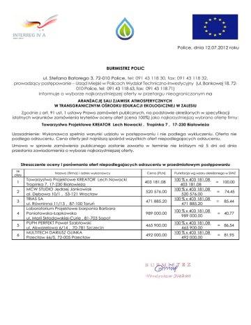 Police, dnia 12.07.2012 roku BURMISTRZ POLIC ul. Stefana Batorego 3, 72-010 Police, tel: 091 43 118 30, fax: 091 43 118 32, prowadzący postępowanie – Urząd Miejski w Policach Wydział Techniczno-Inwestycyjny (ul. Bankowej 18, 72010 Police, tel: 091 43 118 63, fax: 091 43 118 71) informuje o wyborze najkorzystniejszej oferty w przetargu nieograniczonym na ARANŻACJĘ SALI ZJAWISK ATMOSFERYCZNYCH W TRANSGRANICZNYM OŚRODKU EDUKACJI EKOLOGICZNEJ W ZALESIU Zgodnie z art. 91 ust. 1 ustawy Prawo zamówień publicznych, na podstawie określonych w specyfikacji istotnych warunków zamówienia kryteriów oceny ofert (cena 100%) jako najkorzystniejszą wybrano ofertę firmy: Towarzystwo Projektowe KREATOR Lech Nowacki , Tropinka 7 , 17-230 Białowieża Uzasadnienie: Wykonawca spełnia warunki udziału w postępowaniu i nie podlega wykluczeniu. Oferta nie podlega odrzuceniu. Cena oferty jest najniższą spośród wszystkich ofert niepodlegajacych odrzuceniu. Umowa w sprawie zamówienia publicznego zostanie zawarta w terminie nie krótszym niż 5 dni od dnia przesłania zawiadomienia o wyborze najkorzystniejszej oferty. Streszczenie oceny i porównania ofert niepodlegajacych odrzuceniu w przedmiotowym postępowaniu Nr ofery 1 2 3 4 5 6 Nazwa (firma) i adres wykonawcy Towarzystwo Projektowe KREATOR Lech Nowacki Tropinka 7, 17-230 Białowieża MCW STUDIO Jędrzej Jankowiak al. Dębowa 10/1 , 53-121 Wrocław TRIAS SA ul. Równinna 11/13 , 87-100 Toruń Laboratorium Projektowe barponia Barbara Poniatowska-Łapkowska ul. Marii Skłodowskiej-Curie , 81-703 Sopot PUPH PERFEKT Paweł Szabłowski ul. Akwarelowa 6/14 , 70-781 Szczecin MULTITECH DARIUSZ GLINKA Przecław 66/5, 72-005 Przecław Cena [PLN] 403 181,08 520 576,00 471 885,20 989 000,00 465 900,00 492 000,00 Punktacja wg wzoru określonego w SIWZ 100 % x 403 181,08 403 181,08 100 % x 403 181,08 520 576,00 100 % x 403 181,08 471 885,20 100 % x 403 181,08 989 000,00 100 % x 403 181,08 465 900,00 100 % x 403 181,08 492 000,00 = 100,00 = 74,45 = 85,44 = 40,77 = 86,54 = 81,95