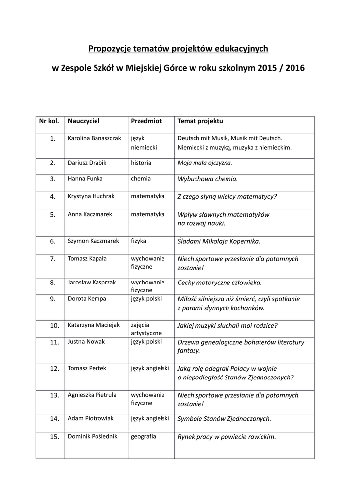 Propozycje tematów projektów edukacyjnych w Zespole Szkół w Miejskiej Górce w roku szkolnym 2015 / 2016 Nr kol. Nauczyciel Przedmiot Temat projektu 1. Karolina Banaszczak język niemiecki Deutsch mit Musik, Musik mit Deutsch. Niemiecki z muzyką, muzyka z niemieckim. 2. Dariusz Drabik historia Moja mała ojczyzna. 3. Hanna Funka chemia Wybuchowa chemia. 4. Krystyna Huchrak matematyka Z czego słyną wielcy matematycy? 5. Anna Kaczmarek matematyka Wpływ sławnych matematyków na rozwój nauki. 6. Szymon Kaczmarek fizyka Śladami Mikołaja Kopernika. 7. Tomasz Kapała wychowanie fizyczne Niech sportowe przesłanie dla potomnych zostanie! 8. Jarosław Kasprzak Cechy motoryczne człowieka. 9. Dorota Kempa wychowanie fizyczne język polski 10. Katarzyna Maciejak Jakiej muzyki słuchali moi rodzice? 11. Justna Nowak zajęcia artystyczne język polski 12. Tomasz Pertek język angielski Jaką rolę odegrali Polacy w wojnie o niepodległość Stanów Zjednoczonych? 13. Agnieszka Pietrula wychowanie fizyczne Niech sportowe przesłanie dla potomnych zostanie! 14. Adam Piotrowiak język angielski Symbole Stanów Zjednoczonych. 15. Dominik Poślednik geografia Rynek pracy w powiecie rawickim. Miłość silniejsza niż śmierć, czyli spotkanie z parami słynnych kochanków. Drzewa genealogiczne bohaterów literatury fantasy. 16. Angelika Ratajczak wychowanie fizyczne Niech sportowe przesłanie dla potomnych zostanie! 17. Rafał Ryś język angielski Kto jest kim w Brytyjskiej rodzinie królewskiej? 18. Renata Stach język polski Od teatru antycznego do teatru współczesnego. 19. Krzysztof Synoracki historia Historia broni na przestrzeni wieków. 20. Krystyna Walkowiak biologia Żyli jak pies z kotem. 21. Karolina Wolny język niemiecki "Mein Traum-Deutschunterricht" - moja wymarzona lekcja języka niemieckiego. 22. Krzysztof Zelek informatyka Wykorzystanie mikrokontrolera do sterowania procesami automatycznymi. Propozycje tematów znajdują się również na szkolnej stronie internetowej www.zsmg.info Koordynator projektów edukacyjnych Renata Stach Dyrektor szkoły Jolanta Hryniowska