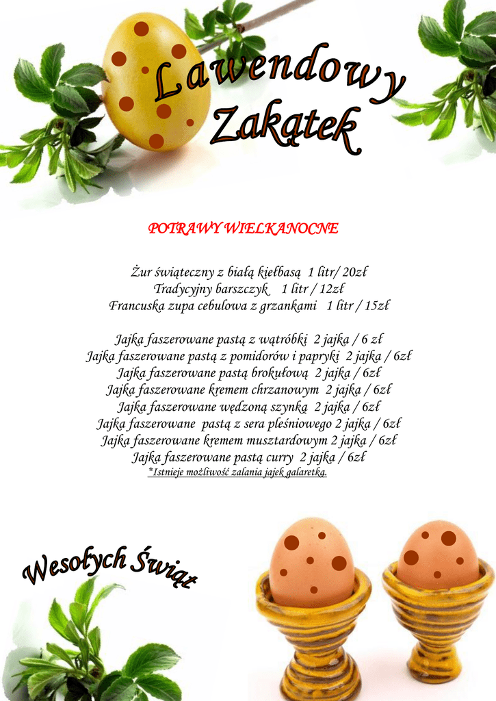 POTRAWY WIELKANOCNE Żur świąteczny z białą kiełbasą 1 litr/ 20zł Tradycyjny barszczyk 1 litr / 12zł Francuska zupa cebulowa z grzankami 1 litr / 15zł Jajka faszerowane pastą z wątróbki 2 jajka / 6 zł Jajka faszerowane pastą z pomidorów i papryki 2 jajka / 6zł Jajka faszerowane pastą brokułową 2 jajka / 6zł Jajka faszerowane kremem chrzanowym 2 jajka / 6zł Jajka faszerowane wędzoną szynką 2 jajka / 6zł Jajka faszerowane pastą z sera pleśniowego 2 jajka / 6zł Jajka faszerowane kremem musztardowym 2 jajka / 6zł Jajka faszerowane pastą curry 2 jajka / 6zł *Istnieje możliwość zalania jajek galaretką. Jajko na sałatce jarzynowej 150g / 9zł Sałatka jarzynowa 150g / 8 zł Sałatka pieczarkowa 100g / 4zl Sałatka śledziowa 100g / 5zł Kruche babeczki nadziewane pastą chrzanowa i łososiem wędzonym 1 szt / 3zł Sos tatarski 100g / 6zł Szynka pieczona 1kg / 35zł Szynka gotowana 1 kg / 35zł Szynka gotowana z chrzanem polana galaretką 100g / 4zł Karkówka pieczona szpikowana czosnkiem 1kg / 30zł Świąteczny pasztet własnej roboty 1 kg / 28zł Pasztet z królika z bakaliami 1 kg / 35zł Bigos 1 kg / 22zł Schab w galarecie 100g / 5zł Dorsz po grecku 1 porcja / 6zł (100g ryby) Galantyna z kurczaka w galarecie 1 porcja / 4zł (100g) Tatar z łososia na pumperniklu i liściach rukoli 1 porcja 6zł Mazurki 1 szt / 16zł Pascha wielkanocna 1 szt / 25zł Babka cytrynowa 1 szt / 25zł Makowiec 1kg / 25zł Sernik 1kg/29zł RESTAURACJA LAWENDOWY ZAKĄTEK KARWIEŃSKIE BŁOTA II UL. WCZASOWA 197 e-mail: [email protected] ZAMÓWIENIA: TEL. 502070763