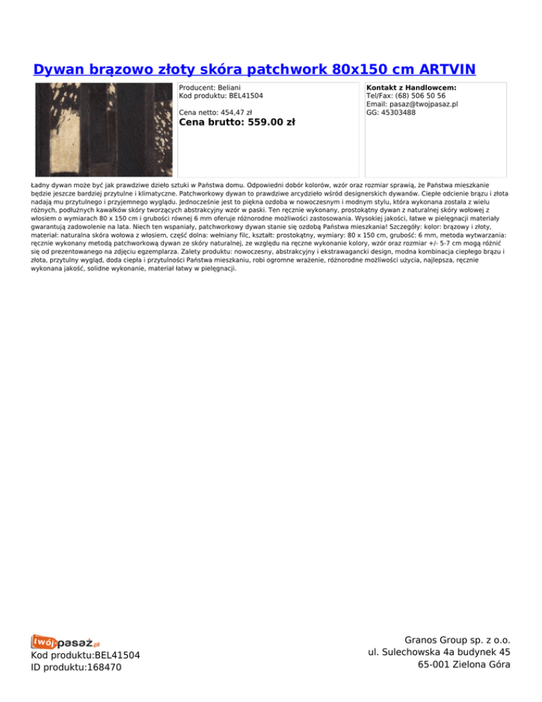 Dywan brązowo złoty skóra patchwork 80x150 cm ARTVIN Producent: Beliani Kod produktu: BEL41504 Cena netto: 454,47 zł Kontakt z Handlowcem: Tel/Fax: (68) 506 50 56 Email: [email protected] GG: 45303488 Cena brutto: 559.00 zł Ładny dywan może być jak prawdziwe dzieło sztuki w Państwa domu. Odpowiedni dobór kolorów, wzór oraz rozmiar sprawią, że Państwa mieszkanie będzie jeszcze bardziej przytulne i klimatyczne. Patchworkowy dywan to prawdziwe arcydzieło wśród designerskich dywanów. Ciepłe odcienie brązu i złota nadają mu przytulnego i przyjemnego wyglądu. Jednocześnie jest to piękna ozdoba w nowoczesnym i modnym stylu, która wykonana została z wielu różnych, podłużnych kawałków skóry tworzących abstrakcyjny wzór w paski. Ten ręcznie wykonany, prostokątny dywan z naturalnej skóry wołowej z włosiem o wymiarach 80 x 150 cm i grubości równej 6 mm oferuje różnorodne możliwości zastosowania. Wysokiej jakości, łatwe w pielęgnacji materiały gwarantują zadowolenie na lata. Niech ten wspaniały, patchworkowy dywan stanie się ozdobą Państwa mieszkania! Szczegóły: kolor: brązowy i złoty, materiał: naturalna skóra wołowa z włosiem, część dolna: wełniany filc, kształt: prostokątny, wymiary: 80 x 150 cm, grubość: 6 mm, metoda wytwarzania: ręcznie wykonany metodą patchworkową dywan ze skóry naturalnej, ze względu na ręczne wykonanie kolory, wzór oraz rozmiar +/- 5-7 cm mogą różnić się od prezentowanego na zdjęciu egzemplarza. Zalety produktu: nowoczesny, abstrakcyjny i ekstrawagancki design, modna kombinacja ciepłego brązu i złota, przytulny wygląd, doda ciepła i przytulności Państwa mieszkaniu, robi ogromne wrażenie, różnorodne możliwości użycia, najlepsza, ręcznie wykonana jakość, solidne wykonanie, materiał łatwy w pielęgnacji. Kod produktu:BEL41504 ID produktu:168470 Granos Group sp. z o.o. ul. Sulechowska 4a budynek 45 65-001 Zielona Góra