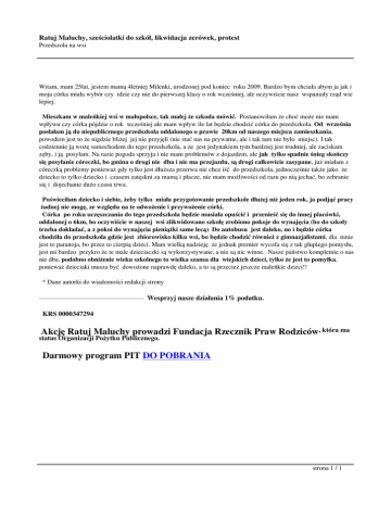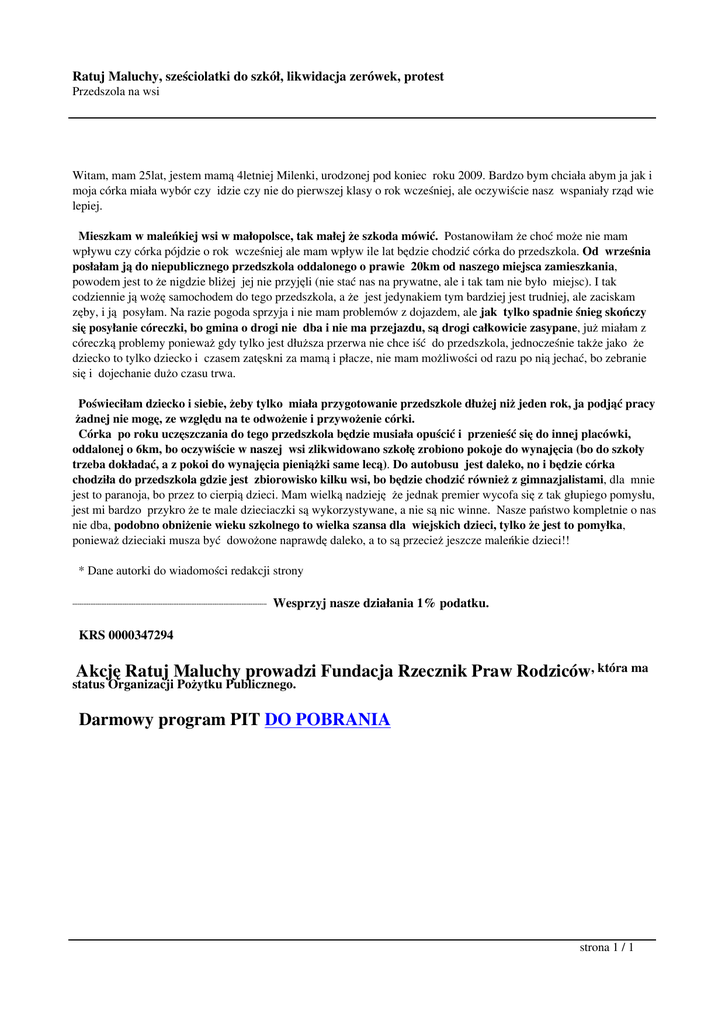 Ratuj Maluchy, sześciolatki do szkół, likwidacja zerówek, protest Przedszola na wsi Witam, mam 25lat, jestem mamą 4letniej Milenki, urodzonej pod koniec roku 2009. Bardzo bym chciała abym ja jak i moja córka miała wybór czy idzie czy nie do pierwszej klasy o rok wcześniej, ale oczywiście nasz wspaniały rząd wie lepiej. Mieszkam w maleńkiej wsi w małopolsce, tak małej że szkoda mówić. Postanowiłam że choć może nie mam wpływu czy córka pójdzie o rok wcześniej ale mam wpływ ile lat będzie chodzić córka do przedszkola. Od września posłałam ją do niepublicznego przedszkola oddalonego o prawie 20km od naszego miejsca zamieszkania, powodem jest to że nigdzie bliżej jej nie przyjęli (nie stać nas na prywatne, ale i tak tam nie było miejsc). I tak codziennie ją wożę samochodem do tego przedszkola, a że jest jedynakiem tym bardziej jest trudniej, ale zaciskam zęby, i ją posyłam. Na razie pogoda sprzyja i nie mam problemów z dojazdem, ale jak tylko spadnie śnieg skończy się posyłanie córeczki, bo gmina o drogi nie dba i nie ma przejazdu, są drogi całkowicie zasypane, już miałam z córeczką problemy ponieważ gdy tylko jest dłuższa przerwa nie chce iść do przedszkola, jednocześnie także jako że dziecko to tylko dziecko i czasem zatęskni za mamą i płacze, nie mam możliwości od razu po nią jechać, bo zebranie się i dojechanie dużo czasu trwa. Poświeciłam dziecko i siebie, żeby tylko miała przygotowanie przedszkole dłużej niż jeden rok, ja podjąć pracy żadnej nie mogę, ze względu na te odwożenie i przywożenie córki. Córka po roku uczęszczania do tego przedszkola będzie musiała opuścić i przenieść się do innej placówki, oddalonej o 6km, bo oczywiście w naszej wsi zlikwidowano szkołę zrobiono pokoje do wynajęcia (bo do szkoły trzeba dokładać, a z pokoi do wynajęcia pieniążki same lecą). Do autobusu jest daleko, no i będzie córka chodziła do przedszkola gdzie jest zbiorowisko kilku wsi, bo będzie chodzić również z gimnazjalistami, dla mnie jest to paranoja, bo przez to cierpią dzieci. Mam wielką nadzieję że jednak premier wycofa się z tak głupiego pomysłu, jest mi bardzo przykro że te male dzieciaczki są wykorzystywane, a nie są nic winne. Nasze państwo kompletnie o nas nie dba, podobno obniżenie wieku szkolnego to wielka szansa dla wiejskich dzieci, tylko że jest to pomyłka, ponieważ dzieciaki musza być dowożone naprawdę daleko, a to są przecież jeszcze maleńkie dzieci!! * Dane autorki do wiadomości redakcji strony ------------------------------------------------------------------------------------------------------------ Wesprzyj nasze działania 1% podatku. KRS 0000347294 Akcję Ratuj Maluchy prowadzi Fundacja Rzecznik Praw Rodziców, która ma status Organizacji Pożytku Publicznego. Darmowy program PIT DO POBRANIA strona 1 / 1