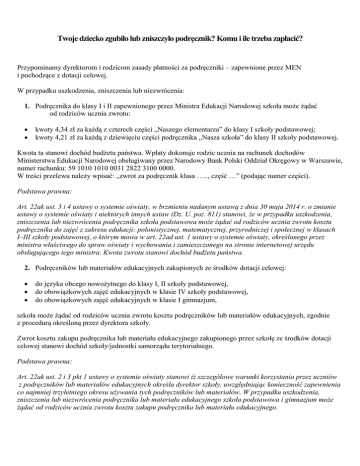 Twoje dziecko zgubiło lub zniszczyło podręcznik? Komu i ile trzeba zapłacić? Przypominamy dyrektorom i rodzicom zasady płatności za podręczniki – zapewnione przez MEN i pochodzące z dotacji celowej. W przypadku uszkodzenia, zniszczenia lub niezwrócenia: 1. Podręcznika do klasy I i II zapewnionego przez Ministra Edukacji Narodowej szkoła może żądać od rodziców ucznia zwrotu: kwoty 4,34 zł za każdą z czterech części „Naszego elementarza” do klasy I szkoły podstawowej; kwoty 4,21 zł za każdą z dziewięciu części podręcznika „Nasza szkoła” do klasy II szkoły podstawowej. Kwota ta stanowi dochód budżetu państwa. Wpłaty dokonuje rodzic ucznia na rachunek dochodów Ministerstwa Edukacji Narodowej obsługiwany przez Narodowy Bank Polski Oddział Okręgowy w Warszawie, numer rachunku: 59 1010 1010 0031 2822 3100 0000. W treści przelewu należy wpisać: „zwrot za podręcznik klasa ….., część …” (podając numer części). Podstawa prawna: Art. 22ak ust. 3 i 4 ustawy o systemie oświaty, w brzmieniu nadanym ustawą z dnia 30 maja 2014 r. o zmianie ustawy o systemie oświaty i niektórych innych ustaw (Dz. U. poz. 811) stanowi, że w przypadku uszkodzenia, zniszczenia lub niezwrócenia podręcznika szkoła podstawowa może żądać od rodziców ucznia zwrotu kosztu podręcznika do zajęć z zakresu edukacji: polonistycznej, matematycznej, przyrodniczej i społecznej w klasach I–III szkoły podstawowej, o którym mowa w art. 22ad ust. 1 ustawy o systemie oświaty, określonego przez ministra właściwego do spraw oświaty i wychowania i zamieszczonego na stronie internetowej urzędu obsługującego tego ministra. Kwota zwrotu stanowi dochód budżetu państwa. 2. Podręczników lub materiałów edukacyjnych zakupionych ze środków dotacji celowej: do języka obcego nowożytnego do klasy I, II szkoły podstawowej, do obowiązkowych zajęć edukacyjnych w klasie IV szkoły podstawowej, do obowiązkowych zajęć edukacyjnych w klasie I gimnazjum, szkoła może żądać od rodziców ucznia zwrotu kosztu podręczników lub materiałów edukacyjnych, zgodnie z procedurą określoną przez dyrektora szkoły. Zwrot kosztu zakupu podręcznika lub materiału edukacyjnego zakupionego przez szkołę ze środków dotacji celowej stanowi dochód szkoły/jednostki samorządu terytorialnego. Podstawa prawna: Art. 22ak ust. 2 i 3 pkt 1 ustawy o systemie oświaty stanowi iż szczegółowe warunki korzystania przez uczniów z podręczników lub materiałów edukacyjnych określa dyrektor szkoły, uwzględniając konieczność zapewnienia co najmniej trzyletniego okresu używania tych podręczników lub materiałów. W przypadku uszkodzenia, zniszczenia lub niezwrócenia podręcznika lub materiału edukacyjnego szkoła podstawowa i gimnazjum może żądać od rodziców ucznia zwrotu kosztu zakupu podręcznika lub materiału edukacyjnego.