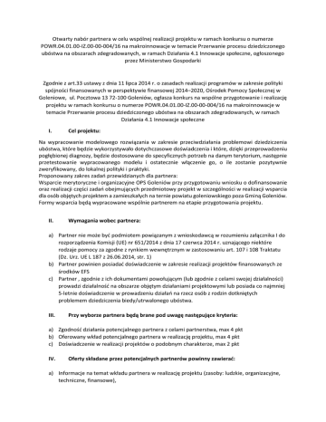 Otwarty nabór partnera w celu wspólnej realizacji projektu w ramach konkursu o numerze POWR.04.01.00-IZ.00-00-004/16 na makroinnowacje w temacie Przerwanie procesu dziedziczonego ubóstwa na obszarach zdegradowanych, w ramach Działania 4.1 Innowacje społeczne, ogłoszonego przez Ministerstwo Gospodarki Zgodnie z art.33 ustawy z dnia 11 lipca 2014 r. o zasadach realizacji programów w zakresie polityki spójności finansowanych w perspektywie finansowej 2014–2020, Ośrodek Pomocy Społecznej w Goleniowe, ul. Pocztowa 13 72-100 Goleniów, ogłasza konkurs na wspólne przygotowanie i realizację projektu w ramach konkursu o numerze POWR.04.01.00-IZ.00-00-004/16 na makroinnowacje w temacie Przerwanie procesu dziedziczonego ubóstwa na obszarach zdegradowanych, w ramach Działania 4.1 Innowacje społeczne I. Cel projektu: Na wypracowanie modelowego rozwiązania w zakresie przeciwdziałania problemowi dziedziczenia ubóstwa, które będzie wykorzystywało dotychczasowe doświadczenia i które, dzięki przeprowadzeniu pogłębionej diagnozy, będzie dostosowane do specyficznych potrzeb na danym terytorium, następnie przetestowanie wypracowanego modelu i ostatecznie włączenie go, o ile zostanie pozytywnie zweryfikowany, do lokalnej polityki i praktyki. Proponowany zakres zadań przewidzianych dla partnera: Wsparcie merytoryczne i organizacyjne OPS Goleniów przy przygotowaniu wniosku o dofinansowanie oraz realizacji części zadań obejmujących przedmiotowy projekt w szczególności w realizacji wsparcia dla osób objętych projektem a zamieszkałych na ternie powiatu goleniowskiego poza Gminą Goleniów. Formy wsparcia będą wypracowane wspólnie partnerem na etapie przygotowania projektu. II. Wymagania wobec partnera: a) Partner nie może być podmiotem powiązanym z wnioskodawcą w rozumieniu załącznika I do rozporządzenia Komisji (UE) nr 651/2014 z dnia 17 czerwca 2014 r. uznającego niektóre rodzaje pomocy za zgodne z rynkiem wewnętrznym w zastosowaniu art. 107 i 108 Traktatu (Dz. Urz. UE L 187 z 26.06.2014, str. 1) b) Partner powinien posiadać doświadczenie w zakresie realizacji projektów finansowanych ze środków EFS c) Partner , zgodnie z ich dokumentami powołującym (lub zgodnie z celami swojej działalności) prowadzi działalność na obszarze objętym działaniami projektowymi lub posiada co najmniej 5-letnie doświadczenie w prowadzeniu działań na rzecz osób z rodzin dotkniętych problemem dziedziczenia biedy/utrwalonego ubóstwa. III. Przy wyborze partnera będą brane pod uwagę następujące kryteria: a) Zgodność działania potencjalnego partnera z celami partnerstwa, max 4 pkt b) Oferowany wkład potencjalnego partnera w realizację projektu, max 4 pkt c) Doświadczenie w realizacji projektów o podobnym charakterze, max 2 pkt IV. Oferty składane przez potencjalnych partnerów powinny zawierać: a) Informacje na temat wkładu partnera w realizację projektu (zasoby: ludzkie, organizacyjne, techniczne, finansowe), b) Zaprezentowanie koncepcji realizacji wymienionych zadań przewidzianych dla partnera; c) Opis doświadczenia w pozyskaniu i realizacji projektów finansowanych z EFS w zakresie edukacji V. Oferty składane przez potencjalnych partnerów powinny: a) być sporządzone w języku polskim; b) zawierać dokumenty potwierdzające status prawny oferenta i umocowanie osób go reprezentujących; c) zawierać pisemne oświadczenie o nie zaleganiu z płatnościami na rzecz podmiotów publiczno-prywatnych, ani wobec innych podmiotów; d) zawierać stosowne oświadczenia o posiadaniu potencjału (prawnego, organizacyjnego i merytorycznego) do realizacji proponowanych działań, e) zawierać pisemne oświadczenie, iż potencjalny partner jest podmiotem uprawnionym do ubiegania się o dofinansowanie zgodnie z typem beneficjentów wskazanym w RPO WP 20142020 oraz doprecyzowanym w Szczegółowym Opisie Osi Priorytetowych RPO WP 2014-2020. f) zawierać pisemne oświadczenie, iż potencjalny partner nie podlega wykluczeniu z możliwości ubiegania się o dofinansowanie na podstawie odrębnych przepisów, w szczególności: art. 207 ust. 4 ustawy z dnia 27 sierpnia 2009 r. o finansach publicznych (t.j. Dz. U. 2013 r., poz. 885 z późn. zm.); art. 12 ust. 1 pkt 1 ustawy z dnia 15 czerwca 2012 r. o skutkach powierzania wykonywania pracy cudzoziemcom przebywającym wbrew przepisom na terytorium Rzeczypospolitej Polskiej (Dz. U. poz. 769 z późn. zm.); art. 9 ust. 1 pkt 2a ustawy z dnia 28 października 2002 r. o odpowiedzialności podmiotów zbiorowych za czyny zabronione pod groźbą kary (t.j. Dz. U. z 2014 r., poz. 1417). VI. Termin i tryb rozpatrzenia ofert: a) Oferty zostaną rozpatrzone najpóźniej w terminie 2 dni od daty zakończenia naboru przez Zespół Oceniający powołany przez Dyrektora Ośrodka Pomocy Społecznej w Goleniowie b) Na podstawie opinii wydanej przez Zespół Dyrektor Ośrodka Pomocy Społecznej w Goleniowie dokona wyboru podmiotu, z którym zostanie zawarta umowa partnerska. c) Od decyzji Dyrektora nie przysługuje odwołanie. d) Oferty złożone po upływie wyznaczonego terminu nie będą rozpatrywane w konkursie. VII. Sposób i termin składania ofert: a) Wypełnione i opatrzone podpisem osoby upoważnionej dokumenty należy składać w zamkniętej kopercie w formie pisemnej, osobiście lub za pośrednictwem poczty tradycyjnej na adres: Ośrodek Pomocy Społecznej w Goleniowe, ul. Pocztowa 13 72100 Goleniów z dopiskiem: „Nabór partnera w celu wspólnej realizacji projektu w ramach naboru POWR.04.01.00-IZ.00-00-004/16 na makroinnowacje w temacie Przerwanie procesu dziedziczonego ubóstwa na obszarach zdegradowanych ” b) Zgłoszenia należy składać w nieprzekraczalnym terminie 21 dni od dnia publikacji ogłoszenia o konkursie, to jest do dnia 16 maja 2016r. Informacje telefoniczne 091 460 14 72, Zbigniew Łukaszewski Ogłaszający zastrzega sobie prawo do negocjowania warunków realizacji zadania oraz do unieważnienia naboru