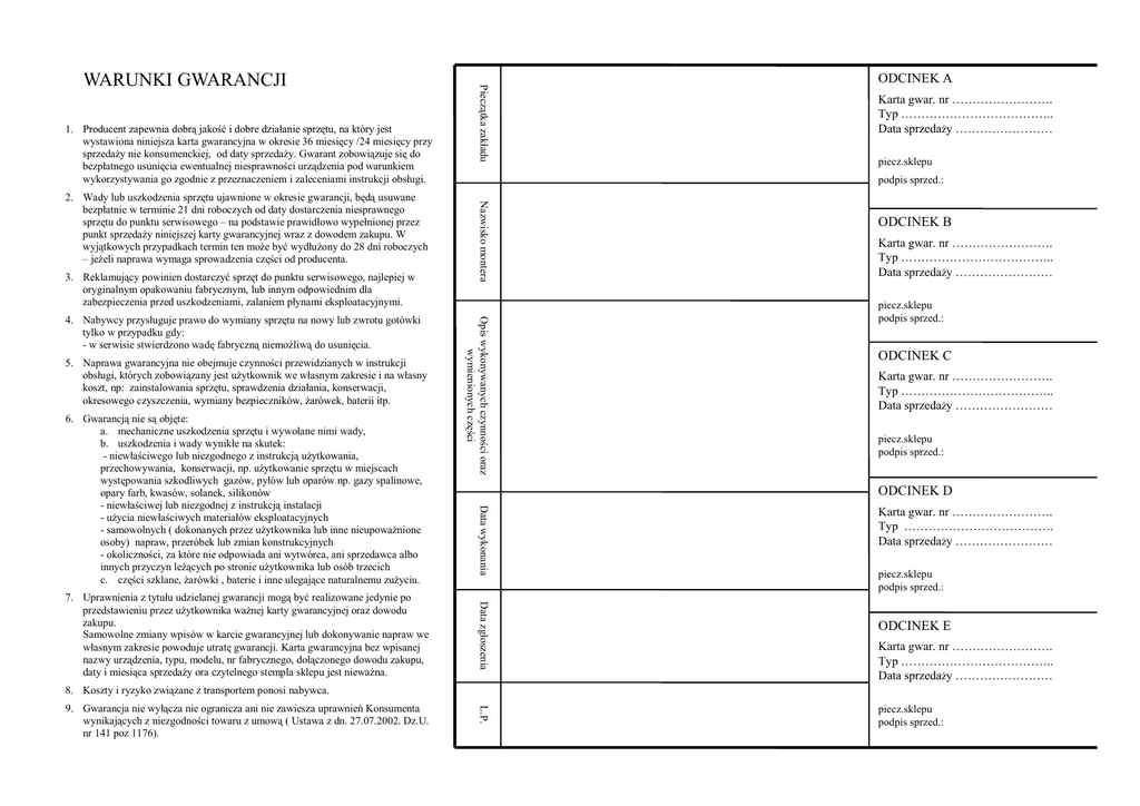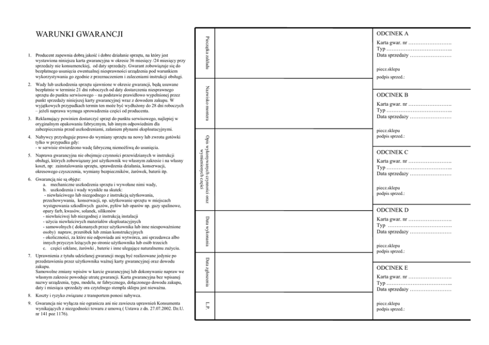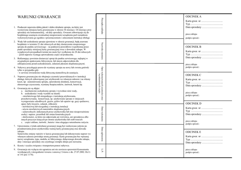 1 Producent zapewnia dobrą jakość i dobre działanie sprzętu, 1. sprzętu na który jest wystawiona niniejsza karta gwarancyjna w okresie 36 miesięcy /24 miesięcy przy sprzedaży nie konsumenckiej, od daty sprzedaży. Gwarant zobowiązuje się do bezpłatnego usunięcia ewentualnej niesprawności urządzenia pod warunkiem wykorzystywania go zgodnie z przeznaczeniem i zaleceniami instrukcji obsługi. 3. Reklamujący powinien dostarczyć sprzęt do punktu serwisowego, najlepiej w oryginalnym opakowaniu fabrycznym, lub innym odpowiednim dla zabezpieczenia przed uszkodzeniami, zalaniem płynami eksploatacyjnymi. 5. Naprawa gwarancyjna nie obejmuje czynności przewidzianych w instrukcji obsługi, których zobowiązany jest użytkownik we własnym zakresie i na własny koszt, np: zainstalowania sprzętu, sprawdzenia działania, konserwacji, okresowego czyszczenia, czyszczenia wymiany bezpieczników, bezpieczników żarówek żarówek, baterii itp. itp Data zgłoszenia 7. Uprawnienia z tytułu udzielanej gwarancji mogą być realizowane jedynie po przedstawieniu przez użytkownika ważnej karty gwarancyjnej oraz dowodu zakupu. Samowolne zmiany wpisów w karcie gwarancyjnej lub dokonywanie napraw we własnym zakresie powoduje utratę gwarancji. Karta gwarancyjna bez wpisanej nazwy urządzenia, typu, modelu, nr fabrycznego, dołączonego dowodu zakupu, ą sprzedaży p y ora czytelnego y g stempla p sklepu p jjest nieważna. datyy i miesiąca Karta gwar. nr ……………………. Typ ……………………………….. Data sprzedaży …………………… piecz.sklepu ODCINEK B Karta gwar. nr ……………………. Typ ……………………………….. Data sprzedaży …………………… p piecz.sklepu p podpis sprzed.: ODCINEK C Karta gwar. nr ……………………. Typ ……………………………….. D t sprzeda Data d ży …………………… piecz.sklepu podpis sprzed.: ODCINEK D Data wykonania 6. Gwarancją nie są objęte: a. mechaniczne uszkodzenia sprzętu i wywołane nimi wady, b. uszkodzenia i wady wynikłe na skutek: - niewłaściwego lub niezgodnego z instrukcją użytkowania, przechowywania, konserwacji, np. użytkowanie sprzętu w miejscach występowania szkodliwych gazów, pyłów lub oparów np. gazy spalinowe, opary farb, farb kwasów, kwasów solanek solanek, silikonów - niewłaściwej lub niezgodnej z instrukcją instalacji - użycia niewłaściwych materiałów eksploatacyjnych - samowolnych ( dokonanych przez użytkownika lub inne nieupoważnione osoby) napraw, przeróbek lub zmian konstrukcyjnych - okoliczności, za które nie odpowiada ani wytwórca, ani sprzedawca albo innych przyczyn leżących po stronie użytkownika lub osób trzecich ę szklane, żarówki , baterie i inne ulegające g ją naturalnemu zużyciu. y c. części Opis wykonywanych czynności oraz wymieniony ych części 4. Nabywcy przysługuje prawo do wymiany sprzętu na nowy lub zwrotu gotówki tylko w przypadku gdy: - w serwisie stwierdzono wadę fabryczną niemożliwą do usunięcia. ODCINEK A podpis sprzed.: Nazw wisko montera 2. Wady lub uszkodzenia sprzętu ujawnione w okresie gwarancji, będą usuwane bezpłatnie w terminie 21 dni roboczych od daty dostarczenia niesprawnego sprzętu t do d punktu kt serwisowego i – na podstawie d t i prawidłowo idł wypełnionej ł i j przez punkt sprzedaży niniejszej karty gwarancyjnej wraz z dowodem zakupu. W wyjątkowych przypadkach termin ten może być wydłużony do 28 dni roboczych – jeżeli naprawa wymaga sprowadzenia części od producenta. Pieczątka zakładu WARUNKI GWARANCJI Karta gwar. nr ……………………. Typ ………………………………. Data sprzedaży …………………… piecz.sklepu podpis d i sprzed.: d ODCINEK E Karta gwar. nr ……………………. Typ ……………………………….. Data sprzedaży …………………… 8. Koszty i ryzyko związane z transportem ponosi nabywca. L.P. 9. Gwarancja nie wyłącza nie ogranicza ani nie zawiesza uprawnień Konsumenta wynikających z niezgodności towaru z umową ( Ustawa z dn. 27.07.2002. Dz.U. nr 141 poz 1176). piecz.sklepu podpis sprzed.: Wymontowano zespół: Lista autoryzowanych punktów serwisowych LEGNICA Naprawa Sprzętu AGD ul.Kasjopei 15 tel 0 76 854 48 33 tel.0 RADOM PTUiH”ELDOM” ul.Złota 14 t l 0 48 365 08 13 tel.0 LUBLIN „Twój Serwis” ul.Żołnierska 8 tel.0 81 740 12 40 RUDA LĄSKA Ś TELE-VIDEO-SERWIS ul.Piastowska 8/9 tel.0 32 248 07 86 tel.0 32 771 24 09 BYDGOSZCZ TV COLOR Serwis S.C. ul Marii Skłodowskiej Curie 33A ul.Marii tel.0 52 342 87 43 LUBIN Naprawa Sprzętu AGD Michał Lasz ul Karkonowska 1C ul.Karkonowska tel.0 76 844 12 12 RZESZÓW SERWIS GASTRO-TECH ul.Dąbrowskiego l Dąbro skiego 44 tel.0 17 853 31 48 CZĘSTOCHOWA „Ewex-Serwis” ul.Św.Rocha 108 tel.0 34 324 89 60 ŁÓDŹ ZHU „WANDEX” ul.Ciołkowskiego 5B tel.0 42 681 22 33 RZESZÓW AZU Tech-Dom ul.Brzozowa 2 tel.0 17 854 16 15 GDAŃSK EURO-SERWIS ul Gdyńska 4 ul.Gdyńska tel.0 58 557 97 72 MYSŁOWICE FUH Naprawa Sprzętu AGD „MORS MORS” ul.Szopena 6 tel.0 32 222 37 27 SŁUPSK PHU ARGED ul Piłsudskiego 7B ul.Piłsudskiego tel.0 59 843 54 88 BIAŁYSTOK Zakład Usługowy AGD i RTV S.C. ul.Krucza lK 6 tel. 085 745 39 29 …………………. …………………. (data) (pieczęć i podpis) Wymontowano y zespół: p …………………. …………………. (data) (pieczęć i podpis) Wymontowano zespół: BIELSKO BIAŁA PRB „Jawar” ul.Krasińskiego 30 tel.0 33 816 80 13 KATOWICE FHU ARGED al.Korfantego 78 tel.0 32 258 50 45 KĘDZIERZYN KOŹLE ZUH DOMATOR DOMATOR-SERVICE SERVICE S S.C C ul.Łokietka 2 tel.0 77 483 37 54 …………………. …………………. (data) (pieczęć i podpis) Wymontowano zespół: KONIN ARDOM SERWIS ul.3MAJA 33 tel.0 63 242 34 70 KOSZALIN OSTROWSKI PPHU ul.Zgoda 11/13 tel.0 602 524 247 KIELCE PPUH”EDAN” ul.Zagórska 46 tel.0 41 344 16 53 …………………. …………