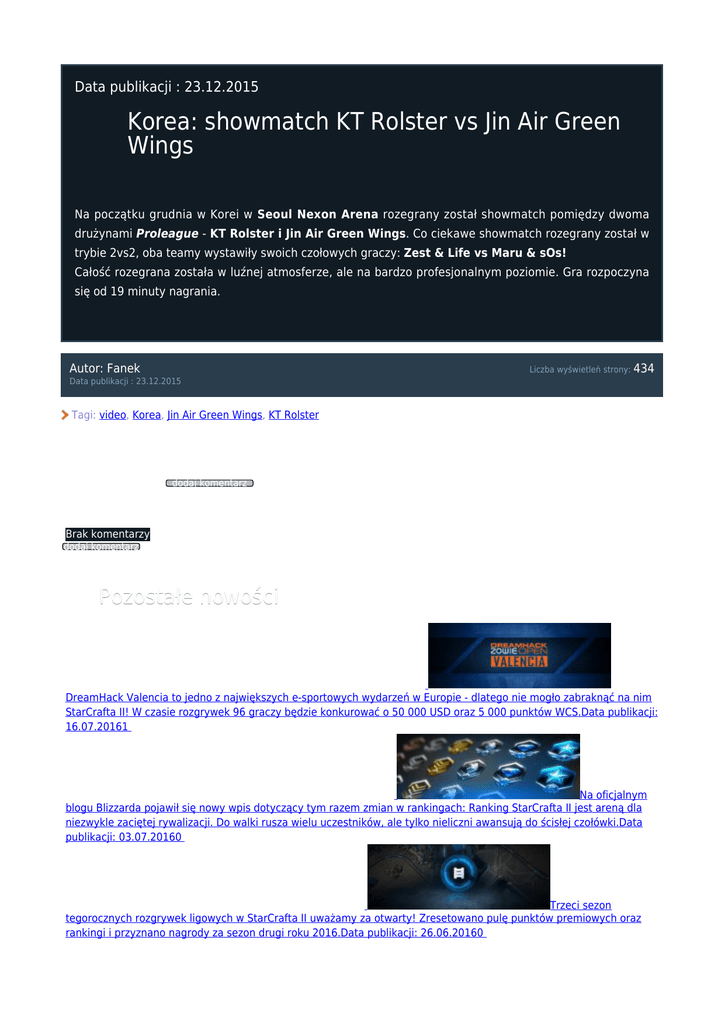 Data publikacji : 23.12.2015 Korea: showmatch KT Rolster vs Jin Air Green Wings Na początku grudnia w Korei w Seoul Nexon Arena rozegrany został showmatch pomiędzy dwoma drużynami Proleague - KT Rolster i Jin Air Green Wings. Co ciekawe showmatch rozegrany został w trybie 2vs2, oba teamy wystawiły swoich czołowych graczy: Zest & Life vs Maru & sOs! Całość rozegrana została w luźnej atmosferze, ale na bardzo profesjonalnym poziomie. Gra rozpoczyna się od 19 minuty nagrania. Autor: Fanek Liczba wyświetleń strony: 434 Data publikacji : 23.12.2015 Tagi: video, Korea, Jin Air Green Wings, KT Rolster Komentarz (0) dodaj komentarz Brak komentarzy dodaj komentarz Pozostałe nowości DreamHack Open: Valencia 2016 - Nerchio w półfinale - live! DreamHack Valencia to jedno z największych e-sportowych wydarzeń w Europie - dlatego nie mogło zabraknąć na nim StarCrafta II! W czasie rozgrywek 96 graczy będzie konkurować o 50 000 USD oraz 5 000 punktów WCS.Data publikacji: 16.07.20161 Aktualizacja 3.4 – Duże zmiany w rankingu StarCrafta II Na oficjalnym blogu Blizzarda pojawił się nowy wpis dotyczący tym razem zmian w rankingach: Ranking StarCrafta II jest areną dla niezwykle zaciętej rywalizacji. Do walki rusza wielu uczestników, ale tylko nieliczni awansują do ścisłej czołówki.Data publikacji: 03.07.20160 Rozpoczęcie trzeciego sezonu rankingowego 2016 Trzeci sezon tegorocznych rozgrywek ligowych w StarCrafta II uważamy za otwarty! Zresetowano pulę punktów premiowych oraz rankingi i przyznano nagrody za sezon drugi roku 2016.Data publikacji: 26.06.20160 Filmowy „Warcraft” już wkrótce w księgarniach! Powieść „Warcraft”, której wydanie zbiega się z polską premierą filmu „Warcraft. Początek” w reżyserii Duncana Jonesa, do księgarń trafi już 15 czerwca. Na kartach książki czytelnicy wkroczą w nowy wymiar emocji towarzyszących bohaterom fikcyjnych światów Azeroth i Draenor. Za sprawą Christie Golden, pisarki od lat cenionej przez fanów świata Warcraft, konflikt ludzi i orków nabierze jeszcze większej intensywności.Data publikacji: 13.06.20160 Blokada obecnego sezonu i darmowa zmiana nazwy postaci Jak czytamy na oficjalnym blogu Blizzarda: Obecny sezon rankingowy zbliża się ku końcowi i wkrótce zamknięte zostaną wszystkie ligi i dywizje. Kilka dni przed rozpoczęciem nowego sezonu, darmowa zmiana nazwy postaci w StarCraft II zostanie ponownie dodana do wszystkich kont, dla których funkcja ta nie jest obecnie dostępna.Data publikacji: 12.06.20160 Wszystkie nowości
