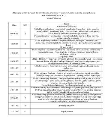 Plan seminariów/ćwiczeń dla przedmiotu Anatomia