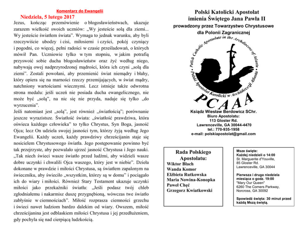 Komentarz do Ewangelii Niedziela, 5 lutego 2017 Jezus, kończąc przemówienie o błogosławieństwach, ukazuje zarazem wielkość swoich uczniów: „Wy jesteście solą dla ziemi... Wy jesteście światłem świata”. Wymaga to jednak warunku, aby byli rzeczywiście ubodzy i cisi, miłosierni i czyści, pokój czyniący i pogodni, co więcej, pełni radości w czasie prześladowań, o których mówił Pan. Uczniowie tylko w tym stopniu, w jakim potrafią przyswoić sobie ducha błogosławieństw oraz żyć według niego, nabywają owej nadprzyrodzonej mądrości, która ich czyni „solą dla ziemi”. Zostali powołani, aby przemienić świat niemądry i błahy, który opiera się na marności rzeczy przemijających, w świat mądry, natchniony wartościami wiecznymi. Lecz istnieje także odwrotna strona medalu: jeśli uczeń nie posiada ducha ewangelicznego, nie może być „solą”, na nic się nie przyda, nadaje się tylko „do wyrzucenia”. Jeśli natomiast jest „solą”, jest również „światłością”; porównanie jeszcze wyrazistsze. Światłość świata: „światłość prawdziwa, która oświeca każdego człowieka” to tylko Chrystus, Syn Boga, jasność Ojca; lecz On udziela swojej jasności tym, którzy żyją według Jego Ewangelii. Każdy uczeń, każdy prawdziwy chrześcijanin staje się nosicielem Chrystusowego światła. Jego postępowanie powinno być tak przejrzyste, aby pozwalało ujrzeć jasność Chrystusa i Jego nauki. „Tak niech świeci wasze światło przed ludźmi, aby widzieli wasze dobre uczynki i chwalili Ojca waszego, który jest w niebie”. Dzieła dokonane w prawdzie i miłości Chrystusa, są światłem zapalonym na świeczniku, aby świeciło „wszystkim, którzy są w domu” i pociągało ich do wiary i miłości. Również Stary Testament ukazuje uczynki miłości jako przekaźniki światła: „Jeśli podasz twój chleb zgłodniałemu i nakarmisz duszę przygnębioną, wówczas twe światło zabłyśnie w ciemnościach”. Miłość rozprasza ciemności grzechu i świeci nawet ludziom bardzo dalekim od wiary. Owszem, miłość chrześcijanina jest odblaskiem miłości Chrystusa i jej przedłużeniem, gdy pochyla się nad cierpiącą ludzkością. Polski Katolicki Apostolat imienia Świętego Jana Pawła II prowadzony przez Towarzystwo Chrystusowe dla Polonii Zagranicznej Ksiądz Wiesław Berdowicz SChr. Biuro Apostolatu: 113 Gloster Rd. Lawrenceville, GA 30044-4470 tel.: 770-935-1958 e-mail: [email protected] Rada Polskiego Apostolatu: Wiktor Błach Wanda Komor Elżbieta Rutkowska Maria Nowina-Konopka Paweł Chęć Grzegorz Kwiatkowski Msze święte: Każdej niedzieli o 14:00 St. Marguerite d'Youville, 85 Gloster Rd. Lawrenceville, GA 30044 Pierwsza i druga niedziela miesiąca o godz. 19:00 "Mary Our Queen" 6260 The Corners Parkway, Norcross, GA 30092 Spowiedź święta: 30 minut przed każdą Mszą świętą. Biuletyn: 5 lutego 2017 V niedziela zwykła Wschodzi w ciemnościach jak światło dla prawych. *************************************************************************************************************** Intencje Mszalne Niedziela, 5 lutego 2017 Md'Y – 2:00pm + ks. Stanisław Drzał MOQ – 7:00pm Niedziela, 12 lutego 2017 Md'Y – 2:00pm + Katarzyna Maciąg OGŁOSZENIA Służba liturgiczna 29 stycznia 2016 2:00pm St. Marguerite I czytanie Agata Dyrdół II czytanie Adam Mider Szafarze Adam Śniady Lidia Błach MOQ Genowefa Klas Kazimierz Krajewski Składki 29 stycznia St Marguerite $1133