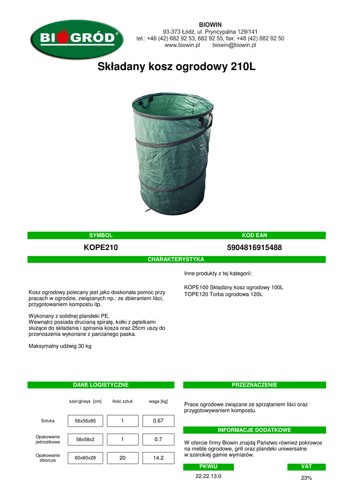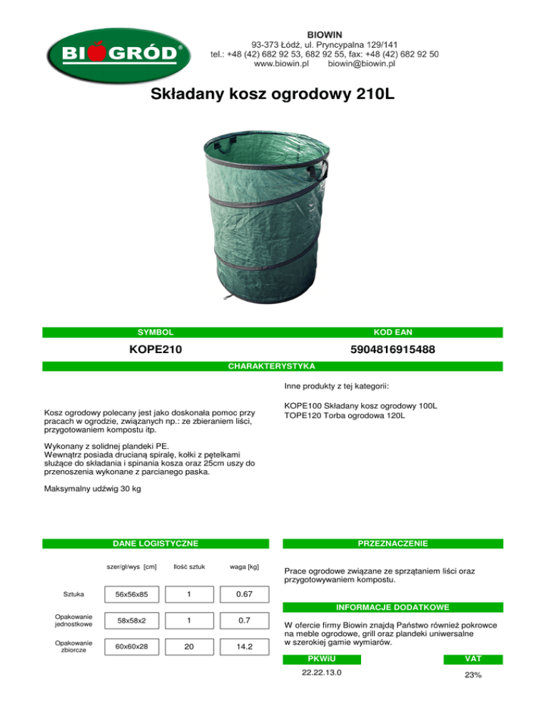 Składany kosz ogrodowy 210L SYMBOL KOD EAN KOPE210 5904816915488 CHARAKTERYSTYKA Inne produkty z tej kategorii: Kosz ogrodowy polecany jest jako doskonała pomoc przy pracach w ogrodzie, związanych np.: ze zbieraniem liści, przygotowaniem kompostu itp. KOPE100 Składany kosz ogrodowy 100L TOPE120 Torba ogrodowa 120L Wykonany z solidnej plandeki PE. Wewnątrz posiada drucianą spiralę, kołki z pętelkami służące do składania i spinania kosza oraz 25cm uszy do przenoszenia wykonane z parcianego paska. Maksymalny udźwig 30 kg DANE LOGISTYCZNE Sztuka PRZEZNACZENIE szer/gł/wys [cm] Ilość sztuk waga [kg] 56x56x85 1 0.67 Prace ogrodowe związane ze sprzątaniem liści oraz przygotowywaniem kompostu. INFORMACJE DODATKOWE Opakowanie jednostkowe 58x58x2 1 0.7 Opakowanie zbiorcze 60x60x28 20 14.2 W ofercie firmy Biowin znajdą Państwo również pokrowce na meble ogrodowe, grill oraz plandeki uniwersalne w szerokiej gamie wymiarów. PKWiU VAT 22.22.13.0 23%