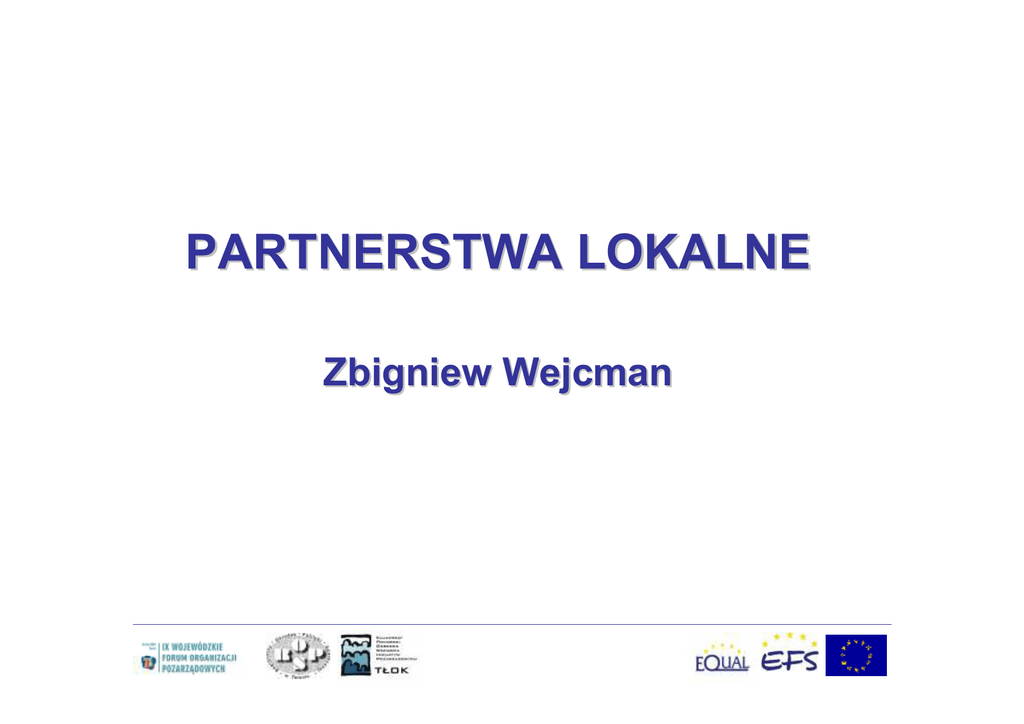 PARTNERSTWA LOKALNE Zbigniew Wejcman CO TO JEST KAPITAŁ SPOŁECZNY? Zespół nieformalnych wartości i norm (np. zaufanie, solidarność), uznawanych przez członków danej społeczności, który umożliwia współpracę i współdziałanie na rzecz rozwiązywania problemów, indywidualnych i zbiorowych. 2 KOABITACJA SEKTORÓW • Pierwszy sektor - państwo - zajmuje się głównie organizowaniem, przeprowadzaniem i finansowaniem redystrybucji dóbr. • Drugi sektor - rynek - zaspokaja przede wszystkim potrzeby materialne, wyrażone w pieniądzu. • Trzeci sektor dąży do (samo) zabezpieczenia ludzi według kryteriów opartych o osobiste i rzeczywiste ich potrzeby, kierując się zakorzenionymi w świadomości społecznej zasadami i wartościami. 3 MOTYWACJA ŚRODOWISKA BIZNESU DO BUDOWANIA PARTNERSTWA – Poszerzyć obszary działalności – Zwiększyć zyski – Nowe relacje z „klientami” na różnych płaszczyznach – Zmiana wizerunku ze “sponsora” na “interesariusza” – Dost p do grantów rz dowych i subsydiów 4 MOTYWACJA WŁADZ DO BUDOWANIA PARTNERSTW – – – – Przysporzenie korzy ci spo eczno ci lokalnej Poprawa lokalnej infrastruktury i gospodarki Wsparcie społeczne planu rozwoju Rozwijanie relacji z innymi sektorami, agencjami i organizacjami – kumulacja zasobów – Zaanga owa dodatkowe środki do projektów sektora publicznego 5 MOTYWACJA SEKTORA POZARZĄDOWEGO DO BUDOWANIA PARTNERSTWA – Zintensyfikować i zwiększyć efektywność projektów rozwojowych – Zwiększyć role organizacji sektora poprzez wpływ na plany lokalne – Poprawić jakość życia wspólnoty lokalnej – Przyciągnąć dodatkowe fundusze na rzecz spo ecznych projektów 6 WARUNKI UDANEGO PARTNERSTWA Konieczność współpracy sektorów: społecznego, biznesowego oraz publicznego, edukacyjnego Samorząd lokalny jako lider zmian (a nie jako władca absolutny) Wykorzystanie zasobów własnych społeczności lokalnej i posiadanych umiejętności w celu zachęcenia zasobów zewnętrznych Szerokie wykorzystanie programów edukacyjnych 7 PARTNERSTWA W PRAWIE POLSKIM • Ustawa o promocji zatrudnienia i instytucjach rynku pracy (2003) • Ustawa o wspieraniu rozwoju obszarów wiejskich z udziałem środków EFS (2007) • Ustawa o partnerstwie publiczno-prywatnym (2005) • Ustawa o działalności pożytku publicznego i o wolontariacie (projekt nowelizacji) 8 PARTNERSTWO LOKALNE NA RZECZ RYNKU PRACY Instytucje partnerstwa lokalnego są instytucjami realizującymi inicjatywy partnerów rynku pracy, które tworzone są na rzecz realizacji zadań określonych ustawą i wspieranymi przez organy samorządu terytorialnego (finansowanie projektów lokalnych i regionalnych) Dysponenci Funduszu Pracy mogą przeznaczać z niego środki między innymi na pokrycie kosztów związanych z organizowaniem partnerstwa lokalnego (spotkania, konferencje) 9 PARTNERSTWO PUBLICZNOPRYWATNE Podmiot publiczny powierza realizację zadania publicznego (np. w zakresie ochrony środowiska, prawa wodnego, problematyki społecznej) podmiotowi prywatnemu - np. przedsiębiorcy, kościołowi, organizacji pozarządowej - który powinien na tym zarobić, pod warunkiem, że realizuje umówione cele. Wynagrodzenie: • zapłata sumy pieniężnej przez podmiot publiczny albo • prawo partnera prywatnego do pobierania pożytków z przedsięwzięcia lub uzyskiwania innych korzyści z przedsięwzięcia 10 PARTNERSTWO PUBLICZNOPRYWATNO-SPOŁECZNE (LGD) • lokalna grupa działania jest stowarzyszeniem posiadającym osobowość prawną (rejestracja w KRS), • do tworzenia i działania lokalnych grup działania stosuje się przepisy o stowarzyszeniach, z tym że członkiem zwyczajnym lokalnej grupy działania mogą być osoby fizyczne i osoby prawne, w tym jednostki samorządu terytorialnego; nadzór nad lokalnymi grupami działania sprawuje marszałek województwa; • lokalne grupy działania mogą prowadzić działalność gospodarczą służącą realizacji lokalnej strategii rozwoju i w zakresie określonym w ich statutach. 11 PARTNERSTWO PROJEKTOWE (projekt) Dwie lub więcej organizacje pozarządowe działające wspólnie mogą złożyć ofertę wspólną. Umowę zawartą pomiędzy organizacjami określającą zakres ich świadczeń składających się na realizację zadania, załącza się do oferty wspólnej. W przypadku zlecenia realizacji zadania publicznego w umowie należy wskazać prawa i obowiązki każdej z organizacji, w tym zakres ich świadczeń składających się na realizowane zadanie. 12 PARTNERSTWO PUBLICZNOSPOŁECZNE (projekt) wspólne przedsięwzięcie gminy lub powiatu (partner publiczny) oraz organizacji pozarządowych mające na celu realizację zadań w obszarach zadań publicznych, w szczególności współfinansowanych ze środków pochodzących z budżetu Unii Europejskiej. PPS działa w formie związku stowarzyszeń i zrzesza co najmniej trzy podmioty, przy czym przynajmniej jednym podmiotem jest partner publiczny, i przynajmniej jeden podmiot jest podmiotem społecznym. 13 LOKALNE PARTNERSTWO TO: długofalowa współpraca mi dzy lokalnymi instytucjami, organizacjami i firmami oraz obywatelami, którzy są zainteresowani wspólnym dzia aniem na rzecz rozwi zania danego problemu, zgadzaj c si wspólnie pracowa , dziel c zarówno ryzyko jak i korzy ci w celu wype nienia zobowi zania lub podj cia okre lonych zada . 14 PARTNERSTWO, BO: • Partnerstwo nie zastępuje władzy lokalnej, ale z nią współpracuje • Partnerstwo umożliwia absorbowanie środków z funduszy europejskich szczególnie z programu POKL i RPO (uzasadnienie do Ustawy o Działalności Pożytku Publicznego i o Wolontariacie – projekt nowelizacji) • Partnerstwo uaktywnia i integruje obywateli w procesie zmian – podejmowania wspólnych działań na rzecz rozwoju terytorium i rozwiązywania problemów grup mieszkańców 15 PROJEKTY GRUP PARTNERSKICH • Projekty rozwoju fizycznego – ochrona dziedzictwa naturalnego i kul