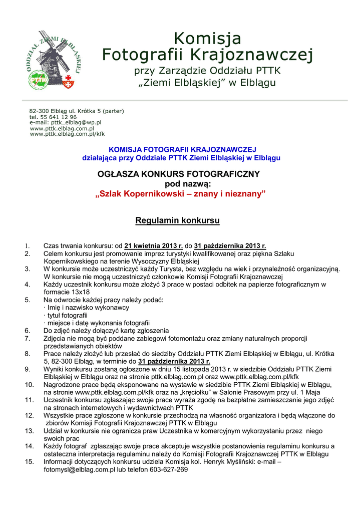 KOMISJA FOTOGRAFII KRAJOZNAWCZEJ działająca przy Oddziale PTTK Ziemi Elbląskiej w Elblągu OGŁASZA KONKURS FOTOGRAFICZNY pod nazwą: „Szlak Kopernikowski – znany i nieznany” Regulamin konkursu 1. 2. 3. 4. 5. 6. 7. 8. 9. 10. 11. 12. 13. 14. 15. Czas trwania konkursu: od 21 kwietnia 2013 r. do 31 października 2013 r. Celem konkursu jest promowanie imprez turystyki kwalifikowanej oraz piękna Szlaku Kopernikowskiego na terenie Wysoczyzny Elbląskiej W konkursie może uczestniczyć każdy Turysta, bez względu na wiek i przynależność organizacyjną. W konkursie nie mogą uczestniczyć członkowie Komisji Fotografii Krajoznawczej Każdy uczestnik konkursu może złożyć 3 prace w postaci odbitek na papierze fotograficznym w formacie 13x18 Na odwrocie każdej pracy należy podać: · Imię i nazwisko wykonawcy · tytuł fotografii · miejsce i datę wykonania fotografii Do zdjęć należy dołączyć kartę zgłoszenia Zdjęcia nie mogą być poddane zabiegowi fotomontażu oraz zmiany naturalnych proporcji przedstawianych obiektów Prace należy złożyć lub przesłać do siedziby Oddziału PTTK Ziemi Elbląskiej w Elblągu, ul. Krótka 5, 82-300 Elbląg, w terminie do 31 października 2013 r. Wyniki konkursu zostaną ogłoszone w dniu 15 listopada 2013 r. w siedzibie Oddziału PTTK Ziemi Elbląskiej w Elblągu oraz na stronie pttk.elblag.com.pl oraz www.pttk.elblag.com.pl/kfk Nagrodzone prace będą eksponowane na wystawie w siedzibie PTTK Ziemi Elbląskiej w Elblągu, na stronie www.pttk.elblag.com.pl/kfk oraz na „kręciołku” w Salonie Prasowym przy ul. 1 Maja Uczestnik konkursu zgłaszając swoje prace wyraża zgodę na bezpłatne zamieszczanie jego zdjęć na stronach internetowych i wydawnictwach PTTK Wszystkie prace zgłoszone w konkursie przechodzą na własność organizatora i będą włączone do zbiorów Komisji Fotografii Krajoznawczej PTTK w Elblągu Udział w konkursie nie ogranicza praw Uczestnika w komercyjnym wykorzystaniu przez niego swoich prac Każdy fotograf zgłaszając swoje prace akceptuje wszystkie postanowienia regulaminu konkursu a ostateczna interpretacja regulaminu należy do Komisji Fotografii Krajoznawczej PTTK w Elblągu Informacji dotyczących konkursu udziela Komisja kol. Henryk Myśliński: e-mail – [email protected] lub telefon 603-627-269