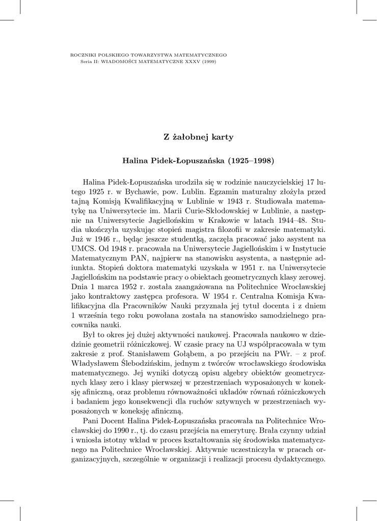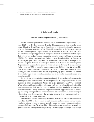 ROCZNIKI POLSKIEGO TOWARZYSTWA MATEMATYCZNEGO Seria II: WIADOMOŚCI MATEMATYCZNE XXXV (1999) Z żałobnej karty Halina Pidek-Łopuszańska (1925–1998) Halina Pidek-Łopuszańska urodziła się w rodzinie nauczycielskiej 17 lutego 1925 r. w Bychawie, pow. Lublin. Egzamin maturalny złożyła przed tajną Komisją Kwalifikacyjną w Lublinie w 1943 r. Studiowała matematykę na Uniwersytecie im. Marii Curie-Skłodowskiej w Lublinie, a następnie na Uniwersytecie Jagiellońskim w Krakowie w latach 1944–48. Studia ukończyła uzyskując stopień magistra filozofii w zakresie matematyki. Już w 1946 r., będąc jeszcze studentką, zaczęła pracować jako asystent na UMCS. Od 1948 r. pracowała na Uniwersytecie Jagiellońskim i w Instytucie Matematycznym PAN, najpierw na stanowisku asystenta, a następnie adiunkta. Stopień doktora matematyki uzyskała w 1951 r. na Uniwersytecie Jagiellońskim na podstawie pracy o obiektach geometrycznych klasy zerowej. Dnia 1 marca 1952 r. została zaangażowana na Politechnice Wrocławskiej jako kontraktowy zastępca profesora. W 1954 r. Centralna Komisja Kwalifikacyjna dla Pracowników Nauki przyznała jej tytuł docenta i z dniem 1 września tego roku powołana została na stanowisko samodzielnego pracownika nauki. Był to okres jej dużej aktywności naukowej. Pracowała naukowo w dziedzinie geometrii różniczkowej. W czasie pracy na UJ współpracowała w tym zakresie z prof. Stanisławem Gołąbem, a po przejściu na PWr. – z prof. Władysławem Ślebodzińskim, jednym z twórców wrocławskiego środowiska matematycznego. Jej wyniki dotyczą opisu algebry obiektów geometrycznych klasy zero i klasy pierwszej w przestrzeniach wyposażonych w koneksję afiniczną, oraz problemu równoważności układów równań różniczkowych i badaniem jego konsekwencji dla ruchów sztywnych w przestrzeniach wyposażonych w koneksję afiniczną. Pani Docent Halina Pidek-Łopuszańska pracowała na Politechnice Wrocławskiej do 1990 r., tj. do czasu przejścia na emeryturę. Brała czynny udział i wniosła istotny wkład w proces kształtowania się środowiska matematycznego na Politechnice Wrocławskiej. Aktywnie uczestniczyła w pracach organizacyjnych, szczególnie w organizacji i realizacji procesu dydaktycznego. 218 Z żałobnej karty Była znakomitym nauczycielem akademickim, cieszącym się wielkim uznaniem zarówno przełożonych jak i studentów. Dla wielu obecnych pracowników Politechniki Wrocławskiej, którzy mieli możliwość słuchania jej wykładów, pozostanie wzorem dobrego dydaktyka, jak i wzorcem pięknej i silnej osobowości. Jest także współautorem kilkakrotnie wznawianego podręcznika akademickiego Matematyka dla chemików , oraz dwutomowych Wykładów telewizyjnych dla studentów wyższych technicznych studiów zawodowych dla pracujących. W czasie swej kariery zawodowej pełniła szereg ważnych i odpowiedzialnych funkcji; do najważniejszych należą: kierownik Katedry Matematyki przy Wydziale Elektrycznym i prodziekan ds. nauczania tego Wydziału; zastępca dyrektora Instytutu Matematyki i Fizyki Teoretycznej ds. nauki; kierownik Zakładu Geometrii i Zakładu Dydaktyki w Instytucie Matematyki; prodziekan Wydziału Podstawowych Problemów Techniki. Była redaktorem naczelnym wydawnictw dydaktycznych i naukowych w Instytucie Matematyki PWr. W latach siedemdziesiątych i osiemdziesiątych była bardzo mocno zaangażowana w działalność społeczno-polityczną. Była osobą niezwykle wrażliwą na problemy ludzkie. Wspierała różne formy protestu bądź bezpośrednio w nich sama uczestniczyła. W okresie poprzedzającym powstanie „Solidarności” zaangażowała się, nie bacząc na konsekwencje, w akcję wydawniczą. Była założycielem i pierwszym przewodniczącym Komisji Oddziałowej NSZZ „Solidarność” w Instytucie Matematyki. Doc. Halina Łopuszańska należała do nielicznej już grupy seniorów matematyki wrocławskiej, którzy tworzyli środowisko matematyczne w pierwszych latach powojennych, a następnie czynnie uczestniczyli w jego życiu. Halina Pidek-Łopuszańska zmarła we Wrocławiu 16 lutego 1998 r. Zbigniew Olszak Spis publikacji Haliny Pidek-Łopuszańskiej [1] Sur une inégalité entre des intégrales définies, Ann. Univ. Mariae Curie-Skłodowskia 4 (1950), 1–4 (wspólnie z M. Biernackim i Cz. Ryllem-Nardzewskim). [2] O pewnym twierdzeniu metody faktoryzacji L. Infelda, Postępy Fizyki 2 (1951). [3] Sur les objets géométriques de la classe zéro qui admettent une algèbre, Ann. Soc. Polon. Math. 24 (1951), 111–128. [4] Sur un problème de l’algèbre des objets géométriques de classe zéro dans l’éspace X1 , Ann. Polon. Math. 1 (1954), 114–126. [5] Sur un problème de l’algèbre des objets géométriques de classe zéro dans l’éspace Xm , Ann. Polon. Math. 1 (1954), 127–134. [6] Sur l’algèbre des objets géométriques de premiere classe à une composante, Ann. Polon. Math. 4 (1958) 226–248 (wspólnie z S. Gołąbem). [7] Matematyka dla chemików , PWN, Warszawa, 1958 (wspólnie z W. Ślebodzińskim i K. Urbanikiem). Z żałobnej karty 219 [8] Sur un pseudogroupe infini et un problème d’équivalence, Ann. Polon. Math. 10 (1961), 101–113 (wspólnie z W. Ślebodzińskim). [9] Zewnętrzne formy różniczkowe i pewne ich zastosowania, Referaty wygłoszone na Konferencji Szkoleniowej Geometrii Różniczkowej, WNT, Warszawa, 1965 (wspólnie z A. Goetzem, T. Huskowskim, R. Krasnodębskim i M. Rochowskim; H. Ł. jest autorem Rozdz. 1 – Formy zewnętrzne algebraiczne i różniczkowe i Rozdz. 2 – Układy Pfaffa nieograniczenie całkowalne). [10] Wykłady telewizyjne dla studentów wyższych technicznych studiów zawodowych dla pracujących, Matematyka Cz. 1, PWN, Warszawa, 1971 (wspólnie z I. Dziubińskim, B. Gleichgewichtem, T. Huskowskim, W. Krysickim, R. Leintnerem, Cz. RyllemNardzewskim, T. Świątkowskim i L. Włodarskim). [11] Wykłady telewizyjne dla studentów wyższych