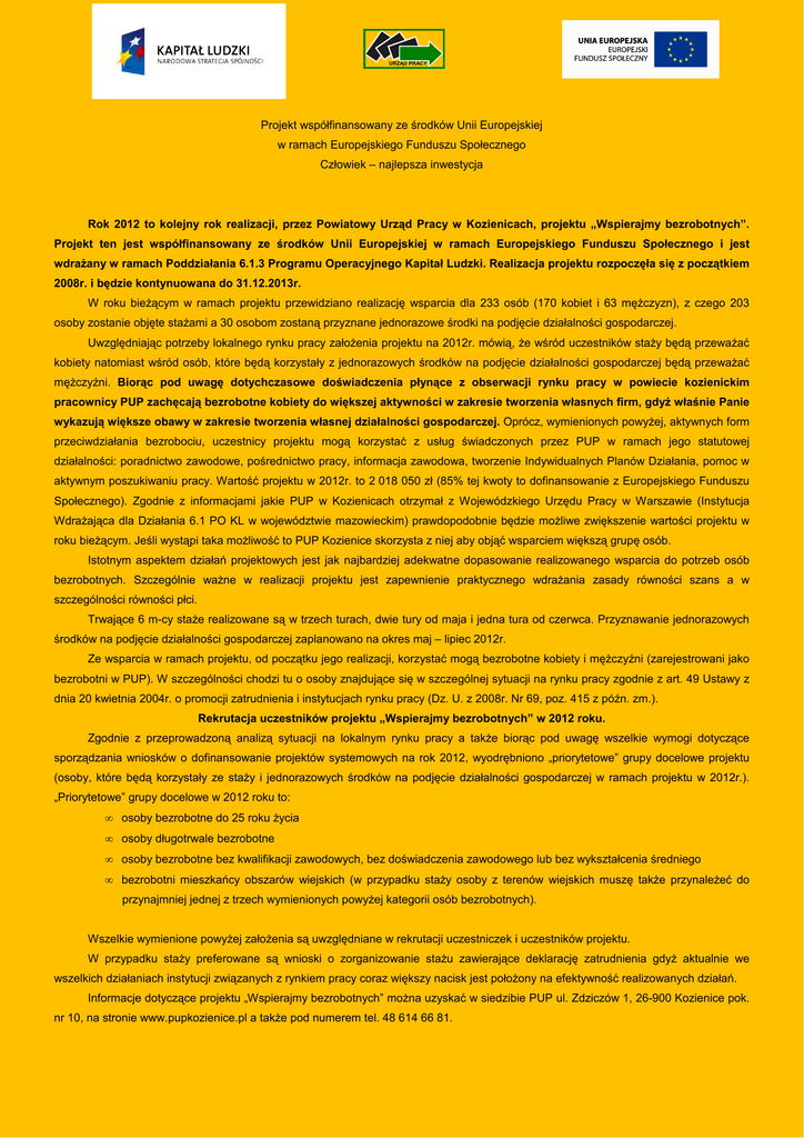 URZĄD PRACY Projekt współfinansowany ze środków Unii Europejskiej w ramach Europejskiego Funduszu Społecznego Człowiek – najlepsza inwestycja Rok 2012 to kolejny rok realizacji, przez Powiatowy Urząd Pracy w Kozienicach, projektu „Wspierajmy bezrobotnych”. Projekt ten jest współfinansowany ze środków Unii Europejskiej w ramach Europejskiego Funduszu Społecznego i jest wdraŜany w ramach Poddziałania 6.1.3 Programu Operacyjnego Kapitał Ludzki. Realizacja projektu rozpoczęła się z początkiem 2008r. i będzie kontynuowana do 31.12.2013r. W roku bieŜącym w ramach projektu przewidziano realizację wsparcia dla 233 osób (170 kobiet i 63 męŜczyzn), z czego 203 osoby zostanie objęte staŜami a 30 osobom zostaną przyznane jednorazowe środki na podjęcie działalności gospodarczej. Uwzględniając potrzeby lokalnego rynku pracy załoŜenia projektu na 2012r. mówią, Ŝe wśród uczestników staŜy będą przewaŜać kobiety natomiast wśród osób, które będą korzystały z jednorazowych środków na podjęcie działalności gospodarczej będą przewaŜać męŜczyźni. Biorąc pod uwagę dotychczasowe doświadczenia płynące z obserwacji rynku pracy w powiecie kozienickim pracownicy PUP zachęcają bezrobotne kobiety do większej aktywności w zakresie tworzenia własnych firm, gdyŜ właśnie Panie wykazują większe obawy w zakresie tworzenia własnej działalności gospodarczej. Oprócz, wymienionych powyŜej, aktywnych form przeciwdziałania bezrobociu, uczestnicy projektu mogą korzystać z usług świadczonych przez PUP w ramach jego statutowej działalności: poradnictwo zawodowe, pośrednictwo pracy, informacja zawodowa, tworzenie Indywidualnych Planów Działania, pomoc w aktywnym poszukiwaniu pracy. Wartość projektu w 2012r. to 2 018 050 zł (85% tej kwoty to dofinansowanie z Europejskiego Funduszu Społecznego). Zgodnie z informacjami jakie PUP w Kozienicach otrzymał z Wojewódzkiego Urzędu Pracy w Warszawie (Instytucja WdraŜająca dla Działania 6.1 PO KL w województwie mazowieckim) prawdopodobnie będzie moŜliwe zwiększenie wartości projektu w roku bieŜącym. Jeśli wystąpi taka moŜliwość to PUP Kozienice skorzysta z niej aby objąć wsparciem większą grupę osób. Istotnym aspektem działań projektowych jest jak najbardziej adekwatne dopasowanie realizowanego wsparcia do potrzeb osób bezrobotnych. Szczególnie waŜne w realizacji projektu jest zapewnienie praktycznego wdraŜania zasady równości szans a w szczególności równości płci. Trwające 6 m-cy staŜe realizowane są w trzech turach, dwie tury od maja i jedna tura od czerwca. Przyznawanie jednorazowych środków na podjęcie działalności gospodarczej zaplanowano na okres maj – lipiec 2012r. Ze wsparcia w ramach projektu, od początku jego realizacji, korzystać mogą bezrobotne kobiety i męŜczyźni (zarejestrowani jako bezrobotni w PUP). W szczególności chodzi tu o osoby znajdujące się w szczególnej sytuacji na rynku pracy zgodnie z art. 49 Ustawy z dnia 20 kwietnia 2004r. o promocji zatrudnienia i instytucjach rynku pracy (Dz. U. z 2008r. Nr 69, poz. 415 z późn. zm.). Rekrutacja uczestników projektu „Wspierajmy bezrobotnych” w 2012 roku. Zgodnie z przeprowadzoną analizą sytuacji na lokalnym rynku pracy a takŜe biorąc pod uwagę wszelkie wymogi dotyczące sporządzania wniosków o dofinansowanie projektów systemowych na rok 2012, wyodrębniono „priorytetowe” grupy docelowe projektu (osoby, które będą korzystały ze staŜy i jednorazowych środków na podjęcie działalności gospodarczej w ramach projektu w 2012r.). „Priorytetowe” grupy docelowe w 2012 roku to: • osoby bezrobotne do 25 roku Ŝycia • osoby długotrwale bezrobotne • osoby bezrobotne bez kwalifikacji zawodowych, bez doświadczenia zawodowego lub bez wykształcenia średniego • bezrobotni mieszkańcy obszarów wiejskich (w przypadku staŜy osoby z terenów wiejskich muszę takŜe przynaleŜeć do przynajmniej jednej z trzech wymienionych powyŜej kategorii osób bezrobotnych). Wszelkie wymienione powyŜej załoŜenia są uwzględniane w rekrutacji uczestniczek i uczestników projektu. W przypadku staŜy preferowane są wnioski o zorganizowanie staŜu zawierające deklarację zatrudnienia gdyŜ aktualnie we wszelkich działaniach instytucji związanych z rynkiem pracy coraz większy nacisk jest połoŜony na efektywność realizowanych działań. Informacje dotyczące projektu „Wspierajmy bezrobotnych” moŜna uzyskać w siedzibie PUP ul. Zdziczów 1, 26-900 Kozienice pok. nr 10, na stronie www.pupkozienice.pl a takŜe pod numerem tel. 48 614 66 81.