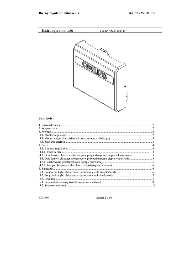 Bierny regulator chłodzenia Instrukcja montaŜu 348190 / WPM PK Typ nr: 452114.66.46 Spis treści: 1. Zakres dostawy............................................................................................................................. 2 2. WyposaŜenie ................................................................................................................................ 2 3. MontaŜ.......................................................................................................................................... 2 3.1. MontaŜ regulatora..................................................................................................................... 2 3.2. MontaŜ czujników zasilania i powrotu wody chłodzącej......................................................... 3 3.3. Zasilanie energią....................................................................................................................... 3 4. Praca................................................................................................................................... ……...4 4.1. Budowa regulatora.................................................................................................................... 4 4.1.1. Praca w sieci........................................................................................................................ 4 4.2. Opis funkcji chłodzenia biernego w przypadku pomp ciepła solanka/woda............................ 5 4.3. Opis funkcji chłodzenia biernego w przypadku pomp ciepła woda/woda............................... 5 4.3.1. Zachowanie przełączeniowe pompy pierwotnej.................................................................. 5 4.3.2. Pompa obiegowa trybu chłodzenia (dystrybucja zimna)..................................................... 6 5. Załącznik....................................................................................................................................... 6 5.1. Połączenia trybu chłodzenia z pompami ciepła solanka/woda................................................. 6 5.2. Połączenia trybu chłodzenia z pompami ciepła woda/woda.....................................................7 5.3. Legenda..................................................................................................................................... 8 5.4. Schemat obwodowy (okablowanie wewnętrzne)......................................................................9 5.5. Schemat połączeń......................................................................................................................10 FD 8409 Strona 1 z 10 1. Zakres dostawy Montowany na ścianie regulator chłodzenia (WPM PK) uzupełnia posiadany menager pompy ciepła o tryb chłodzenia. Obydwa regulatory pracują w sieci i regulują wspólnie kombinowany system ogrzewania i biernego chłodzenia za pomocą pomp ciepła solanka/woda lub woda/woda. Do zakresu dostawy zalicza się: • regulator chłodzenia w obudowie naściennej • 3 kołki (6 mm) ze śrubami do montaŜu naściennego • 2 czujniki rejestrujące temperaturę zasilania i powrotu systemu chłodzącego • instrukcję montaŜu i uŜytkowania • wtyczki połączenia sieciowego do regulatora trybu grzania 2. WyposaŜenie Do regulacji chłodzenia biernego dostępne są następujące części wyposaŜenia: • stacja chłodzenia do pomiaru temperatury oraz wilgotności powietrza (wyposaŜenie konieczne do funkcjonowania trybu chłodzenia poprzez systemy ogrzewania i chłodzenia powierzchniowego (chłodzenie grawitacyjne) • dwupunktowy regulator temperatury pomieszczenia grzanie/chłodzenie MoŜliwe jest przełączanie pomiędzy trybem grzania i trybem chłodzenia za pomocą zewnętrznego styku przełącznego • rozszerzona kontrola punktu rosy W celu przerwania trybu chłodzenia przy występującym oszronieniu wraŜliwych miejsc systemu dystrybucji zimna, mierzona przez aŜ do 5 pojedynczych przyłączanych czujników punktu rosy 3. MontaŜ 3.1. MontaŜ regulatora Wymiary montowanego na ścianie biernego regulatora chłodzenia FD 8409 Strona 2 z 10 Regulator montowany jest na ścianie za pomocą 3 śrub i kołków (6 mm), które znajdują się w zakresie dostawy. Aby regulator nie został zabrudzony lub uszkodzony, naleŜy postępować w następujący sposób: • Umieścić kołki dla górnego uchwytu mocującego na wysokości roboczej. • Wkręcić śrubę w kołek na taką głębokość, aby moŜna było jeszcze zawiesić regulator. • Zawiesić regulator na górnym uchwycie mocującym. • Zaznaczyć połoŜenie bocznych uchwytów mocujących. • Ponownie zdjąć regulator. • Osadzić kołki bocznych uchwytów mocujących. • Ponownie zawiesić regulator i przykręcić za pomocą śrub. 3.2. MontaŜ czujników zasilnia i powrotu wody chłodzącej • Czujniki muszą zostać zamontowane na zasilaniu i powrocie wody chłodzącej (w celu ustawienia patrz równieŜ schematy hydrauliczne w połączeniu) • Oczyścić rury z lakieru, rdzy i zgorzelin • Oczyszczone powierzchnie posmarować pastą przewodzącą ciepło (nanieść cienką warstwę) • Zamocować czujniki za pomocą opaski zaciskowej (dobrze dociągnąć, luźne czujniki prowadzą do zakłóceń funkcji) i zaizolować termicznie 1 opaska zaciskowa, 2 czujnik, 3 izolacja cieplna Wszystkie czujniki temperatury przyłączane do dodatkowego regulatora chłodzenia są zgodne z przedstawioną charakterystyką czujnika. 55 50 45 Wartość oporu [k-Ohm] 40 35 30 25 20 15 10 5 0 -20 -15 -10 -5 0 5 10 15 20 25 30 Temperatura [°C] 3.3. Zasilanie energią W Podłączenie zasilania energią następuje w urządzeniu za pomocą kabla na miejscu inwestycji, na zaciskach X1: L/N/PE 230V~50Hz FD 8409 Strona 3 z 10 4. Praca NaleŜy przestrzegać instrukcji montaŜu i uŜytkowania menagera pompy ciepła oraz dokumentacji projektowej. W szczególności obowiązują opisy dotyczące funkcji chłodzenia z instrukcji monta