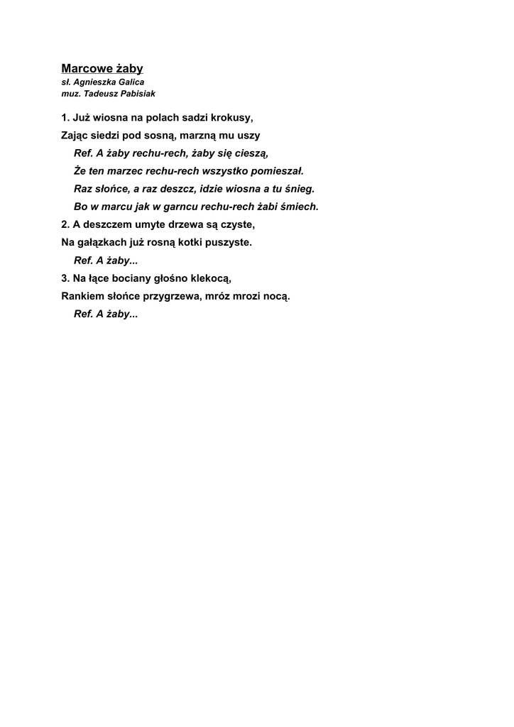 Marcowe żaby sł. Agnieszka Galica muz. Tadeusz Pabisiak 1. Już wiosna na polach sadzi krokusy, Zając siedzi pod sosną, marzną mu uszy Ref. A żaby rechu-rech, żaby się cieszą, Że ten marzec rechu-rech wszystko pomieszał. Raz słońce, a raz deszcz, idzie wiosna a tu śnieg. Bo w marcu jak w garncu rechu-rech żabi śmiech. 2. A deszczem umyte drzewa są czyste, Na gałązkach już rosną kotki puszyste. Ref. A żaby... 3. Na łące bociany głośno klekocą, Rankiem słońce przygrzewa, mróz mrozi nocą. Ref. A żaby...