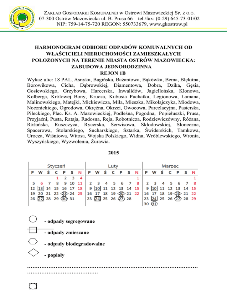 ZAKŁAD GOSPODARKI KOMUNALNEJ w Ostrowi Mazowieckiej SP. Z O.O. 07-300 Ostrów Mazowiecka ul. B. Prusa 66 tel./fax: (0-29) 645-73-01/02 NIP: 759-14-75-720 REGON: 550733679, www.gkostrow.pl HARMONOGRAM ODBIORU ODPADÓW KOMUNALNYCH OD WŁAŚCICIELI NIERUCHOMOŚCI ZAMIESZKAŁYCH POŁOŻONYCH NA TERENIE MIASTA OSTRÓW MAZOWIECKA: ZABUDOWA JEDNORODZINNA REJON 1B Wykaz ulic: 18 PAL, Asnyka, Bagińska, Bażantowa, Bąkówka, Bema, Błękitna, Borowikowa, Cicha, Dąbrowskiej, Diamentowa, Dobra, Dzika, Gęsia, Gosiewskiego, Grzybowa, Harcerska, Inwalidów, Jagiellońska, Klonowa, Kolberga, Królowej Bony, Krucza, Kubusia Puchatka, Legionowa, Łamana, Malinowskiego, Matejki, Mickiewicza, Miła, Mieszka, Mikołajczyka, Miodowa, Nocznickiego, Ogrodowa, Okrężna, Okrzei, Owocowa, Parcelacyjna, Pasterska, Pileckiego, Plac. Ks. A. Mazowieckiej, Podleśna, Pogodna, Popiełuszki, Prusa, Przyjaźni, Pusta, Rataja, Radosna, Reja, Robotnicza, Rodziewiczówny, Różana, Różańska, Ruszczyca, Rycerska, Serwisowa, Skłodowskiej, Słoneczna, Spacerowa, Stolarskiego, Sucharskiego, Sztarka, Świderskich, Tamkowa, Urocza, Wiśniowa, Witosa, Wojska Polskiego, Widna, Wróblewskiego, Wronia, Wyszyńskiego, Wyzwolenia, Żurawia. 2015 - odpady segregowane - odpady zmieszane - odpady biodegradowalne - popioły …………………………………………………………………………………… …………………………………. - odbiór odpadów zmieszanych i odpadów segregowanych w tym samym dniu, ale każdy odbiór oddzielnie W przypadku dodatkowych pytań prosimy o kontakt z Działem Oczyszczania Miasta i Odbioru Odpadów tel. /29/ 645 73 25 lub /29/ 645 73 24 Zarząd Spółki