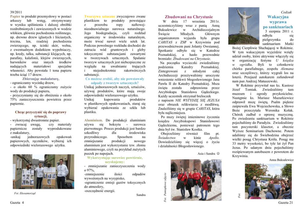 Fot. Ekosamorząd Gazeta 4 Aluminium. Do produkcji aluminium uŜywa się boksytu surowca pierwotnego. Proces produkcji jest bardzo szkodliwy dla środowiska przyrodniczego. Sposobem na zmniejszanie produkcji nowego aluminium jest wykorzystanie tzw. złomu aluminiowego, czyli na przykład zuŜytych puszek po napojach. Wykorzystując surowiec powtórnie, uzyskujemy: - zmniejszanie zanieczyszczenia wody o 97%, -zmniejszenie ilości odpadów wywoŜonych na wysypisko, -ograniczenie emisji gazów toksycznych do atmosfery, -oszczędność energii. Sandra Zbudowani na Chrystusie W dniu 17 września 2011r. uczestniczyliśmy wraz z panią Anną Buksalewicz w Archidiecezjalnym Święcie Młodych. Głównym organizatorem wyjazdu była grupa CARITAS z ZSP w Krzywiniu pod przewodnictwem pani Jolanty Owsiannej. Spotkanie odbyło się w Katedrze Poznańskiej, a hasło przewodnie brzmiało: Zbudowani na Chrystusie. Na początku wycieczki zwiedzaliśmy podziemia Katedry Poznańskiej. Zintegrowani z młodymi całej Archidiecezji przeŜywaliśmy uroczyste wniesienie relikwii błogosławionego Jana Pawła II do Katedry Poznańskiej. Msza święta została odprawiona przez Arcybiskupa Stanisława Gądeckiego. KaŜdy uczestnik otrzymał breloczek z napisem NIE WSTYDZĘ SIĘ JEZUSA oraz obrazek relikwiarza z modlitwą. Znaleźliśmy się w grupie CARITAS, która była najliczniejsza. Po mszy świętej imieninowe Ŝyczenia księdzu Arcybiskupowi Stanisławowi Gądeckiemu, poniewaŜ patronem tego dnia był św. Stanisław Kostka. Obejrzeliśmy równieŜ film pt. Świadectwo w kinie Apollo. Dowiedzieliśmy się więcej o Ŝyciu i działalności Błogosławionego. Asia i Sandra ☺ Wakacyjna wyprawa po sanktuariach 3 sierpnia 2011 r. odbyła się pielgrzymka do sanktuarium Matki BoŜej Cierpliwie Słuchającej w Rokitnie. W tym wakacyjnym wyjeździe wzięły udział osoby, które aktywnie włączyły się w organizację festynu U księdza w ogródku. Byli to członkowie chórku parafialnego, zespołu Alemana oraz szczęśliwcy, którzy wygrali los na loterii. Przejazd autokarem zafundował nam pan Andrzej Matuszewski. W Rokitnie przywitał nas ks. Kustosz Józef Tomiak. Zwiedzaliśmy tam muzeum i ogrody przykościelne. Następnie ks. Mariusz Mazurkiewicz odprawił mszę świętą. Psalm pięknie zaśpiewała Ewa Wojciechowska, a Słowo BoŜe przeczytała Weronika Kołak. Chórek zadbał o oprawę muzyczną. Po zwiedzaniu sanktuarium w Rokitnie pojechaliśmy do ParadyŜa. Zwiedzaliśmy tam pocysterski klasztor, a obecnie WyŜsze Seminarium Duchowne. Potem udaliśmy się do Świebodzina obejrzeć wielki posąg Chrystusa Króla. Posąg ma 33 metry wysokości, bo tyle lat Ŝył Pan Jezus. Po udanym dniu pojechaliśmy rozśpiewanym autobusem z powrotem do Krzywinia. Anna Buksalewicz Fot. Chcąc przyczynić się do poprawy sytuacji, - wykorzystuj dwustronnie papier. - zwracaj uwagę, czy materiały papiernicze zostały wyprodukowane z makulatury, -unikaj jednorazowych opakowań papierowych, ręczników, wybieraj ich odpowiedniki wielorazowego uŜytku. Cedzak Tworzywa sztuczne zwyczajowo zwane plastikiem to produkty powstające z przerobu ropy naftowejnieodnawialnego surowca naturalnego. Jego biodegradacja, czyli rozkład organiczny w środowisku naturalnym, moŜe trwać nawet wiele setek lat. Podczas powolnego rozkładu dochodzi do zatrucia wód gruntowych i gleby toksycznymi substancjami zawartymi w tworzywach sztucznych. Spalanie tworzyw sztucznych jest niebezpieczne ze względu na uwalnianie trujących i niejednokrotnie rakotwórczych substancji. Co moŜesz zrobić, aby nie powstawały odpady z tworzyw sztucznych? Unikaj jednorazowych naczyń, sztućców, uŜywaj produktów, które mają swoje odpowiedniki wielorazowego uŜytku. Unikaj kupowania produktów w plastikowych opakowaniach, staraj się wybierać opakowania ze szkła lub plastiku. Fot. Pamiątkowe zdjęcie 39/2011 Papier to produkt przemysłowy w postaci arkuszy lub wstęg, otrzymywany w wyniku spilśnienia i dalszej obróbki rozdrobnionych i zawieszonych w wodzie włókien, głównie pochodzenia roślinnego, np. drewno drzew iglastych i liściastych, trzcina, len, rzadziej pochodzenia zwierzęcego, np. ścinki skór, wełna, z ewentualnym dodatkiem wypełniaczy, np. kredy, talku, substancji klejących, np. parafiny, kalafonii, klejów zwierzęcych, barwników oraz innych środków nadających materiałowi specjalne własności. Aby powstała 1 tona papieru trzeba ściąć 17 drzew. Zbieraując makulaturę, - ograniczamy wycinkę drzew, - o około 60 % ograniczamy zuŜycie wody do produkcji papieru, - przyczyniamy się do obniŜenia o około 75% zanieczyszczenia powietrza przez papiernie. Gazeta 21