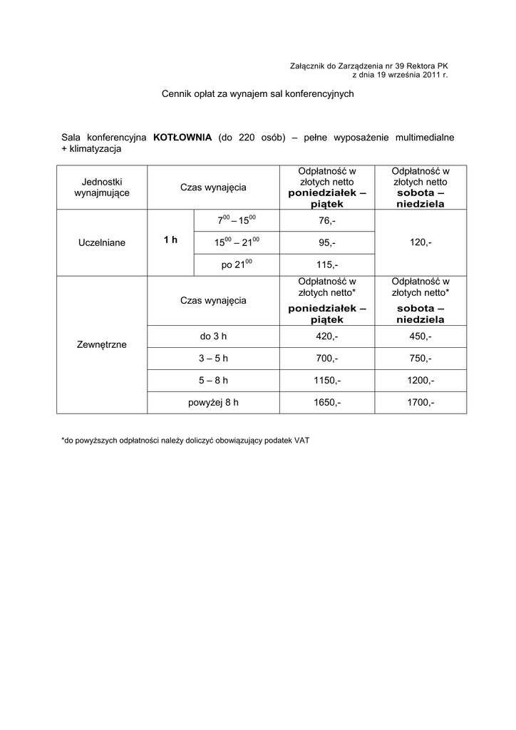 Załącznik do Zarządzenia nr 39 Rektora PK z dnia 19 września 2011 r. Cennik opłat za wynajem sal konferencyjnych Sala konferencyjna KOTŁOWNIA (do 220 osób) – pełne wyposażenie multimedialne + klimatyzacja Jednostki wynajmujące Uczelniane Czas wynajęcia 1h 700 – 1500 76,- 1500 – 2100 95,- po 2100 115,- Odpłatność w złotych netto sobota – niedziela 120,- Odpłatność w złotych netto* Odpłatność w złotych netto* poniedziałek – piątek sobota – niedziela do 3 h 420,- 450,- 3–5h 700,- 750,- 5–8h 1150,- 1200,- powyżej 8 h 1650,- 1700,- Czas wynajęcia Zewnętrzne Odpłatność w złotych netto poniedziałek – piątek *do powyższych odpłatności należy doliczyć obowiązujący podatek VAT GIL – Sala konferencyjno-bankietowa (do 80 osób) – pełne wyposażenie multimedialne GIL – Sala czytelni (do 150 osób) – pełne wyposażenie multimedialne Odpłatność w złotych netto Jednostki wynajmujące poniedziałek – piątek Czas wynajęcia Jako sala bankietowa bez multimediów Jako sala konferencyjna z multimediami 45,- 65,- 15 – 21 65,- 85,- 00 85,- 105,- 00 00 7 – 15 Uczelniane 1h 00 po 21 00 Odpłatność w złotych netto sobota – niedziela Jako sala bankietowa bez multimediów Jako sala konferencyjna z multimediami 100,- 120,- poniedziałek – piątek każda 1h = 140,-* sobota – niedziela każda 1h = 160,-* Zewnętrzne *do powyższych odpłatności należy doliczyć obowiązujący podatek VAT W przypadku długotrwałego lub cyklicznego wynajmowania sal możliwa jest negocjacja cen. Sala teatralna „Kanonicza 1” Odpłatność w złotych netto Jednostki wynajmujące Uczelniane Czas wynajęcia 1h bez nagłośnienia z nagłośnieniem 700 – 1500 60,- 80,- 1500 – 2100 80,- 100,- po 2100 100,- 120,- 1 h/próba 60,-* 1 h/spektakl 100,-* 1 h/próba 80,-* 1 h/spektakl 150,-* Grupy teatralne związane ze Stowarzyszeniem Teatrów Nieinstytucjonalnych Inne zewnętrzne *do powyższych odpłatności należy doliczyć obowiązujący podatek VAT