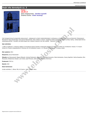 Informacje o produkcie Utworzono 08-03-2017 Bajki dla dorosłych cz. 3 Cena : 20,00 zł m .p l Stan magazynowy : bardzo wysoki Średnia ocena : brak recenzji .c o Cykl niezapomnianych programów satyrycznych , nadawanych w latach siedemdziesiątych, emitowany w niedzielne wieczory po Dzienniku Telewizyjnym. Narratorem tego popularnego cyklu był Jan Kobuszewski, który siedząc w dużym, wygodnym fotelu przedstawił widzom prolog i epilog , każdą bajkę kończą zaskakującą pointą - morałem, po której żegnał się z widzami zawsze w ten sam sposób - :Dobranoc Państwu". Spis odcinków: sk 1. Bitki w maderze/ 2. Litościwy zabójca /3. Na dworze księcia Certoła /4. Naszyjnik gwiazdy / 5. Niepewna miłość /6. O królewnie i drwalu /7. O trzech królach /8. Przykra niespodzianka /9. Sarenka /10. W królewskich lasach / 11. Wczasy na jachcie /12. Z wizytą u babci io Rok wydania: 2011 Reżyseria: Janusz Rzeszewski ek Obsada: Jan Kobuszewski, Bogusz Bilewski, Andrzej Fedorowicz, Marian Glinka, Olgierd Jacewicz, Maria Kaniewska, Cezary Kapliński, Halina Kowalska, Mira Morawska, Włodzimierz Nowak, Lech Ordon, Józef Pieracki, Zofia Streer, Kazimierz Wichniarz Producent: TVP S.A. .t el Nośnik: DVD Dane techniczne: w w w Liczba nośników: 1, Obraz: PAL 4:3 Czarno - biały, Dźwięk: Mono Wygenerowano w programie www.oscGold.com