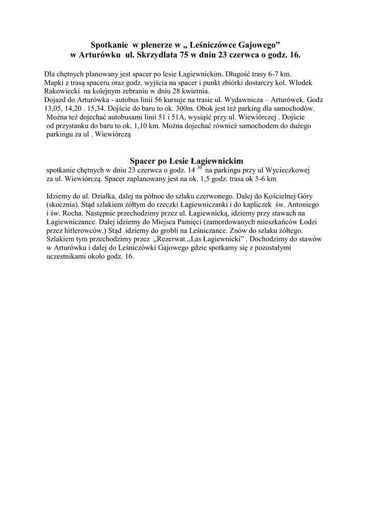 Spotkanie w plenerze w „ Leśniczówce Gajowego” w Arturówku ul. Skrzydlata 75 w dniu 23 czerwca o godz. 16. Dla chętnych planowany jest spacer po lesie Łagiewnickim. Długość trasy 6-7 km. Mapki z trasą spaceru oraz godz. wyjścia na spacer i punkt zbiórki dostarczy kol. Włodek Rakowiecki na kolejnym zebraniu w dniu 28 kwietnia. Dojazd do Arturówka - autobus linii 56 kursuje na trasie ul. Wydawnicza – Arturówek. Godz 13,05, 14,20 . 15,34. Dojście do baru to ok. 300m. Obok jest też parking dla samochodów. Można też dojechać autobusami linii 51 i 51A, wysiąść przy ul. Wiewiórczej . Dojście od przystanku do baru to ok. 1,10 km. Można dojechać również samochodem do dużego parkingu za ul . Wiewiórczą Spacer po Lesie Łagiewnickim spotkanie chętnych w dniu 23 czerwca o godz. 14 30 na parkingu przy ul Wycieczkowej za ul. Wiewiórczą. Spacer zaplanowany jest na ok. 1,5 godz. trasa ok 5-6 km Idziemy do ul. Działka, dalej na północ do szlaku czerwonego. Dalej do Kościelnej Góry (skocznia). Stąd szlakiem żółtym do rzeczki Łagiewniczanki i do kapliczek św. Antoniego i św. Rocha. Następnie przechodzimy przez ul. Łagiewnicką, idziemy przy stawach na Łagiewniczance. Dalej idziemy do Miejsca Pamięci (zamordowanych mieszkańców Łodzi przez hitlerowców.) Stąd idziemy do grobli na Leśniczance. Znów do szlaku żółtego. Szlakiem tym przechodzimy przez „Rezerwat „Las Łagiewnicki” . Dochodzimy do stawów w Arturówku i dalej do Leśniczówki Gajowego gdzie spotkamy się z pozostałymi uczestnikami około godz. 16.