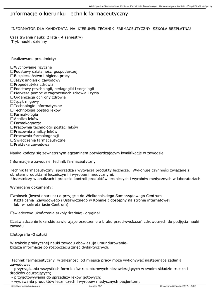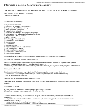 Wielkopolskie Samorzadowe Centrum Kształcenia Zawodowego i Ustawicznego w Koninie - Zespół Szkół Medyczny Informacje o kierunku Technik farmaceutyczny INFORMATOR DLA KANDYDATA NA KIERUNEK TECHNIK FARMACEUTYCZNY SZKOŁA BEZPŁATNA! Czas trwania nauki: 2 lata ( 4 semestry) Tryb nauki: dzienny Realizowane przedmioty: » » » » » » » » » » » » » » » » » » » Wychowanie fizyczne Podstawy działalności gospodarczej Bezpieczeństwo i higiena pracy Język angielski zawodowy Propedeutyka zdrowia Podstawy psychologii, pedagogiki i socjologii Pierwsza pomoc w zagrożeniach zdrowia i życia Organizacja ochrony zdrowia Język migowy Technologie informatyczne Technologia postaci leków Farmakologia Analiza leków Farmakognozja Pracownia technologii postaci leków Pracownia analizy leków Pracownia farmakognozji Świadczenia farmaceutyczne Praktyka zawodowa Nauka kończy się zewnętrznym egzaminem potwierdzającym kwalifikacje w zawodzie Informacje o zawodzie technik farmaceutyczny Technik farmaceutyczny sporządza i wytwarza produkty lecznicze. Wykonuje czynności związane z obrotem produktami leczniczymi i wyrobami medycznymi. Uczestniczy w analizach i procesie kontroli produktów leczniczych i wyrobów medycznych w laboratoriach. Wymagane dokumenty: » wniosek (kwestionariusz) o przyjęcie do Wielkopolskiego Samorządowego Centrum Kształcenia Zawodowego i Ustawicznego w Koninie ( dostępny na stronie internetowej lub w sekretariacie Centrum) » świadectwo ukończenia szkoły średniej- oryginał » zaświadczenie lekarskie zawierające orzeczenie o braku przeciwwskazań zdrowotnych do podjęcia nauki zawodu » fotografie -3 sztuki W trakcie praktycznej nauki zawodu obowiązuje umundurowaniebliższe informacje po rozpoczęciu zajęć dydaktycznych. Technik farmaceutyczny w zależności od miejsca pracy może wykonywać następujące zadania zawodowe: - przyrządzania wszystkich form leków recepturowych niezawierających w swoim składzie trucizn i środków odurzających; - przygotowywania do sprzedaży leków gotowych; - wydawania produktów leczniczych i wyrobów medycznych pacjentom; http://www.medyk.konin.pl Kreator PDF Utworzono 8 March, 2017, 18:02 Wielkopolskie Samorzadowe Centrum Kształcenia Zawodowego i Ustawicznego w Koninie - Zespół Szkół Medyczny - współuczestniczenia w prowadzeniu analiz laboratoryjnych; - organizowania i rozliczania pracy punktu aptecznego; - udział w nadzorowaniu procesów technologicznych produkcji leków w przemyśle farmaceutycznym; Technik farmaceutyczny może podjąć pracę w aptekach, punktach aptecznych, sklepach zielarskomedycznych, hurtowniach farmaceutycznych. Miejscem pracy techników farmaceutycznych są także zakłady przemysłu farmaceutycznego oraz laboratoria chemiczne, naukowo-badawcze. Absolwenci znajdują również zatrudnienie w stacjach sanitarno-epidemiologicznych oraz w inspekcji farmaceutycznej. http://www.medyk.konin.pl Kreator PDF Utworzono 8 March, 2017, 18:02
