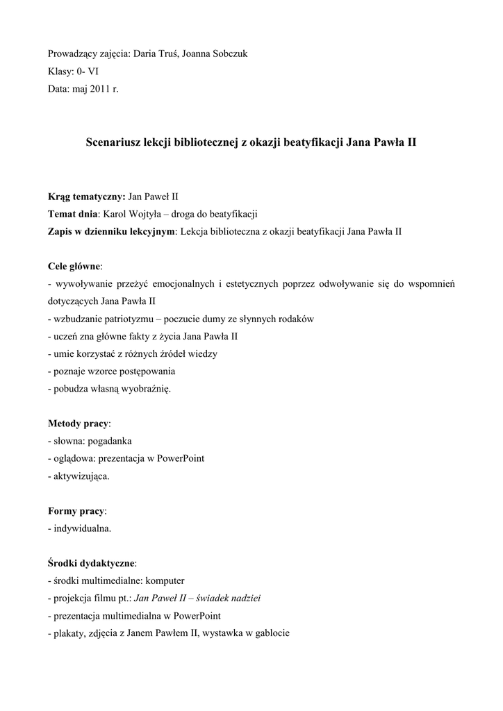 Scenariusz lekcji bibliotecznej z okazji beatyfikacji Jana Pawła II