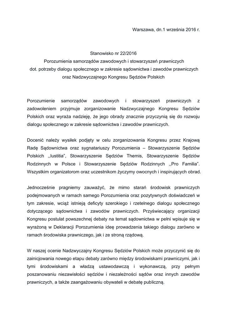 Warszawa, dn.1 września 2016 r. Stanowisko nr 22/2016 Porozumienia samorządów zawodowych i stowarzyszeń prawniczych dot. potrzeby dialogu społecznego w zakresie sądownictwa i zawodów prawniczych oraz Nadzwyczajnego Kongresu Sędziów Polskich Porozumienie samorządów zawodowych i stowarzyszeń prawniczych z zadowoleniem przyjmuje zorganizowanie Nadzwyczajnego Kongresu Sędziów Polskich oraz wyraża nadzieję, że jego obrady znacznie przyczynią się do rozwoju dialogu społecznego w zakresie sądownictwa i zawodów prawniczych. Docenić należy wysiłek podjęty w celu zorganizowania Kongresu przez Krajową Radę Sądownictwa oraz sygnatariuszy Porozumienia – Stowarzyszenie Sędziów Polskich ,,Iustitia”, Stowarzyszenie Sędziów Themis, Stowarzyszenie Sędziów Rodzinnych w Polsce i Stowarzyszenie Sędziów Rodzinnych ,,Pro Familia”. Wszystkim organizatorom oraz uczestnikom życzymy owocnych i inspirujących obrad. Jednocześnie pragniemy zauważyć, że mimo starań środowisk prawniczych podejmowanych w ramach samego Porozumienia oraz pozytywnych doświadczeń w tym zakresie, wciąż istnieją deficyty szerokiego i rzetelnego dialogu społecznego dotyczącego sądownictwa i zawodów prawniczych. Przyświecający organizacji Kongresu postulat powszechnej debaty na temat sądownictwa w pełni wpisuje się w wyrażoną w Deklaracji Porozumienia ideę prowadzenia takiego dialogu zarówno w ramach środowiska prawniczego, jak i ze stroną rządową. W naszej ocenie Nadzwyczajny Kongresu Sędziów Polskich może przyczynić się do zainicjowania nowego etapu debaty zarówno między środowiskami prawniczymi, jak i tymi środowiskami a władzą ustawodawczą i wykonawczą, przy pełnym poszanowaniu niezawisłości sędziów i niezależności sądów oraz innych zawodów prawniczych, a także zaangażowaniu obywateli w debatę publiczną. Bardzo niepokojąca jest wyraźnie odczuwalna atmosfera narastającego konfliktu w przestrzeni publicznej. Powinna być ona zastąpiona rzeczowym dialogiem, który uważamy za nieodzowny element demokracji. Apelujemy do wszystkich zainteresowanych o podjęcie dialogu na gruncie obowiązującego prawa. W szczególności uznajemy, że poprawa sytuacji w szeroko ujmowanym wymiarze sprawiedliwości wymaga spójnych reform, które jednakże muszą mieć oparcie w poprzedzającym je dialogu społecznym. Jego skuteczności dowodzą m.in. dotychczasowe doświadczenia Porozumienia, którego sygnatariusze oraz uczestnicy działającego przy nim Forum Obywatelskiego z powodzeniem wypracowywali wspólne stanowiska w wielu istotnych dla sądownictwa i zawodów prawniczych kwestiach, które początkowo pozostawały sporne. Były one także przedmiotem rozmów z Ministerstwem Sprawiedliwości, które zadeklarowało otwartość oraz przekazanie części postulatów do dalszych prac. W związku z tym Porozumienie deklaruje wsparcie dla wszelkich inicjatyw, które mogą przyczynić się do rozwoju dialogu społecznego w zakresie sądownictwa i zawodów prawniczych. Stawiamy sobie za cel jego pełną instytucjonalizację tak, aby stał się on standardowym rozwiązaniem w procesie legislacyjnym. Wyrażamy zatem również gotowość poszerzenia i wykorzystania wypracowanego już mechanizmu prowadzenia dyskusji i rozwiązywania sporów. Przewodniczący Porozumienia /-/ SSO prof. UŚ dr hab. Krystian Markiewicz Sekretarz Porozumienia /-/ Dr Paweł Skuczyński