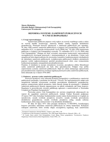 Marta Michalska Ośrodek Badań i Dokumentacji Unii Europejskiej Uniwersytet Wrocławski REFORMA SYSTEMU ZAMÓWIEŃ PUBLICZNYCH W UNII EUROPEJSKIEJ 1. Uwagi wprowadzające Zamówienia publiczne poprzez swój wpływ na rozwój wspólnego rynku a także na rozwój handlu światowego, stanowią bardzo istotny segment działalności gospodarczej. Potencjał korzyści płynących z zamówień publicznych jest ogromny. W roku 1990 wartość zamówień publicznych w krajach Unii Europejskiej wynosiła 595 miliardów ECU, co stanowiło równowartość 14,4% PKB Unii.1 W roku 1994 zamówienia publiczne w krajach Unii Europejskiej wynosiły 721 miliardów ECU (11,5% PKB całej Unii Europejskiej).2 Dlatego też dość wcześnie zauważono konieczność wprowadzenia szczegółowych rozwiązań prawnych i instytucjonalnych w tej dziedzinie. Celem tych uregulowań było doprowadzenie do stworzenia warunków konkurencyjności niezbędnych do udzielania zamówień publicznych, wydatkowania publicznych środków pieniężnych poprzez wybór najkorzystniejszej spośród przedstawionych ofert, oraz wzmocnienia konkurencji pomiędzy europejskimi przedsiębiorstwami. Pomimo, iż działania te zaczęto stosunkowo wcześnie, początkowe efekty liberalizacji rynku zamówień publicznych nie były zbyt optymistyczne. Podjęto więc próby usprawnienia systemu zamówień publicznych. Stąd też celem niniejszego opracowania jest przedstawienie stopniowej ewolucji regulacji prawnych rynku zamówień publicznych, która dokonała się w latach 1970-2003. 2. Podstawy prawne rynku zamówień publicznych Pierwsze dyrektywy oraz zalecenia Komisji Europejskiej w problematyce zamówień publicznych pochodzą z przełomu lat 60-tych i 70-tych. Do najważniejszych zadań tych uregulowań należało rozszerzenie swobody prowadzenia działalności gospodarczej, poprzez ustanowienie takich przepisów, które dawały dostęp do przetargów i składania zamówień publicznych firmom zagranicznym, na takich warunkach, jak firmy krajowe. Regulacje te przewidywały również publikację ogłoszeń o zamówieniach w Dzienniku Urzędowym Wspólnot Europejskich.3 Pierwotne prawo Unii Europejskiej nie zawiera uregulowań odnoszących się wprost do zagadnień zamówień publicznych. Jednak Traktat Rzymski podpisany 25 marca 1957 roku formułuje fundamentalne zasady (zakaz dyskryminacji ze względu na narodowość, zasada swobody przepływu towarów, zasada swobody prowadzenia działalności gospodarczej, zasada swobody przepływu usług, zasada ochrony konkurencji), które mają zastosowanie w tej dziedzinie działalności. W dniu 26 lipca 1971 roku przyjęto dyrektywę 71/305/EWG, koordynującą krajowe procedury udzielania zamówień publicznych na roboty budowlane. Kolejnym rodzajem zamówień, które zostały objęte szczegółową regulacją, były zamówienia 1 European Commission, Internal Market, volume 3, july 1994, s. 86. Commission of the European Communities, The 1996 Single Market Reviev, Brussels 1996, s. 45. 3 D. Lasok, Zarys prawa Unii Europejskiej, Cześć druga, Prawo gospodarcze, Towarzystwo Naukowe Organizacji i Kierownictwa Dom Organizatora, Toruń 1998, s. 61. 2 publiczne na dostawy, dyrektywa 77/62/EWG – 26 grudnia 1976 rok. Pierwsza dyrektywa miała zostać wdrożona 1 stycznia 1973 roku. Druga 24 czerwca 1978. Celem wprowadzenia tych dyrektyw było usunięcie barier i przeszkód w procedurach zamówień publicznych, przy jednoczesnym wprowadzeniu jednolitego na terenie Wspólnoty systemu udzielania zamówień. 4 W roku 1985 została opublikowana przez Komisję Europejską „Biała księga na temat wdrażania rynku wewnętrznego”, która bardzo krytycznie oceniała stan implementacji dyrektyw. W największym stopniu krytykowano stosowane przez państwa członkowskie takie praktyki jak min.: • stawianie specjalnych wymagań technicznych i finansowych oferentom zagranicznym, • dzielenie zamówień na części o wartościach mniejszych od progów przewidzianych w dyrektywach, • stosowanie szczegółowych specyfikacji technicznych faworyzujących lokalnych dostawców.5 Tak więc zamówienia publiczne nadal stanowiły jedną z barier, które skutecznie ograniczały swobodną wymianę gospodarczą wewnątrz Wspólnoty. Dlatego też, w koncepcji stworzenia jednolitego rynku europejskiego wśród najważniejszych celów umieszczono wdrożenie takich wspólnotowych regulacji dotyczących zamówień publicznych, które wyeliminowałby ostatecznie wszelkie bariery w udzielaniu zamówień utrudniające działanie mechanizmu konkurencji. W roku 1988 dokonano nowelizacji dyrektywy dotyczącej dostaw, dyrektywą 88/295/EWG, a dyrektywę dotyczącą robót budowlanych znowelizowano dyrektywą 89/440/EWG z 18 lipca 1989 roku. Zmiany te sprowadzały się między innymi do: • zmniejszenia zakresu wyłączeń, • zmiany warunków dotyczących stosowania procedury negocjacyjnej (uznano ją za procedurę stosowaną tylko w wyjątkowych okolicznościach), • zwiększenia minimalnego czasu składania ofert, • rozszerzenia obowiązków stosowania europejskich standardów technicznych, • podniesienia progu z 1 miliona ECU do 5 milionów ECU w przypadku robót budowlanych.6 18 czerwca 1992 roku przyjęto kolejną, nową dyrektywę dotyczącą zamówień publicznych - dyrektywę dotyczącą zamówień publicznych na usługi (dyrektywa 92/50/EWG koordynująca procedury udzielania zamówień publicznych na usługi). 14 czerwca 1993 roku przyjęto jednolity tekst dyrektywy 93/37/EWG koordynującej procedury udzielania zamówień publicznych na roboty budowlane, która zastąpiła dyrektywy 71/305/EWG i 93/37/EWG. Analogicznie postąpiono w przypadku dyrektyw dotyczących zamówień publicznych na dostawy, zastępując dyrektywy 77/62/EWG i 88/295/EWG, jednolitym tekstem dyrektywy 93/36/EWG koordynującej procedury udzielania zamówień publicznych na dostawy.7 4 M. Lemke, Zamówienia publiczne w Unii Europejskiej, Dyrektyw