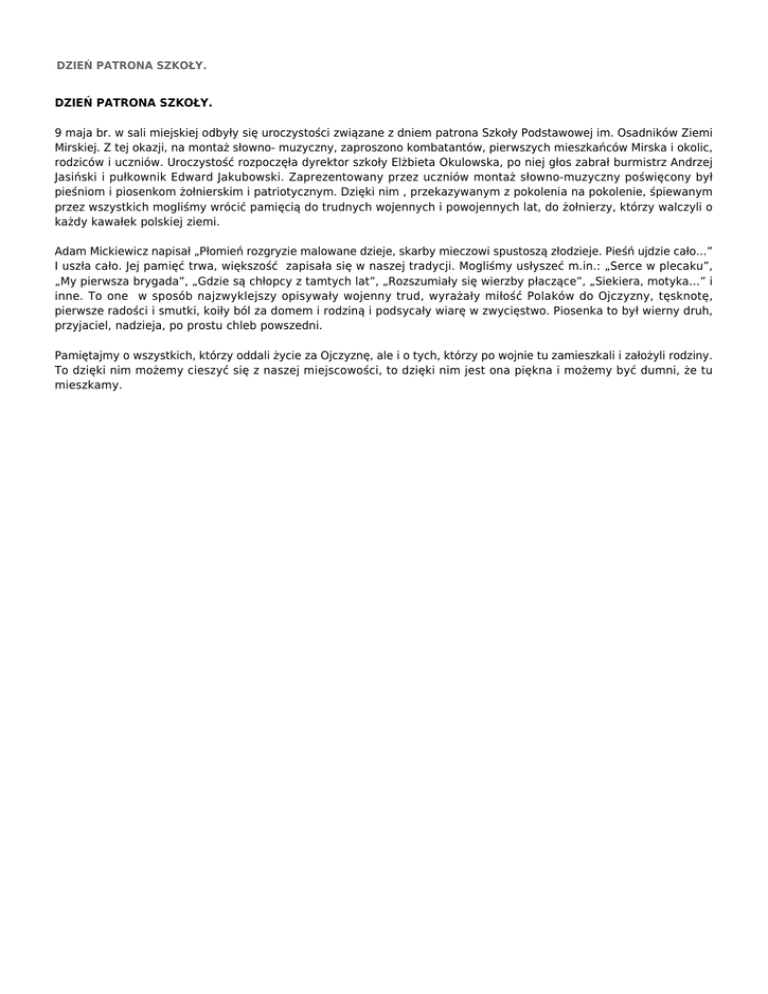 DZIEŃ PATRONA SZKOŁY. DZIEŃ PATRONA SZKOŁY. 9 maja br. w sali miejskiej odbyły się uroczystości związane z dniem patrona Szkoły Podstawowej im. Osadników Ziemi Mirskiej. Z tej okazji, na montaż słowno- muzyczny, zaproszono kombatantów, pierwszych mieszkańców Mirska i okolic, rodziców i uczniów. Uroczystość rozpoczęła dyrektor szkoły Elżbieta Okulowska, po niej głos zabrał burmistrz Andrzej Jasiński i pułkownik Edward Jakubowski. Zaprezentowany przez uczniów montaż słowno-muzyczny poświęcony był pieśniom i piosenkom żołnierskim i patriotycznym. Dzięki nim , przekazywanym z pokolenia na pokolenie, śpiewanym przez wszystkich mogliśmy wrócić pamięcią do trudnych wojennych i powojennych lat, do żołnierzy, którzy walczyli o każdy kawałek polskiej ziemi. Adam Mickiewicz napisał „Płomień rozgryzie malowane dzieje, skarby mieczowi spustoszą złodzieje. Pieśń ujdzie cało…” I uszła cało. Jej pamięć trwa, większość zapisała się w naszej tradycji. Mogliśmy usłyszeć m.in.: „Serce w plecaku”, „My pierwsza brygada”, „Gdzie są chłopcy z tamtych lat”, „Rozszumiały się wierzby płaczące”, „Siekiera, motyka…” i inne. To one w sposób najzwyklejszy opisywały wojenny trud, wyrażały miłość Polaków do Ojczyzny, tęsknotę, pierwsze radości i smutki, koiły ból za domem i rodziną i podsycały wiarę w zwycięstwo. Piosenka to był wierny druh, przyjaciel, nadzieja, po prostu chleb powszedni. Pamiętajmy o wszystkich, którzy oddali życie za Ojczyznę, ale i o tych, którzy po wojnie tu zamieszkali i założyli rodziny. To dzięki nim możemy cieszyć się z naszej miejscowości, to dzięki nim jest ona piękna i możemy być dumni, że tu mieszkamy.