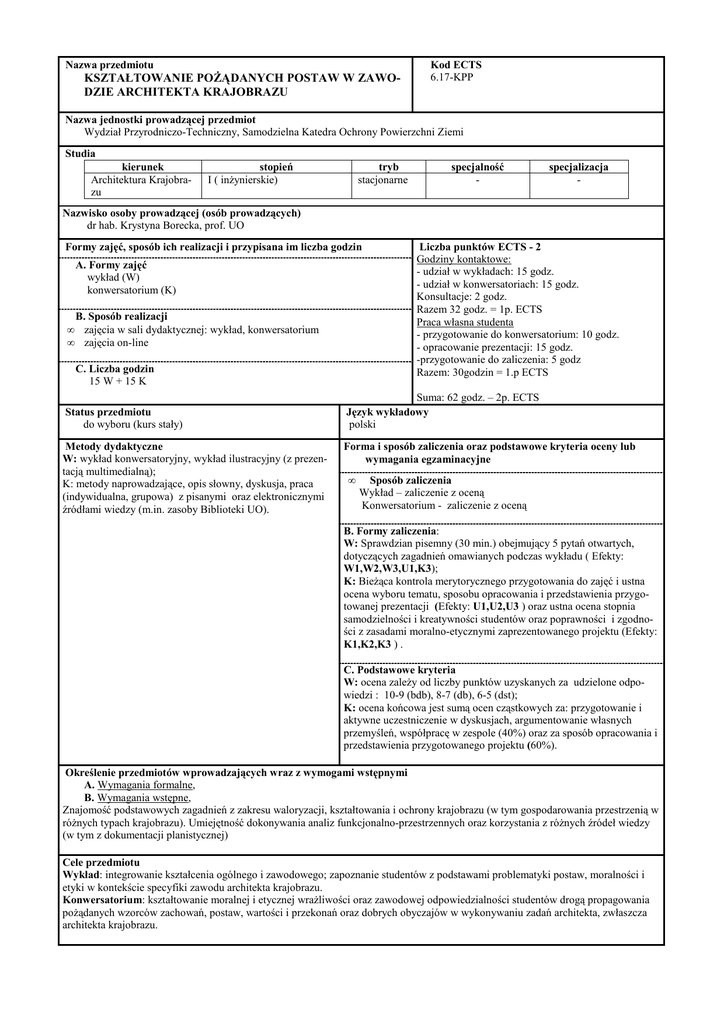 Nazwa przedmiotu KSZTAŁTOWANIE POŻĄDANYCH POSTAW W ZAWODZIE ARCHITEKTA KRAJOBRAZU Kod ECTS 6.17-KPP Nazwa jednostki prowadzącej przedmiot Wydział Przyrodniczo-Techniczny, Samodzielna Katedra Ochrony Powierzchni Ziemi Studia kierunek Architektura Krajobrazu stopień I ( inżynierskie) tryb stacjonarne specjalność - specjalizacja - Nazwisko osoby prowadzącej (osób prowadzących) dr hab. Krystyna Borecka, prof. UO Formy zajęć, sposób ich realizacji i przypisana im liczba godzin A. Formy zajęć wykład (W) konwersatorium (K) • • B. Sposób realizacji zajęcia w sali dydaktycznej: wykład, konwersatorium zajęcia on-line C. Liczba godzin 15 W + 15 K Status przedmiotu do wyboru (kurs stały) Metody dydaktyczne W: wykład konwersatoryjny, wykład ilustracyjny (z prezentacją multimedialną); K: metody naprowadzające, opis słowny, dyskusja, praca (indywidualna, grupowa) z pisanymi oraz elektronicznymi źródłami wiedzy (m.in. zasoby Biblioteki UO). Liczba punktów ECTS - 2 Godziny kontaktowe: - udział w wykładach: 15 godz. - udział w konwersatoriach: 15 godz. Konsultacje: 2 godz. Razem 32 godz. = 1p. ECTS Praca własna studenta - przygotowanie do konwersatorium: 10 godz. - opracowanie prezentacji: 15 godz. -przygotowanie do zaliczenia: 5 godz Razem: 30godzin = 1.p ECTS Suma: 62 godz. – 2p. ECTS Język wykładowy polski Forma i sposób zaliczenia oraz podstawowe kryteria oceny lub wymagania egzaminacyjne • Sposób zaliczenia Wykład – zaliczenie z oceną Konwersatorium - zaliczenie z oceną B. Formy zaliczenia: W: Sprawdzian pisemny (30 min.) obejmujący 5 pytań otwartych, dotyczących zagadnień omawianych podczas wykładu ( Efekty: W1,W2,W3,U1,K3); K: Bieżąca kontrola merytorycznego przygotowania do zajęć i ustna ocena wyboru tematu, sposobu opracowania i przedstawienia przygotowanej prezentacji (Efekty: U1,U2,U3 ) oraz ustna ocena stopnia samodzielności i kreatywności studentów oraz poprawności i zgodności z zasadami moralno-etycznymi zaprezentowanego projektu (Efekty: K1,K2,K3 ) . C. Podstawowe kryteria W: ocena zależy od liczby punktów uzyskanych za udzielone odpowiedzi : 10-9 (bdb), 8-7 (db), 6-5 (dst); K: ocena końcowa jest sumą ocen cząstkowych za: przygotowanie i aktywne uczestniczenie w dyskusjach, argumentowanie własnych przemyśleń, współpracę w zespole (40%) oraz za sposób opracowania i przedstawienia przygotowanego projektu (60%). Określenie przedmiotów wprowadzających wraz z wymogami wstępnymi A. Wymagania formalne, B. Wymagania wstępne, Znajomość podstawowych zagadnień z zakresu waloryzacji, kształtowania i ochrony krajobrazu (w tym gospodarowania przestrzenią w różnych typach krajobrazu). Umiejętność dokonywania analiz funkcjonalno-przestrzennych oraz korzystania z różnych źródeł wiedzy (w tym z dokumentacji planistycznej) Cele przedmiotu Wykład: integrowanie kształcenia ogólnego i zawodowego; zapoznanie studentów z podstawami problematyki postaw, moralności i etyki w kontekście specyfiki zawodu architekta krajobrazu. Konwersatorium: kształtowanie moralnej i etycznej wrażliwości oraz zawodowej odpowiedzialności studentów drogą propagowania pożądanych wzorców zachowań, postaw, wartości i przekonań oraz dobrych obyczajów w wykonywaniu zadań architekta, zwłaszcza architekta krajobrazu. Treści programowe A. Problematyka wykładu Właściwości systemu krajobrazowego – holistyczna koncepcja przyrody. Związki przyczynowo-skutkowe w środowisku, typowe relacje: człowiek – społeczeństwo – przyroda – twórca (architekt krajobrazu). Ograniczenia w gospodarowaniu przestrzenią, podstawowe przyczyny konfliktów przestrzennych. Klasyfikacja i charakterystyka wybranych typów postaw. Postawa jednostki a postawa grupowa, postawy wobec norm społecznych i prawnych. Moralność a etyka, norma moralna a prawo, etyka zawodowa. Dynamika postaw, dymorfizm wartości. Znaczenie projektowania małych form architektury krajobrazu w kategoriach wartości etycznych oraz w tworzeniu dziedzictwa kulturowego. Morale architekta. Zasady etyczne i dobre obyczaje w zawodzie architekta krajobrazu. B. Problematyka konwersatorium Charakterystyka walorów przyrodniczych ikulturowych oraz zasad kształtowania i ochrony krajobrazu obszarów zurbanizowanych i niezurbanizowanych. Diagnozowanie i prognozowanie przyczyn i skutków sytuacji konfliktowych, w tym zagrożeń dla zdrowia i życia człowieka oraz mienia i środowiska, związanych z wykonywaniem zawodu architekta krajobrazu. Wymiana poglądów na temat wybranych typów postaw (personalnych, rzeczowych, ideowych, indywidualnych i zbiorowych, ogólnych i specyficznych) oraz tzw. podwójnej moralności. Analizowanie i interpretowanie treści tekstów i opracowań instruktażowych, dotyczących postępowania architekta krajobrazu oraz etyki zawodowej. Określanie zakresu odpowiedzialności w wykonywaniu zawodu architekta krajobrazu w stosunku do zleceniodawcy (klienta), partnerów procesu inwestycyjnego oraz kolegów w zespole. Prezentowanie i wzajemne ocenianie samodzielnie opracowanych planów i propozycji realizacji przykładowych obiektów architektury krajobrazu, wymagających negocjowania porozumień społecznych. Wykaz literatury A. Literatura wymagana do ostatecznego zaliczenia zajęć (zdania egzaminu): A.1. wykorzystywana podczas zajęć 1. Czartoszewski J.W.(red.) 2001: Konflikty społeczno-ekologiczne, PWN, Warszawa 2. Kucza-Kuczyński K. 2004: Zawód architekt, o etyce zawodowej i moralności architektury, Politechnika Warszawska, Warszawa 3. Malec T. 2012: Projektowanie architektoniczne. Wprowadzenie do zawodu architekta, Helion, Warszawa 4. Marody M. 2000: Postawa (w) Encyklopedia socjologii, T.3, Oficyna Naukowa, Warszawa 5. Skalski J. 2007: Analiza percepcyjna krajobrazu jako działanie twórcze inicjujące proces projektowania, SGGW, Warszawa 6. Wolski K., Szymura M., Gerula A. 2005: Wybrane zagadnienia z ekologii krajobrazu, Uniwersytet Przyrodni