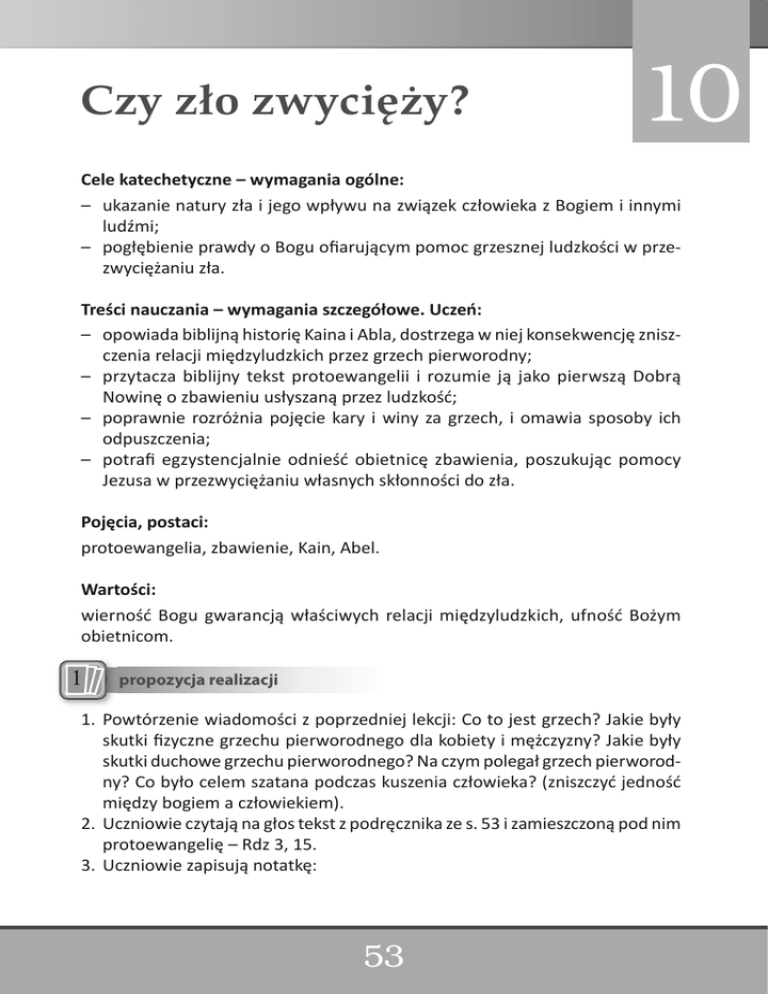 Czy zło zwycięży? 10 Cele katechetyczne – wymagania ogólne: – ukazanie natury zła i jego wpływu na związek człowieka z Bogiem i innymi ludźmi; – pogłębienie prawdy o Bogu ofiarującym pomoc grzesznej ludzkości w przezwyciężaniu zła. Treści nauczania – wymagania szczegółowe. Uczeń: – opowiada biblijną historię Kaina i Abla, dostrzega w niej konsekwencję zniszczenia relacji międzyludzkich przez grzech pierworodny; – przytacza biblijny tekst protoewangelii i rozumie ją jako pierwszą Dobrą Nowinę o zbawieniu usłyszaną przez ludzkość; – poprawnie rozróżnia pojęcie kary i winy za grzech, i omawia sposoby ich odpuszczenia; – potrafi egzystencjalnie odnieść obietnicę zbawienia, poszukując pomocy Jezusa w przezwyciężaniu własnych skłonności do zła. Pojęcia, postaci: protoewangelia, zbawienie, Kain, Abel. Wartości: wierność Bogu gwarancją właściwych relacji międzyludzkich, ufność Bożym obietnicom. realizacji: propozycja realizacji 1Propozycja 1. Powtórzenie wiadomości z poprzedniej lekcji: Co to jest grzech? Jakie były skutki fizyczne grzechu pierworodnego dla kobiety i mężczyzny? Jakie były skutki duchowe grzechu pierworodnego? Na czym polegał grzech pierworodny? Co było celem szatana podczas kuszenia człowieka? (zniszczyć jedność między bogiem a człowiekiem). 2. Uczniowie czytają na głos tekst z podręcznika ze s. 53 i zamieszczoną pod nim protoewangelię – Rdz 3, 15. 3. Uczniowie zapisują notatkę: 53 Bóg po grzechu pierworodnym daje człowiekowi obietnicę zbawienia, że ponownie go z sobą pojedna. To pojednanie dokona się przez potomka niewiasty, która zmiażdży głowę węża (Rdz 3,15). Ten fragment nazywany jest protoewangelią, czyli pierwszą Dobrą Nowiną o zbawieniu. 5. Nauczyciel mówi, że po wygnaniu z raju grzech jeszcze bardziej się rozpowszechnił na świecie, mowa jest o tym w kolejnym rozdziale Rdz. Nauczyciel rozdaje Pismo Święte lub ksero Rdz 4, 1–16. 6. Uczniowie zapoznają się z Rdz 4, 1–16 (Historia Kaina i Abla) i odpowiadają pisemnie w zeszytach na następujące pytania: Co było motywem działania Kaina? Jaką karę poniósł Kain? W jaki sposób Bóg ochronił Kaina przed śmiercią? 7. Nauczyciel podsumowuje pracę uczniów i dyktuje notatkę do zeszytu: Każdy grzech prowadzi do następnego grzechu, zło rodzi zło, każdy grzech pociąga za sobą skutki, którymi są wina i kara. Przez potomka biblijnej niewiasty, którym jest Jezus Chrystus, przez Jego mękę i śmierć na krzyżu zostaliśmy uniewinnieni od naszych grzechów, które są odpuszczane w sakramencie pojednania. Kara natomiast zostaje do odpokutowania albo tu na ziemi poprzez dobre uczynki, naprawienie szkody, cierpienia, choroby, albo po śmierci w czyśćcu. Kara za grzechy jest darowana poprzez odpusty udzielane w różnych okolicznościach. Modlitwa: Akt żalu. Polecenie 1. lub 2. z podręcznika ucznia. Korelacja z innymi przedmiotami: język polski – biblijny motyw Kaina i Abla literaturze, motywy mesjańskie w utworach literackich; wychowanie do życia w rodzinie – sakrament pokuty jako ułatwienie przezwyciężania konfliktów w rodzinie; wiedza o społeczeństwie – postawa człowieka wierzącego w działalności społecznej – gotowość do korygowania swojego postępowania; plastyka – analiza i interpretacja tekstów kultury opartych na motywach biblijnych, motyw Kaina i Abla. 54