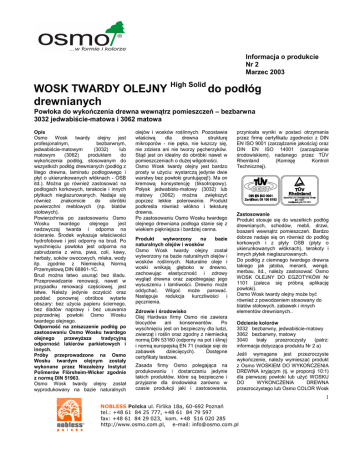 Informacja o produkcie Nr 2 Marzec 2003 WOSK TWARDY OLEJNY High Solid do podłóg drewnianych Powłoka do wykończenia drewna wewnątrz pomieszczeń – bezbarwna 3032 jedwabiście-matowa i 3062 matowa Opis Osmo Wosk twardy olejny jest profesjonalnym, bezbarwnym, jedwabiście-matowym (3032) lub matowym (3062) produktem do wykończenia podłóg, stosowanym do wszystkich podłóg drewnianych (podłóg z litego drewna, laminatu podłogowego i płyt o ukierunkowanych włóknach - OSB itd.). MoŜna go równieŜ zastosować na podłogach korkowych, terakocie i innych płytkach nieglazurowanych. Nadaje się równieŜ znakomicie do obróbki powierzchni meblowych (np. blatów stołowych). Powierzchnia po zastosowaniu Osmo Wosku twardego olejnego jest nadzwyczaj twarda i odporna na ścieranie. Środek wykazuje właściwości hydrofobowe i jest odporny na brud. Po wyschnięciu powłoka jest odporna na zabrudzenia z wina, piwa, coli, kawy, herbaty, soków owocowych, mleka, wody itp. zgodnie z Niemiecką Normą Przemysłową DIN 68861-1C. Brud moŜna łatwo usunąć bez śladu. Przeprowadzanie renowacji, nawet w przypadku renowacji częściowej, jest łatwe. NaleŜy jedynie oczyścić oraz poddać ponownej obróbce wytarte obszary: bez uŜycia papieru ściernego, bez śladów naprawy i bez usuwania poprzedniej powłoki Osmo Wosku twardego olejnego. Odporność na zniszczenie podłóg po zastosowaniu Osmo Wosku twardego olejnego przewyŜsza tradycyjną odporność lakierów parkietowych i innych. Próby przeprowadzone na Osmo Wosku twardym olejnym zostały wykonane przez NiezaleŜny Instytut Polimerów Flörsheim-Wicker zgodnie z normą DIN 51963. Osmo Wosk twardy olejny został wyprodukowany na bazie naturalnych olejów i wosków roślinnych. Pozostawia właściwą dla drewna strukturę mikroporów - nie pęka, nie łuszczy się, nie zdziera ani nie tworzy pęcherzyków. Stąd jest on idealny do obróbki nawet w pomieszczeniach o duŜej wilgotności. Osmo Wosk twardy olejny jest bardzo prosty w uŜyciu: wystarczą jedynie dwie warstwy bez powłoki gruntującej!). Ma on kremową konsystencję (tiksotropowy). Połysk jedwabisto-matowy (3032) lub matowy (3062) moŜna zwiększyć poprzez lekkie polerowanie. Produkt podkreśla równieŜ włókno i teksturę drewna. Po zastosowaniu Osmo Wosku twardego olejnego drewniana podłoga stanie się z wiekiem piękniejsza i bardziej cenna. Produkt wytworzony na bazie naturalnych olejów i wosków Osmo Wosk twardy olejny został wytworzony na bazie naturalnych olejów i wosków roślinnych. Naturalne oleje i woski wnikają głęboko w drewno, zachowując elastyczność i zdrowy wygląd drewna oraz zapobiegając jego wysuszeniu i łamliwości. Drewno moŜe oddychać. Wilgoć moŜe parować. Następuje redukcja kurczliwości i pęcznienia. Zdrowie i środowisko Olej Hardwax firmy Osmo nie zawiera biocydów ani konserwantów. Po wyschnięciu jest on bezpieczny dla ludzi, zwierząt i roślin oraz zgodny z niemiecką normą DIN 53160 (odporny na pot i ślinę) i normą europejską EN 71 (nadaje sięi do zabawek dziecięcych). Dostępne certyfikaty testowe. Zasada firmy Osmo polegająca na produkowaniu i dostarczaniu jedynie takich produktów, które są bezpieczne i przyjazne dla środowiska zarówno w czasie produkcji jaki i zastosowania, przyniosła wyniki w postaci otrzymania przez firmę certyfikatu zgodności z DIN EN ISO 9001 (zarządzanie jakością) oraz DIN EN ISO 14001 (zarządzanie środowiskiem), nadanego przez TÜV Rheinland (Komisję Kontroli Technicznej). Zastosowanie Produkt stosuje się do wszelkich podłóg drewnianych, schodów, mebli, drzwi, boazerii wewnątrz pomieszczeń. Bardzo dobrze nadaje się on równieŜ do podłóg korkowych i z płyty OSB (płyty o ukierunkowanych włóknach), terakoty i innych płytek nieglazurowanych. Do podłóg z ciemnego twardego drewna takiego jak jatoba, meranti, wengé, merbau, itd., naleŜy zastosować Osmo WOSK OLEJNY DO EGZOTYKÓW Nr 1101 (zaleca się próbną aplikację powłoki). Osmo Wosk twardy olejny moŜe być równieŜ z powodzeniem stosowany do blatów stołowych, zabawek i innych elementów drewnianych.. Odcienie kolorów 3032 bezbarwny, jedwabiście-matowy 3062 bezbarwny, matowy 3040 biały przezroczysty (patrz: informacja dotycząca produktu Nr 2 a) Jeśli wymagane jest przezroczyste wykończenie, naleŜy wymieszać produkt z Osmo WOSKIEM DO WYKOŃCZENIA DREWNA kryjącym (tj. w proporcji 10:1) dla pierwszej powłoki lub uŜyć WOSKU DO WYKONCZENIA DREWNA przezroczystego lub Osmo COLOR Wosk 1 NOBLESS Polska ul. Firlika 18a, 60-692 Poznań tel.: +48 61 84 25 777, +48 61 84 79 597 fax: +48 61 84 29 023, kom. +48 516 020 285 http://www.osmo.com.pl, e-mail: [email protected] Informacja o produkcie Nr 2 Marzec 2003 WOSK TWARDY OLEJNY High Solid do podłóg drewnianych Powłoka do wykończenia drewna wewnątrz pomieszczeń – bezbarwna 3032 jedwabiście-matowa i 3062 matowa twardy olejny biały podkład. NałoŜyć warstwę wykończeniową bezbarwnego Osmo Wosku twardego olejnego. Wymagana ilość warstw 2 (bez powłoki gruntującej) Renowacja: 1 warstwa Korozja W pomieszczeniach o duŜej wilgotności zaleca się stosowanie cynkowanych i nieoksydujących gwoździ i mocowań. Wydajność krycia 1 l = ok. 12 m², dwie warstwy =ok. 20 m², jedna warstwa Pojemność opakowań 0.375 l; 0.75 l; 2.5 l; 10 l; 25 l Wymagane zapytanie większych objętości. w Tolerancja innych środków Osmo Wosk twardy olejny moŜna nakładać na wszystkie woski firmy Osmo na Osmo PROTEKTOR DREWNA i BEZBARWNY OLEJ DO WYKOŃCZENIA DREWNA. przypadku Przygotowanie Powierzchnia drewna, korka lub płyty OSB musi być czysta i sucha (o maksymalnej zawartości wilgoci 20%). Niewielkie wgniecenia i otwory w drewnie moŜna wypełnić produktem Osmo Pastą do drewna. Produkt nakładać jedynie na powierzchnię pozbawioną śladów zmroŜenia. Starsze powłoki nie zatykające porów naleŜy oczyścić lub delikatnie wyrównać papierem ścierny