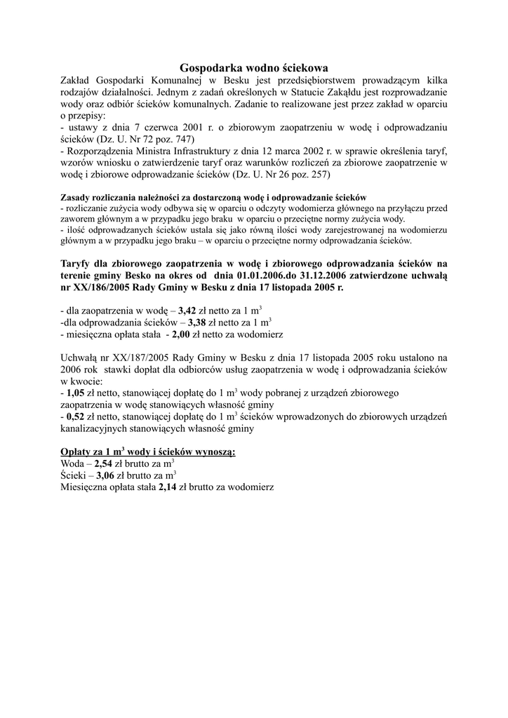 Gospodarka wodno ściekowa Zakład Gospodarki Komunalnej w Besku jest przedsiębiorstwem prowadzącym kilka rodzajów działalności. Jednym z zadań określonych w Statucie Zakąłdu jest rozprowadzanie wody oraz odbiór ścieków komunalnych. Zadanie to realizowane jest przez zakład w oparciu o przepisy: - ustawy z dnia 7 czerwca 2001 r. o zbiorowym zaopatrzeniu w wodę i odprowadzaniu ścieków (Dz. U. Nr 72 poz. 747) - Rozporządzenia Ministra Infrastruktury z dnia 12 marca 2002 r. w sprawie określenia taryf, wzorów wniosku o zatwierdzenie taryf oraz warunków rozliczeń za zbiorowe zaopatrzenie w wodę i zbiorowe odprowadzanie ścieków (Dz. U. Nr 26 poz. 257) Zasady rozliczania należności za dostarczoną wodę i odprowadzanie ścieków - rozliczanie zużycia wody odbywa się w oparciu o odczyty wodomierza głównego na przyłączu przed zaworem głównym a w przypadku jego braku w oparciu o przeciętne normy zużycia wody. - ilość odprowadzanych ścieków ustala się jako równą ilości wody zarejestrowanej na wodomierzu głównym a w przypadku jego braku – w oparciu o przeciętne normy odprowadzania ścieków. Taryfy dla zbiorowego zaopatrzenia w wodę i zbiorowego odprowadzania ścieków na terenie gminy Besko na okres od dnia 01.01.2006.do 31.12.2006 zatwierdzone uchwałą nr XX/186/2005 Rady Gminy w Besku z dnia 17 listopada 2005 r. - dla zaopatrzenia w wodę – 3,42 zł netto za 1 m3 -dla odprowadzania ścieków – 3,38 zł netto za 1 m3 - miesięczna opłata stała - 2,00 zł netto za wodomierz Uchwałą nr XX/187/2005 Rady Gminy w Besku z dnia 17 listopada 2005 roku ustalono na 2006 rok stawki dopłat dla odbiorców usług zaopatrzenia w wodę i odprowadzania ścieków w kwocie: - 1,05 zł netto, stanowiącej dopłatę do 1 m3 wody pobranej z urządzeń zbiorowego zaopatrzenia w wodę stanowiących własność gminy - 0,52 zł netto, stanowiącej dopłatę do 1 m3 ścieków wprowadzonych do zbiorowych urządzeń kanalizacyjnych stanowiących własność gminy Opłaty za 1 m3 wody i ścieków wynoszą: Woda – 2,54 zł brutto za m3 Ścieki – 3,06 zł brutto za m3 Miesięczna opłata stała 2,14 zł brutto za wodomierz