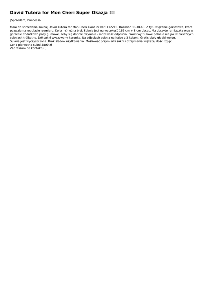 David Tutera for Mon Cheri Super Okazja !!! [Sprzedam] Princessa Mam do sprzedania suknię David Tutera for Mon Cheri Tiana nr kat: 112215. Rozmiar 36-38-40. Z tyłu wiązanie gorsetowe, które pozwala na regulację rozmiaru. Kolor -śnieżna biel. Suknia jest na wysokość 166 cm + 8 cm obcas. Ma doszyte ramiączka oraz w gorsecie dodatkowo pasy gumowe, żeby się dobrze trzymała - możliwość odprucia. Warstwy tiulowe pełne a nie jak w niektórych sukniach trójkątne. Dół sukni wyszywany koronką. Na zdjęciach suknia na halce z 3 kołami. Gratis biały gładki welon. Suknia jest wyczyszczona. Brak śladów użytkowania. Możliwość przymiarki sukni i otrzymania większej ilości zdjęć. Cena pierwotna sukni 3800 zł Zapraszam do kontaktu :) Informacje dodatkowe Ilość 1 Stan Używany Rozmiar 34-36-40 Adres ogłoszenia http://http.todoslubu.pl/david-tutera-for-mon-cheri-super-okazja-,o736 Kontakt Mail: [email protected] Telefon: 790577779 Lokalizacja Dzielnica - Dębniki, Kraków Małopolskie (Polska) Ogłoszenie dodano: 2017-01-23 13:17:38 Ogłoszenie wygasa: 2026-10-23 13:17:38 Powered by TCPDF (www.tcpdf.org)